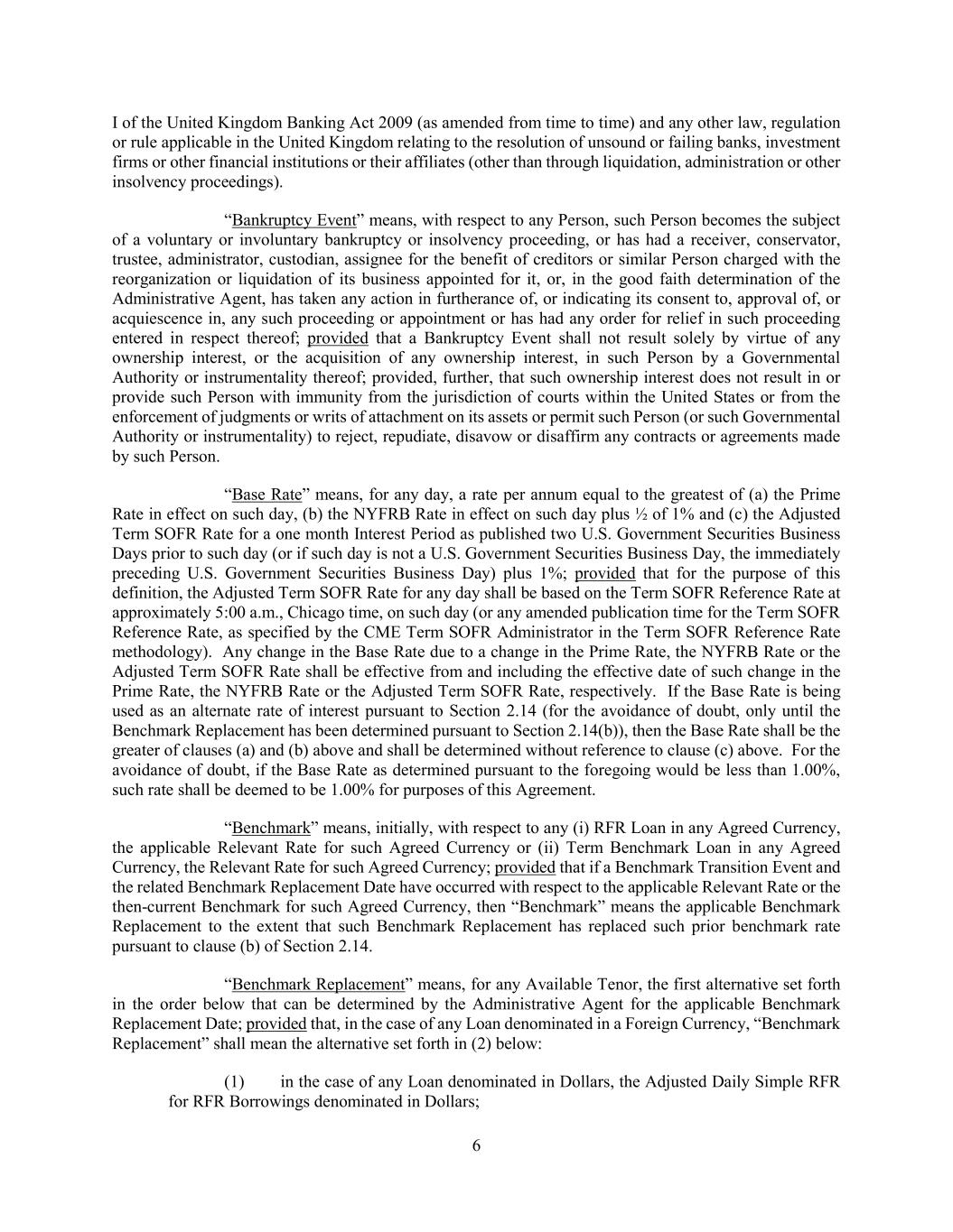 6 I of the United Kingdom Banking Act 2009 (as amended from time to time) and any other law, regulation or rule applicable in the United Kingdom relating to the resolution of unsound or failing banks, investment firms or other financial institutions or their affiliates (other than through liquidation, administration or other insolvency proceedings). “Bankruptcy Event” means, with respect to any Person, such Person becomes the subject of a voluntary or involuntary bankruptcy or insolvency proceeding, or has had a receiver, conservator, trustee, administrator, custodian, assignee for the benefit of creditors or similar Person charged with the reorganization or liquidation of its business appointed for it, or, in the good faith determination of the Administrative Agent, has taken any action in furtherance of, or indicating its consent to, approval of, or acquiescence in, any such proceeding or appointment or has had any order for relief in such proceeding entered in respect thereof; provided that a Bankruptcy Event shall not result solely by virtue of any ownership interest, or the acquisition of any ownership interest, in such Person by a Governmental Authority or instrumentality thereof; provided, further, that such ownership interest does not result in or provide such Person with immunity from the jurisdiction of courts within the United States or from the enforcement of judgments or writs of attachment on its assets or permit such Person (or such Governmental Authority or instrumentality) to reject, repudiate, disavow or disaffirm any contracts or agreements made by such Person. “Base Rate” means, for any day, a rate per annum equal to the greatest of (a) the Prime Rate in effect on such day, (b) the NYFRB Rate in effect on such day plus ½ of 1% and (c) the Adjusted Term SOFR Rate for a one month Interest Period as published two U.S. Government Securities Business Days prior to such day (or if such day is not a U.S. Government Securities Business Day, the immediately preceding U.S. Government Securities Business Day) plus 1%; provided that for the purpose of this definition, the Adjusted Term SOFR Rate for any day shall be based on the Term SOFR Reference Rate at approximately 5:00 a.m., Chicago time, on such day (or any amended publication time for the Term SOFR Reference Rate, as specified by the CME Term SOFR Administrator in the Term SOFR Reference Rate methodology). Any change in the Base Rate due to a change in the Prime Rate, the NYFRB Rate or the Adjusted Term SOFR Rate shall be effective from and including the effective date of such change in the Prime Rate, the NYFRB Rate or the Adjusted Term SOFR Rate, respectively. If the Base Rate is being used as an alternate rate of interest pursuant to Section 2.14 (for the avoidance of doubt, only until the Benchmark Replacement has been determined pursuant to Section 2.14(b)), then the Base Rate shall be the greater of clauses (a) and (b) above and shall be determined without reference to clause (c) above. For the avoidance of doubt, if the Base Rate as determined pursuant to the foregoing would be less than 1.00%, such rate shall be deemed to be 1.00% for purposes of this Agreement. “Benchmark” means, initially, with respect to any (i) RFR Loan in any Agreed Currency, the applicable Relevant Rate for such Agreed Currency or (ii) Term Benchmark Loan in any Agreed Currency, the Relevant Rate for such Agreed Currency; provided that if a Benchmark Transition Event and the related Benchmark Replacement Date have occurred with respect to the applicable Relevant Rate or the then-current Benchmark for such Agreed Currency, then “Benchmark” means the applicable Benchmark Replacement to the extent that such Benchmark Replacement has replaced such prior benchmark rate pursuant to clause (b) of Section 2.14. “Benchmark Replacement” means, for any Available Tenor, the first alternative set forth in the order below that can be determined by the Administrative Agent for the applicable Benchmark Replacement Date; provided that, in the case of any Loan denominated in a Foreign Currency, “Benchmark Replacement” shall mean the alternative set forth in (2) below: (1) in the case of any Loan denominated in Dollars, the Adjusted Daily Simple RFR for RFR Borrowings denominated in Dollars;