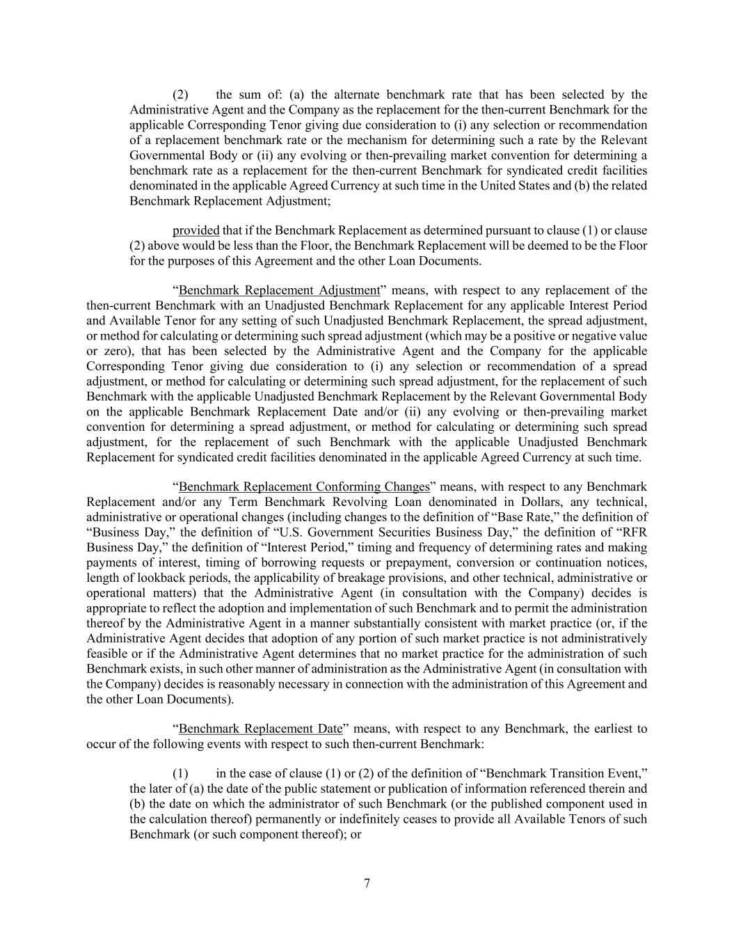 7 (2) the sum of: (a) the alternate benchmark rate that has been selected by the Administrative Agent and the Company as the replacement for the then-current Benchmark for the applicable Corresponding Tenor giving due consideration to (i) any selection or recommendation of a replacement benchmark rate or the mechanism for determining such a rate by the Relevant Governmental Body or (ii) any evolving or then-prevailing market convention for determining a benchmark rate as a replacement for the then-current Benchmark for syndicated credit facilities denominated in the applicable Agreed Currency at such time in the United States and (b) the related Benchmark Replacement Adjustment; provided that if the Benchmark Replacement as determined pursuant to clause (1) or clause (2) above would be less than the Floor, the Benchmark Replacement will be deemed to be the Floor for the purposes of this Agreement and the other Loan Documents. “Benchmark Replacement Adjustment” means, with respect to any replacement of the then-current Benchmark with an Unadjusted Benchmark Replacement for any applicable Interest Period and Available Tenor for any setting of such Unadjusted Benchmark Replacement, the spread adjustment, or method for calculating or determining such spread adjustment (which may be a positive or negative value or zero), that has been selected by the Administrative Agent and the Company for the applicable Corresponding Tenor giving due consideration to (i) any selection or recommendation of a spread adjustment, or method for calculating or determining such spread adjustment, for the replacement of such Benchmark with the applicable Unadjusted Benchmark Replacement by the Relevant Governmental Body on the applicable Benchmark Replacement Date and/or (ii) any evolving or then-prevailing market convention for determining a spread adjustment, or method for calculating or determining such spread adjustment, for the replacement of such Benchmark with the applicable Unadjusted Benchmark Replacement for syndicated credit facilities denominated in the applicable Agreed Currency at such time. “Benchmark Replacement Conforming Changes” means, with respect to any Benchmark Replacement and/or any Term Benchmark Revolving Loan denominated in Dollars, any technical, administrative or operational changes (including changes to the definition of “Base Rate,” the definition of “Business Day,” the definition of “U.S. Government Securities Business Day,” the definition of “RFR Business Day,” the definition of “Interest Period,” timing and frequency of determining rates and making payments of interest, timing of borrowing requests or prepayment, conversion or continuation notices, length of lookback periods, the applicability of breakage provisions, and other technical, administrative or operational matters) that the Administrative Agent (in consultation with the Company) decides is appropriate to reflect the adoption and implementation of such Benchmark and to permit the administration thereof by the Administrative Agent in a manner substantially consistent with market practice (or, if the Administrative Agent decides that adoption of any portion of such market practice is not administratively feasible or if the Administrative Agent determines that no market practice for the administration of such Benchmark exists, in such other manner of administration as the Administrative Agent (in consultation with the Company) decides is reasonably necessary in connection with the administration of this Agreement and the other Loan Documents). “Benchmark Replacement Date” means, with respect to any Benchmark, the earliest to occur of the following events with respect to such then-current Benchmark: (1) in the case of clause (1) or (2) of the definition of “Benchmark Transition Event,” the later of (a) the date of the public statement or publication of information referenced therein and (b) the date on which the administrator of such Benchmark (or the published component used in the calculation thereof) permanently or indefinitely ceases to provide all Available Tenors of such Benchmark (or such component thereof); or