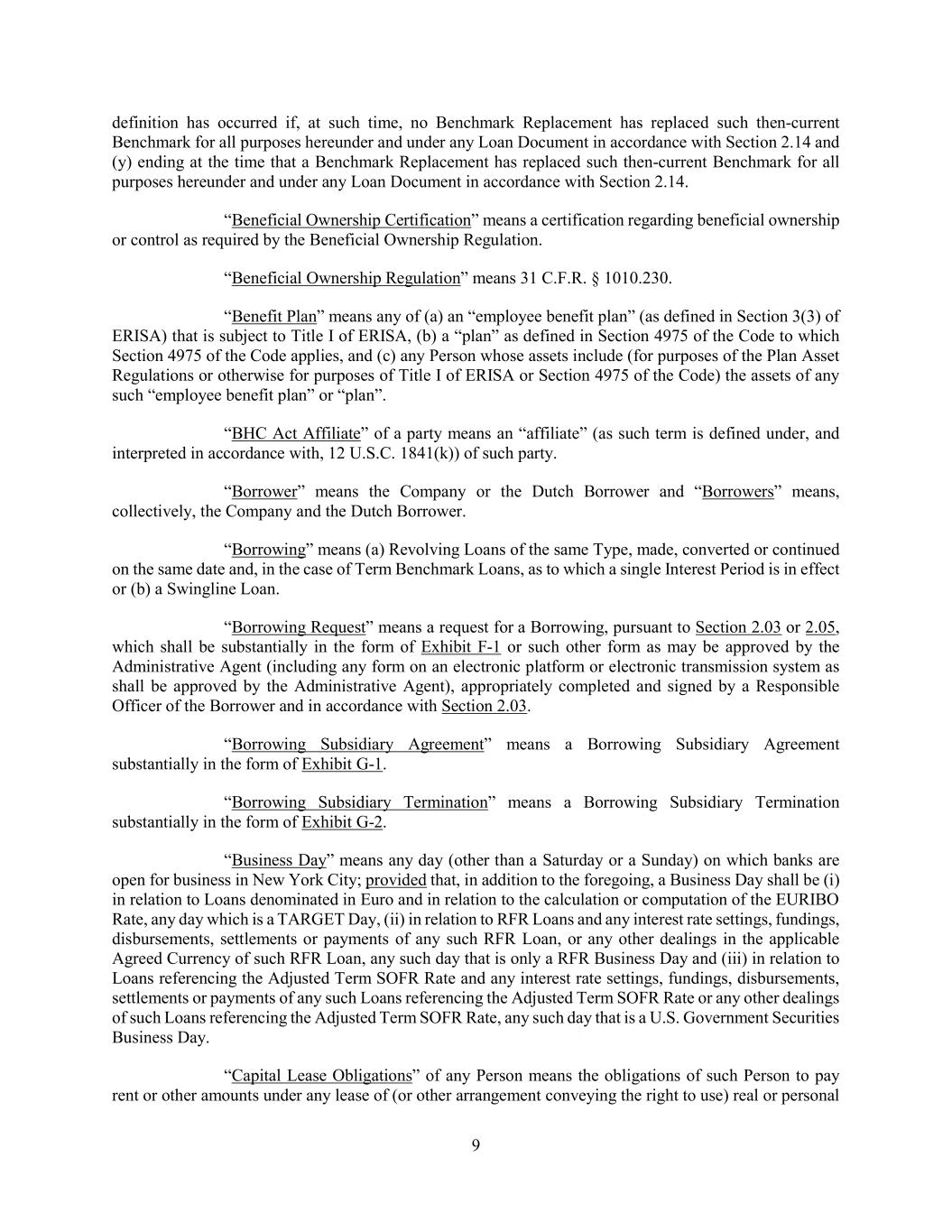 9 definition has occurred if, at such time, no Benchmark Replacement has replaced such then-current Benchmark for all purposes hereunder and under any Loan Document in accordance with Section 2.14 and (y) ending at the time that a Benchmark Replacement has replaced such then-current Benchmark for all purposes hereunder and under any Loan Document in accordance with Section 2.14. “Beneficial Ownership Certification” means a certification regarding beneficial ownership or control as required by the Beneficial Ownership Regulation. “Beneficial Ownership Regulation” means 31 C.F.R. § 1010.230. “Benefit Plan” means any of (a) an “employee benefit plan” (as defined in Section 3(3) of ERISA) that is subject to Title I of ERISA, (b) a “plan” as defined in Section 4975 of the Code to which Section 4975 of the Code applies, and (c) any Person whose assets include (for purposes of the Plan Asset Regulations or otherwise for purposes of Title I of ERISA or Section 4975 of the Code) the assets of any such “employee benefit plan” or “plan”. “BHC Act Affiliate” of a party means an “affiliate” (as such term is defined under, and interpreted in accordance with, 12 U.S.C. 1841(k)) of such party. “Borrower” means the Company or the Dutch Borrower and “Borrowers” means, collectively, the Company and the Dutch Borrower. “Borrowing” means (a) Revolving Loans of the same Type, made, converted or continued on the same date and, in the case of Term Benchmark Loans, as to which a single Interest Period is in effect or (b) a Swingline Loan. “Borrowing Request” means a request for a Borrowing, pursuant to Section 2.03 or 2.05, which shall be substantially in the form of Exhibit F-1 or such other form as may be approved by the Administrative Agent (including any form on an electronic platform or electronic transmission system as shall be approved by the Administrative Agent), appropriately completed and signed by a Responsible Officer of the Borrower and in accordance with Section 2.03. “Borrowing Subsidiary Agreement” means a Borrowing Subsidiary Agreement substantially in the form of Exhibit G-1. “Borrowing Subsidiary Termination” means a Borrowing Subsidiary Termination substantially in the form of Exhibit G-2. “Business Day” means any day (other than a Saturday or a Sunday) on which banks are open for business in New York City; provided that, in addition to the foregoing, a Business Day shall be (i) in relation to Loans denominated in Euro and in relation to the calculation or computation of the EURIBO Rate, any day which is a TARGET Day, (ii) in relation to RFR Loans and any interest rate settings, fundings, disbursements, settlements or payments of any such RFR Loan, or any other dealings in the applicable Agreed Currency of such RFR Loan, any such day that is only a RFR Business Day and (iii) in relation to Loans referencing the Adjusted Term SOFR Rate and any interest rate settings, fundings, disbursements, settlements or payments of any such Loans referencing the Adjusted Term SOFR Rate or any other dealings of such Loans referencing the Adjusted Term SOFR Rate, any such day that is a U.S. Government Securities Business Day. “Capital Lease Obligations” of any Person means the obligations of such Person to pay rent or other amounts under any lease of (or other arrangement conveying the right to use) real or personal