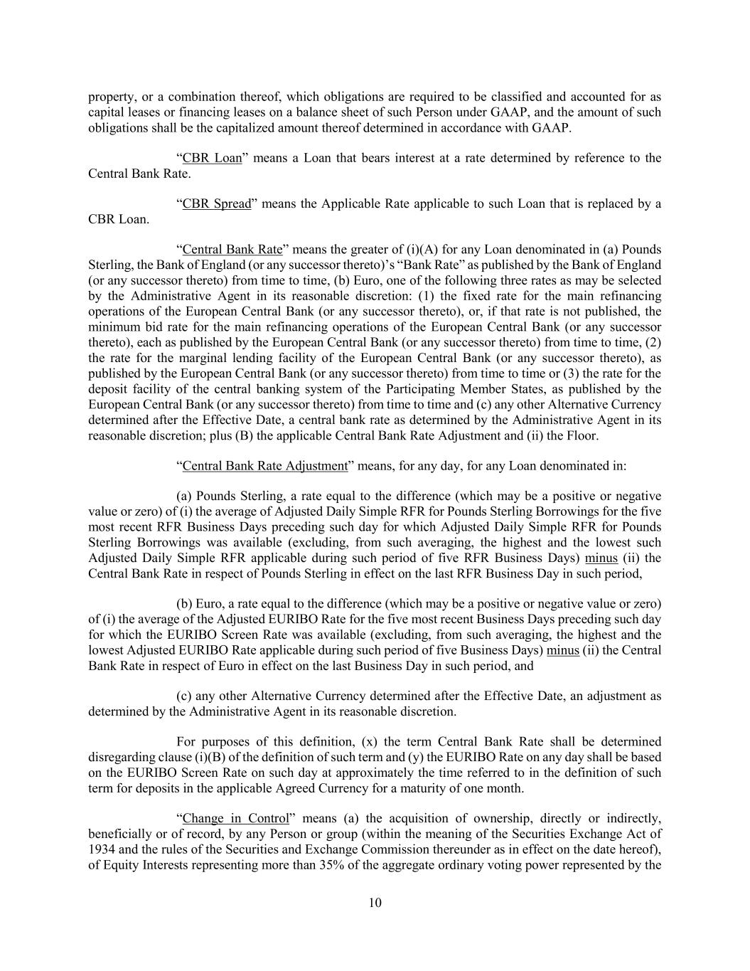 10 property, or a combination thereof, which obligations are required to be classified and accounted for as capital leases or financing leases on a balance sheet of such Person under GAAP, and the amount of such obligations shall be the capitalized amount thereof determined in accordance with GAAP. “CBR Loan” means a Loan that bears interest at a rate determined by reference to the Central Bank Rate. “CBR Spread” means the Applicable Rate applicable to such Loan that is replaced by a CBR Loan. “Central Bank Rate” means the greater of (i)(A) for any Loan denominated in (a) Pounds Sterling, the Bank of England (or any successor thereto)’s “Bank Rate” as published by the Bank of England (or any successor thereto) from time to time, (b) Euro, one of the following three rates as may be selected by the Administrative Agent in its reasonable discretion: (1) the fixed rate for the main refinancing operations of the European Central Bank (or any successor thereto), or, if that rate is not published, the minimum bid rate for the main refinancing operations of the European Central Bank (or any successor thereto), each as published by the European Central Bank (or any successor thereto) from time to time, (2) the rate for the marginal lending facility of the European Central Bank (or any successor thereto), as published by the European Central Bank (or any successor thereto) from time to time or (3) the rate for the deposit facility of the central banking system of the Participating Member States, as published by the European Central Bank (or any successor thereto) from time to time and (c) any other Alternative Currency determined after the Effective Date, a central bank rate as determined by the Administrative Agent in its reasonable discretion; plus (B) the applicable Central Bank Rate Adjustment and (ii) the Floor. “Central Bank Rate Adjustment” means, for any day, for any Loan denominated in: (a) Pounds Sterling, a rate equal to the difference (which may be a positive or negative value or zero) of (i) the average of Adjusted Daily Simple RFR for Pounds Sterling Borrowings for the five most recent RFR Business Days preceding such day for which Adjusted Daily Simple RFR for Pounds Sterling Borrowings was available (excluding, from such averaging, the highest and the lowest such Adjusted Daily Simple RFR applicable during such period of five RFR Business Days) minus (ii) the Central Bank Rate in respect of Pounds Sterling in effect on the last RFR Business Day in such period, (b) Euro, a rate equal to the difference (which may be a positive or negative value or zero) of (i) the average of the Adjusted EURIBO Rate for the five most recent Business Days preceding such day for which the EURIBO Screen Rate was available (excluding, from such averaging, the highest and the lowest Adjusted EURIBO Rate applicable during such period of five Business Days) minus (ii) the Central Bank Rate in respect of Euro in effect on the last Business Day in such period, and (c) any other Alternative Currency determined after the Effective Date, an adjustment as determined by the Administrative Agent in its reasonable discretion. For purposes of this definition, (x) the term Central Bank Rate shall be determined disregarding clause (i)(B) of the definition of such term and (y) the EURIBO Rate on any day shall be based on the EURIBO Screen Rate on such day at approximately the time referred to in the definition of such term for deposits in the applicable Agreed Currency for a maturity of one month. “Change in Control” means (a) the acquisition of ownership, directly or indirectly, beneficially or of record, by any Person or group (within the meaning of the Securities Exchange Act of 1934 and the rules of the Securities and Exchange Commission thereunder as in effect on the date hereof), of Equity Interests representing more than 35% of the aggregate ordinary voting power represented by the