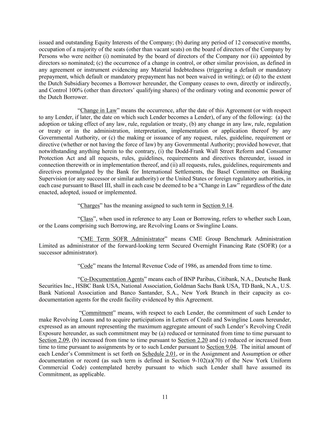 11 issued and outstanding Equity Interests of the Company; (b) during any period of 12 consecutive months, occupation of a majority of the seats (other than vacant seats) on the board of directors of the Company by Persons who were neither (i) nominated by the board of directors of the Company nor (ii) appointed by directors so nominated; (c) the occurrence of a change in control, or other similar provision, as defined in any agreement or instrument evidencing any Material Indebtedness (triggering a default or mandatory prepayment, which default or mandatory prepayment has not been waived in writing); or (d) to the extent the Dutch Subsidiary becomes a Borrower hereunder, the Company ceases to own, directly or indirectly, and Control 100% (other than directors’ qualifying shares) of the ordinary voting and economic power of the Dutch Borrower. “Change in Law” means the occurrence, after the date of this Agreement (or with respect to any Lender, if later, the date on which such Lender becomes a Lender), of any of the following: (a) the adoption or taking effect of any law, rule, regulation or treaty, (b) any change in any law, rule, regulation or treaty or in the administration, interpretation, implementation or application thereof by any Governmental Authority, or (c) the making or issuance of any request, rules, guideline, requirement or directive (whether or not having the force of law) by any Governmental Authority; provided however, that notwithstanding anything herein to the contrary, (i) the Dodd-Frank Wall Street Reform and Consumer Protection Act and all requests, rules, guidelines, requirements and directives thereunder, issued in connection therewith or in implementation thereof, and (ii) all requests, rules, guidelines, requirements and directives promulgated by the Bank for International Settlements, the Basel Committee on Banking Supervision (or any successor or similar authority) or the United States or foreign regulatory authorities, in each case pursuant to Basel III, shall in each case be deemed to be a “Change in Law” regardless of the date enacted, adopted, issued or implemented. “Charges” has the meaning assigned to such term in Section 9.14. “Class”, when used in reference to any Loan or Borrowing, refers to whether such Loan, or the Loans comprising such Borrowing, are Revolving Loans or Swingline Loans. “CME Term SOFR Administrator” means CME Group Benchmark Administration Limited as administrator of the forward-looking term Secured Overnight Financing Rate (SOFR) (or a successor administrator). “Code” means the Internal Revenue Code of 1986, as amended from time to time. “Co-Documentation Agents” means each of BNP Paribas, Citibank, N.A., Deutsche Bank Securities Inc., HSBC Bank USA, National Association, Goldman Sachs Bank USA, TD Bank, N.A., U.S. Bank National Association and Banco Santander, S.A., New York Branch in their capacity as co- documentation agents for the credit facility evidenced by this Agreement. “Commitment” means, with respect to each Lender, the commitment of such Lender to make Revolving Loans and to acquire participations in Letters of Credit and Swingline Loans hereunder, expressed as an amount representing the maximum aggregate amount of such Lender’s Revolving Credit Exposure hereunder, as such commitment may be (a) reduced or terminated from time to time pursuant to Section 2.09, (b) increased from time to time pursuant to Section 2.20 and (c) reduced or increased from time to time pursuant to assignments by or to such Lender pursuant to Section 9.04. The initial amount of each Lender’s Commitment is set forth on Schedule 2.01, or in the Assignment and Assumption or other documentation or record (as such term is defined in Section 9-102(a)(70) of the New York Uniform Commercial Code) contemplated hereby pursuant to which such Lender shall have assumed its Commitment, as applicable.