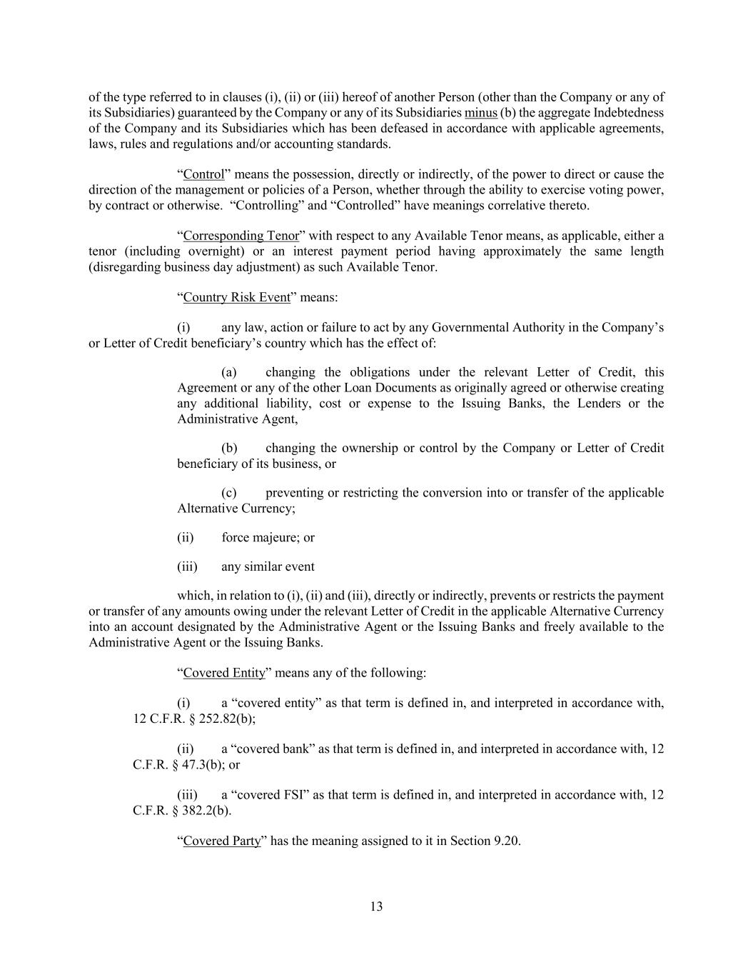 13 of the type referred to in clauses (i), (ii) or (iii) hereof of another Person (other than the Company or any of its Subsidiaries) guaranteed by the Company or any of its Subsidiaries minus (b) the aggregate Indebtedness of the Company and its Subsidiaries which has been defeased in accordance with applicable agreements, laws, rules and regulations and/or accounting standards. “Control” means the possession, directly or indirectly, of the power to direct or cause the direction of the management or policies of a Person, whether through the ability to exercise voting power, by contract or otherwise. “Controlling” and “Controlled” have meanings correlative thereto. “Corresponding Tenor” with respect to any Available Tenor means, as applicable, either a tenor (including overnight) or an interest payment period having approximately the same length (disregarding business day adjustment) as such Available Tenor. “Country Risk Event” means: (i) any law, action or failure to act by any Governmental Authority in the Company’s or Letter of Credit beneficiary’s country which has the effect of: (a) changing the obligations under the relevant Letter of Credit, this Agreement or any of the other Loan Documents as originally agreed or otherwise creating any additional liability, cost or expense to the Issuing Banks, the Lenders or the Administrative Agent, (b) changing the ownership or control by the Company or Letter of Credit beneficiary of its business, or (c) preventing or restricting the conversion into or transfer of the applicable Alternative Currency; (ii) force majeure; or (iii) any similar event which, in relation to (i), (ii) and (iii), directly or indirectly, prevents or restricts the payment or transfer of any amounts owing under the relevant Letter of Credit in the applicable Alternative Currency into an account designated by the Administrative Agent or the Issuing Banks and freely available to the Administrative Agent or the Issuing Banks. “Covered Entity” means any of the following: (i) a “covered entity” as that term is defined in, and interpreted in accordance with, 12 C.F.R. § 252.82(b); (ii) a “covered bank” as that term is defined in, and interpreted in accordance with, 12 C.F.R. § 47.3(b); or (iii) a “covered FSI” as that term is defined in, and interpreted in accordance with, 12 C.F.R. § 382.2(b). “Covered Party” has the meaning assigned to it in Section 9.20.