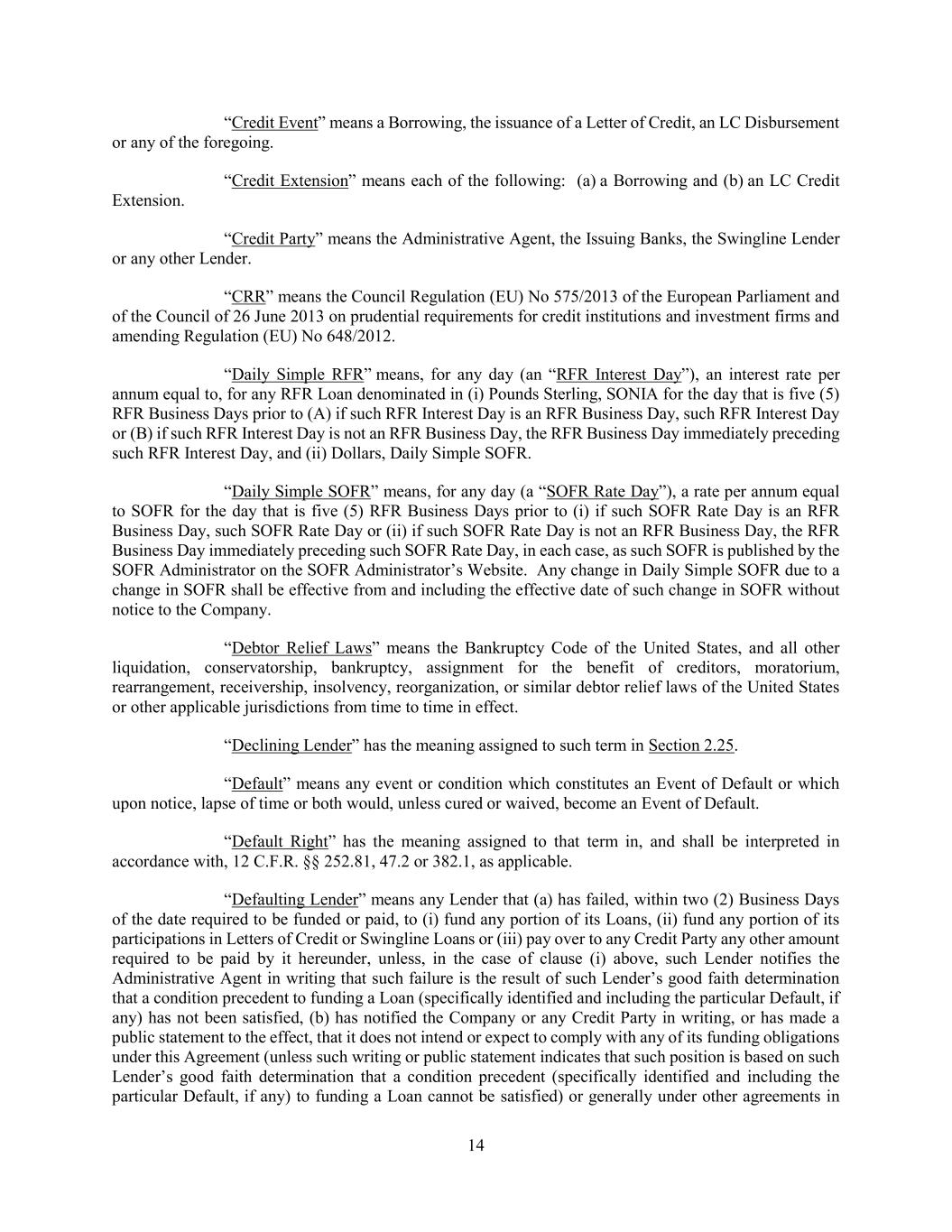 14 “Credit Event” means a Borrowing, the issuance of a Letter of Credit, an LC Disbursement or any of the foregoing. “Credit Extension” means each of the following: (a) a Borrowing and (b) an LC Credit Extension. “Credit Party” means the Administrative Agent, the Issuing Banks, the Swingline Lender or any other Lender. “CRR” means the Council Regulation (EU) No 575/2013 of the European Parliament and of the Council of 26 June 2013 on prudential requirements for credit institutions and investment firms and amending Regulation (EU) No 648/2012. “Daily Simple RFR” means, for any day (an “RFR Interest Day”), an interest rate per annum equal to, for any RFR Loan denominated in (i) Pounds Sterling, SONIA for the day that is five (5) RFR Business Days prior to (A) if such RFR Interest Day is an RFR Business Day, such RFR Interest Day or (B) if such RFR Interest Day is not an RFR Business Day, the RFR Business Day immediately preceding such RFR Interest Day, and (ii) Dollars, Daily Simple SOFR. “Daily Simple SOFR” means, for any day (a “SOFR Rate Day”), a rate per annum equal to SOFR for the day that is five (5) RFR Business Days prior to (i) if such SOFR Rate Day is an RFR Business Day, such SOFR Rate Day or (ii) if such SOFR Rate Day is not an RFR Business Day, the RFR Business Day immediately preceding such SOFR Rate Day, in each case, as such SOFR is published by the SOFR Administrator on the SOFR Administrator’s Website. Any change in Daily Simple SOFR due to a change in SOFR shall be effective from and including the effective date of such change in SOFR without notice to the Company. “Debtor Relief Laws” means the Bankruptcy Code of the United States, and all other liquidation, conservatorship, bankruptcy, assignment for the benefit of creditors, moratorium, rearrangement, receivership, insolvency, reorganization, or similar debtor relief laws of the United States or other applicable jurisdictions from time to time in effect. “Declining Lender” has the meaning assigned to such term in Section 2.25. “Default” means any event or condition which constitutes an Event of Default or which upon notice, lapse of time or both would, unless cured or waived, become an Event of Default. “Default Right” has the meaning assigned to that term in, and shall be interpreted in accordance with, 12 C.F.R. §§ 252.81, 47.2 or 382.1, as applicable. “Defaulting Lender” means any Lender that (a) has failed, within two (2) Business Days of the date required to be funded or paid, to (i) fund any portion of its Loans, (ii) fund any portion of its participations in Letters of Credit or Swingline Loans or (iii) pay over to any Credit Party any other amount required to be paid by it hereunder, unless, in the case of clause (i) above, such Lender notifies the Administrative Agent in writing that such failure is the result of such Lender’s good faith determination that a condition precedent to funding a Loan (specifically identified and including the particular Default, if any) has not been satisfied, (b) has notified the Company or any Credit Party in writing, or has made a public statement to the effect, that it does not intend or expect to comply with any of its funding obligations under this Agreement (unless such writing or public statement indicates that such position is based on such Lender’s good faith determination that a condition precedent (specifically identified and including the particular Default, if any) to funding a Loan cannot be satisfied) or generally under other agreements in
