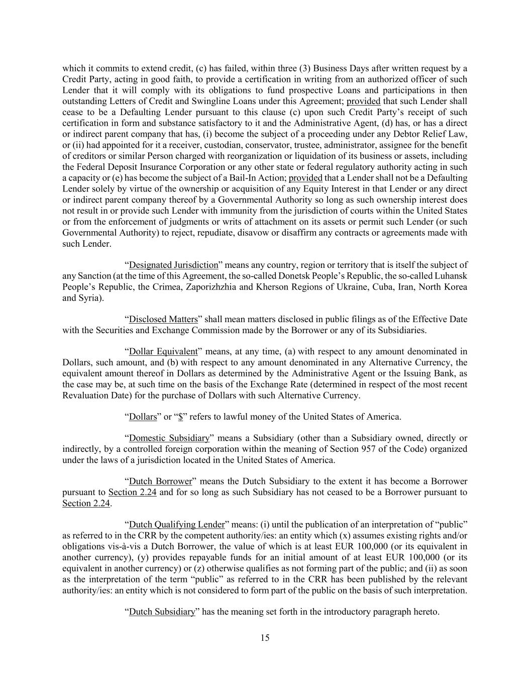 15 which it commits to extend credit, (c) has failed, within three (3) Business Days after written request by a Credit Party, acting in good faith, to provide a certification in writing from an authorized officer of such Lender that it will comply with its obligations to fund prospective Loans and participations in then outstanding Letters of Credit and Swingline Loans under this Agreement; provided that such Lender shall cease to be a Defaulting Lender pursuant to this clause (c) upon such Credit Party’s receipt of such certification in form and substance satisfactory to it and the Administrative Agent, (d) has, or has a direct or indirect parent company that has, (i) become the subject of a proceeding under any Debtor Relief Law, or (ii) had appointed for it a receiver, custodian, conservator, trustee, administrator, assignee for the benefit of creditors or similar Person charged with reorganization or liquidation of its business or assets, including the Federal Deposit Insurance Corporation or any other state or federal regulatory authority acting in such a capacity or (e) has become the subject of a Bail-In Action; provided that a Lender shall not be a Defaulting Lender solely by virtue of the ownership or acquisition of any Equity Interest in that Lender or any direct or indirect parent company thereof by a Governmental Authority so long as such ownership interest does not result in or provide such Lender with immunity from the jurisdiction of courts within the United States or from the enforcement of judgments or writs of attachment on its assets or permit such Lender (or such Governmental Authority) to reject, repudiate, disavow or disaffirm any contracts or agreements made with such Lender. “Designated Jurisdiction” means any country, region or territory that is itself the subject of any Sanction (at the time of this Agreement, the so-called Donetsk People’s Republic, the so-called Luhansk People’s Republic, the Crimea, Zaporizhzhia and Kherson Regions of Ukraine, Cuba, Iran, North Korea and Syria). “Disclosed Matters” shall mean matters disclosed in public filings as of the Effective Date with the Securities and Exchange Commission made by the Borrower or any of its Subsidiaries. “Dollar Equivalent” means, at any time, (a) with respect to any amount denominated in Dollars, such amount, and (b) with respect to any amount denominated in any Alternative Currency, the equivalent amount thereof in Dollars as determined by the Administrative Agent or the Issuing Bank, as the case may be, at such time on the basis of the Exchange Rate (determined in respect of the most recent Revaluation Date) for the purchase of Dollars with such Alternative Currency. “Dollars” or “$” refers to lawful money of the United States of America. “Domestic Subsidiary” means a Subsidiary (other than a Subsidiary owned, directly or indirectly, by a controlled foreign corporation within the meaning of Section 957 of the Code) organized under the laws of a jurisdiction located in the United States of America. “Dutch Borrower” means the Dutch Subsidiary to the extent it has become a Borrower pursuant to Section 2.24 and for so long as such Subsidiary has not ceased to be a Borrower pursuant to Section 2.24. “Dutch Qualifying Lender” means: (i) until the publication of an interpretation of “public” as referred to in the CRR by the competent authority/ies: an entity which (x) assumes existing rights and/or obligations vis-à-vis a Dutch Borrower, the value of which is at least EUR 100,000 (or its equivalent in another currency), (y) provides repayable funds for an initial amount of at least EUR 100,000 (or its equivalent in another currency) or (z) otherwise qualifies as not forming part of the public; and (ii) as soon as the interpretation of the term “public” as referred to in the CRR has been published by the relevant authority/ies: an entity which is not considered to form part of the public on the basis of such interpretation. “Dutch Subsidiary” has the meaning set forth in the introductory paragraph hereto.
