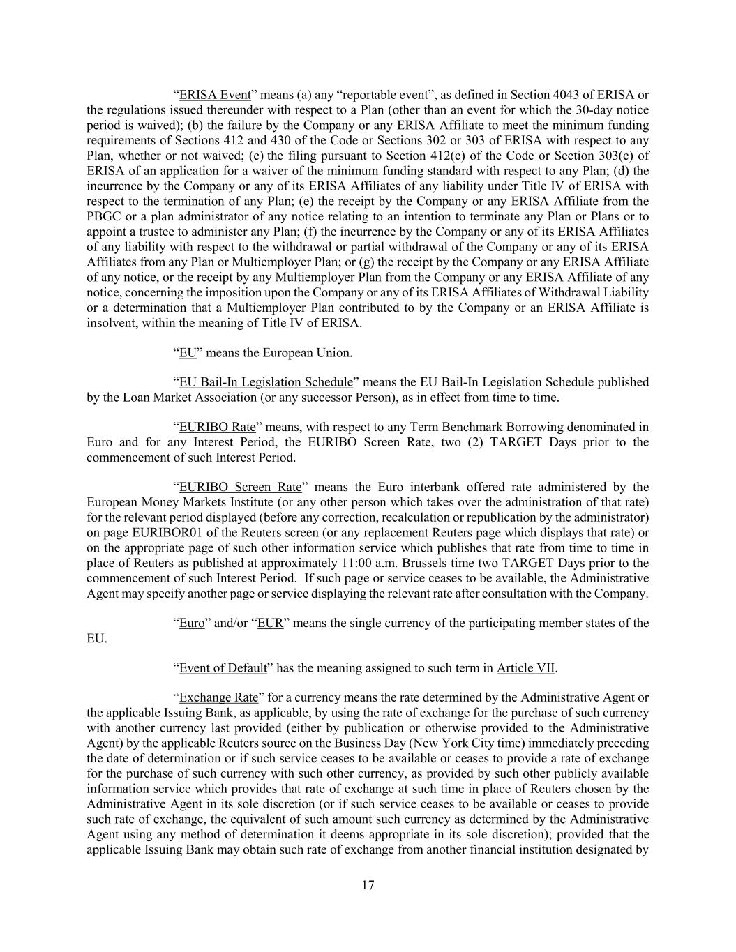 17 “ERISA Event” means (a) any “reportable event”, as defined in Section 4043 of ERISA or the regulations issued thereunder with respect to a Plan (other than an event for which the 30-day notice period is waived); (b) the failure by the Company or any ERISA Affiliate to meet the minimum funding requirements of Sections 412 and 430 of the Code or Sections 302 or 303 of ERISA with respect to any Plan, whether or not waived; (c) the filing pursuant to Section 412(c) of the Code or Section 303(c) of ERISA of an application for a waiver of the minimum funding standard with respect to any Plan; (d) the incurrence by the Company or any of its ERISA Affiliates of any liability under Title IV of ERISA with respect to the termination of any Plan; (e) the receipt by the Company or any ERISA Affiliate from the PBGC or a plan administrator of any notice relating to an intention to terminate any Plan or Plans or to appoint a trustee to administer any Plan; (f) the incurrence by the Company or any of its ERISA Affiliates of any liability with respect to the withdrawal or partial withdrawal of the Company or any of its ERISA Affiliates from any Plan or Multiemployer Plan; or (g) the receipt by the Company or any ERISA Affiliate of any notice, or the receipt by any Multiemployer Plan from the Company or any ERISA Affiliate of any notice, concerning the imposition upon the Company or any of its ERISA Affiliates of Withdrawal Liability or a determination that a Multiemployer Plan contributed to by the Company or an ERISA Affiliate is insolvent, within the meaning of Title IV of ERISA. “EU” means the European Union. “EU Bail-In Legislation Schedule” means the EU Bail-In Legislation Schedule published by the Loan Market Association (or any successor Person), as in effect from time to time. “EURIBO Rate” means, with respect to any Term Benchmark Borrowing denominated in Euro and for any Interest Period, the EURIBO Screen Rate, two (2) TARGET Days prior to the commencement of such Interest Period. “EURIBO Screen Rate” means the Euro interbank offered rate administered by the European Money Markets Institute (or any other person which takes over the administration of that rate) for the relevant period displayed (before any correction, recalculation or republication by the administrator) on page EURIBOR01 of the Reuters screen (or any replacement Reuters page which displays that rate) or on the appropriate page of such other information service which publishes that rate from time to time in place of Reuters as published at approximately 11:00 a.m. Brussels time two TARGET Days prior to the commencement of such Interest Period. If such page or service ceases to be available, the Administrative Agent may specify another page or service displaying the relevant rate after consultation with the Company. “Euro” and/or “EUR” means the single currency of the participating member states of the EU. “Event of Default” has the meaning assigned to such term in Article VII. “Exchange Rate” for a currency means the rate determined by the Administrative Agent or the applicable Issuing Bank, as applicable, by using the rate of exchange for the purchase of such currency with another currency last provided (either by publication or otherwise provided to the Administrative Agent) by the applicable Reuters source on the Business Day (New York City time) immediately preceding the date of determination or if such service ceases to be available or ceases to provide a rate of exchange for the purchase of such currency with such other currency, as provided by such other publicly available information service which provides that rate of exchange at such time in place of Reuters chosen by the Administrative Agent in its sole discretion (or if such service ceases to be available or ceases to provide such rate of exchange, the equivalent of such amount such currency as determined by the Administrative Agent using any method of determination it deems appropriate in its sole discretion); provided that the applicable Issuing Bank may obtain such rate of exchange from another financial institution designated by