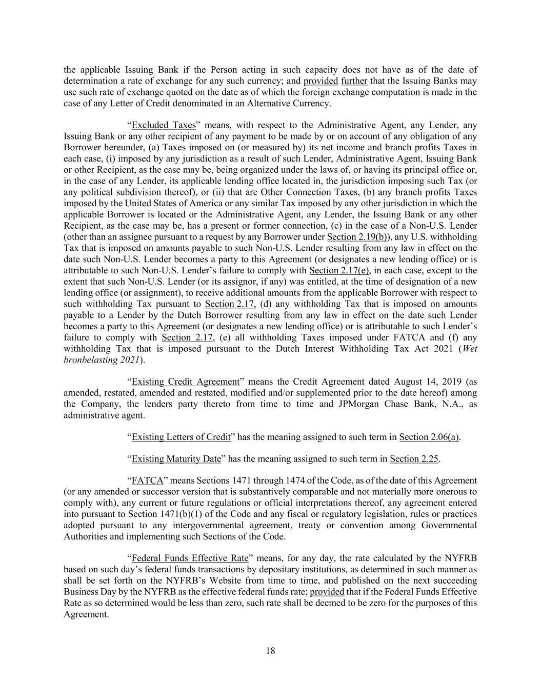 18 the applicable Issuing Bank if the Person acting in such capacity does not have as of the date of determination a rate of exchange for any such currency; and provided further that the Issuing Banks may use such rate of exchange quoted on the date as of which the foreign exchange computation is made in the case of any Letter of Credit denominated in an Alternative Currency. “Excluded Taxes” means, with respect to the Administrative Agent, any Lender, any Issuing Bank or any other recipient of any payment to be made by or on account of any obligation of any Borrower hereunder, (a) Taxes imposed on (or measured by) its net income and branch profits Taxes in each case, (i) imposed by any jurisdiction as a result of such Lender, Administrative Agent, Issuing Bank or other Recipient, as the case may be, being organized under the laws of, or having its principal office or, in the case of any Lender, its applicable lending office located in, the jurisdiction imposing such Tax (or any political subdivision thereof), or (ii) that are Other Connection Taxes, (b) any branch profits Taxes imposed by the United States of America or any similar Tax imposed by any other jurisdiction in which the applicable Borrower is located or the Administrative Agent, any Lender, the Issuing Bank or any other Recipient, as the case may be, has a present or former connection, (c) in the case of a Non-U.S. Lender (other than an assignee pursuant to a request by any Borrower under Section 2.19(b)), any U.S. withholding Tax that is imposed on amounts payable to such Non-U.S. Lender resulting from any law in effect on the date such Non-U.S. Lender becomes a party to this Agreement (or designates a new lending office) or is attributable to such Non-U.S. Lender’s failure to comply with Section 2.17(e), in each case, except to the extent that such Non-U.S. Lender (or its assignor, if any) was entitled, at the time of designation of a new lending office (or assignment), to receive additional amounts from the applicable Borrower with respect to such withholding Tax pursuant to Section 2.17, (d) any withholding Tax that is imposed on amounts payable to a Lender by the Dutch Borrower resulting from any law in effect on the date such Lender becomes a party to this Agreement (or designates a new lending office) or is attributable to such Lender’s failure to comply with Section 2.17, (e) all withholding Taxes imposed under FATCA and (f) any withholding Tax that is imposed pursuant to the Dutch Interest Withholding Tax Act 2021 (Wet bronbelasting 2021). “Existing Credit Agreement” means the Credit Agreement dated August 14, 2019 (as amended, restated, amended and restated, modified and/or supplemented prior to the date hereof) among the Company, the lenders party thereto from time to time and JPMorgan Chase Bank, N.A., as administrative agent. “Existing Letters of Credit” has the meaning assigned to such term in Section 2.06(a). “Existing Maturity Date” has the meaning assigned to such term in Section 2.25. “FATCA” means Sections 1471 through 1474 of the Code, as of the date of this Agreement (or any amended or successor version that is substantively comparable and not materially more onerous to comply with), any current or future regulations or official interpretations thereof, any agreement entered into pursuant to Section 1471(b)(1) of the Code and any fiscal or regulatory legislation, rules or practices adopted pursuant to any intergovernmental agreement, treaty or convention among Governmental Authorities and implementing such Sections of the Code. “Federal Funds Effective Rate” means, for any day, the rate calculated by the NYFRB based on such day’s federal funds transactions by depositary institutions, as determined in such manner as shall be set forth on the NYFRB’s Website from time to time, and published on the next succeeding Business Day by the NYFRB as the effective federal funds rate; provided that if the Federal Funds Effective Rate as so determined would be less than zero, such rate shall be deemed to be zero for the purposes of this Agreement.