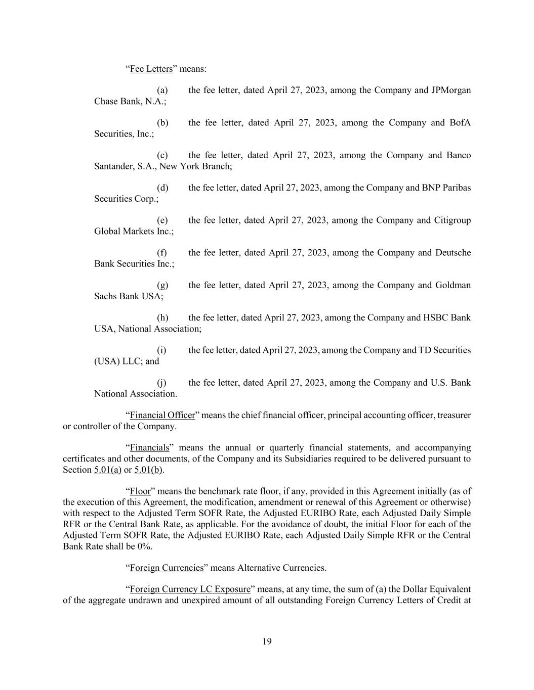 19 “Fee Letters” means: (a) the fee letter, dated April 27, 2023, among the Company and JPMorgan Chase Bank, N.A.; (b) the fee letter, dated April 27, 2023, among the Company and BofA Securities, Inc.; (c) the fee letter, dated April 27, 2023, among the Company and Banco Santander, S.A., New York Branch; (d) the fee letter, dated April 27, 2023, among the Company and BNP Paribas Securities Corp.; (e) the fee letter, dated April 27, 2023, among the Company and Citigroup Global Markets Inc.; (f) the fee letter, dated April 27, 2023, among the Company and Deutsche Bank Securities Inc.; (g) the fee letter, dated April 27, 2023, among the Company and Goldman Sachs Bank USA; (h) the fee letter, dated April 27, 2023, among the Company and HSBC Bank USA, National Association; (i) the fee letter, dated April 27, 2023, among the Company and TD Securities (USA) LLC; and (j) the fee letter, dated April 27, 2023, among the Company and U.S. Bank National Association. “Financial Officer” means the chief financial officer, principal accounting officer, treasurer or controller of the Company. “Financials” means the annual or quarterly financial statements, and accompanying certificates and other documents, of the Company and its Subsidiaries required to be delivered pursuant to Section 5.01(a) or 5.01(b). “Floor” means the benchmark rate floor, if any, provided in this Agreement initially (as of the execution of this Agreement, the modification, amendment or renewal of this Agreement or otherwise) with respect to the Adjusted Term SOFR Rate, the Adjusted EURIBO Rate, each Adjusted Daily Simple RFR or the Central Bank Rate, as applicable. For the avoidance of doubt, the initial Floor for each of the Adjusted Term SOFR Rate, the Adjusted EURIBO Rate, each Adjusted Daily Simple RFR or the Central Bank Rate shall be 0%. “Foreign Currencies” means Alternative Currencies. “Foreign Currency LC Exposure” means, at any time, the sum of (a) the Dollar Equivalent of the aggregate undrawn and unexpired amount of all outstanding Foreign Currency Letters of Credit at
