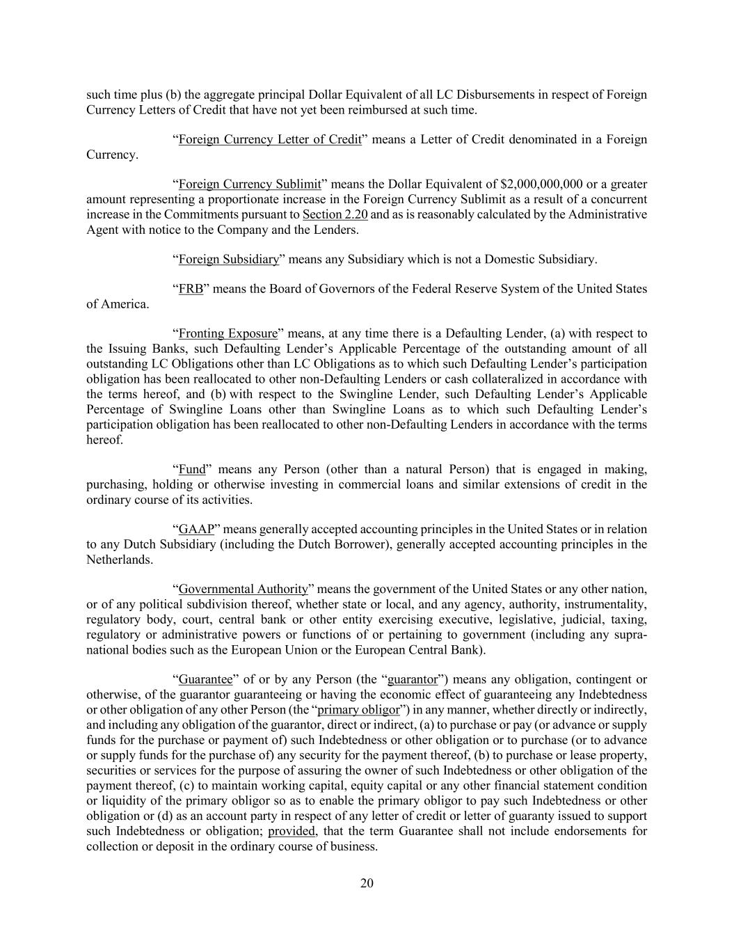 20 such time plus (b) the aggregate principal Dollar Equivalent of all LC Disbursements in respect of Foreign Currency Letters of Credit that have not yet been reimbursed at such time. “Foreign Currency Letter of Credit” means a Letter of Credit denominated in a Foreign Currency. “Foreign Currency Sublimit” means the Dollar Equivalent of $2,000,000,000 or a greater amount representing a proportionate increase in the Foreign Currency Sublimit as a result of a concurrent increase in the Commitments pursuant to Section 2.20 and as is reasonably calculated by the Administrative Agent with notice to the Company and the Lenders. “Foreign Subsidiary” means any Subsidiary which is not a Domestic Subsidiary. “FRB” means the Board of Governors of the Federal Reserve System of the United States of America. “Fronting Exposure” means, at any time there is a Defaulting Lender, (a) with respect to the Issuing Banks, such Defaulting Lender’s Applicable Percentage of the outstanding amount of all outstanding LC Obligations other than LC Obligations as to which such Defaulting Lender’s participation obligation has been reallocated to other non-Defaulting Lenders or cash collateralized in accordance with the terms hereof, and (b) with respect to the Swingline Lender, such Defaulting Lender’s Applicable Percentage of Swingline Loans other than Swingline Loans as to which such Defaulting Lender’s participation obligation has been reallocated to other non-Defaulting Lenders in accordance with the terms hereof. “Fund” means any Person (other than a natural Person) that is engaged in making, purchasing, holding or otherwise investing in commercial loans and similar extensions of credit in the ordinary course of its activities. “GAAP” means generally accepted accounting principles in the United States or in relation to any Dutch Subsidiary (including the Dutch Borrower), generally accepted accounting principles in the Netherlands. “Governmental Authority” means the government of the United States or any other nation, or of any political subdivision thereof, whether state or local, and any agency, authority, instrumentality, regulatory body, court, central bank or other entity exercising executive, legislative, judicial, taxing, regulatory or administrative powers or functions of or pertaining to government (including any supra- national bodies such as the European Union or the European Central Bank). “Guarantee” of or by any Person (the “guarantor”) means any obligation, contingent or otherwise, of the guarantor guaranteeing or having the economic effect of guaranteeing any Indebtedness or other obligation of any other Person (the “primary obligor”) in any manner, whether directly or indirectly, and including any obligation of the guarantor, direct or indirect, (a) to purchase or pay (or advance or supply funds for the purchase or payment of) such Indebtedness or other obligation or to purchase (or to advance or supply funds for the purchase of) any security for the payment thereof, (b) to purchase or lease property, securities or services for the purpose of assuring the owner of such Indebtedness or other obligation of the payment thereof, (c) to maintain working capital, equity capital or any other financial statement condition or liquidity of the primary obligor so as to enable the primary obligor to pay such Indebtedness or other obligation or (d) as an account party in respect of any letter of credit or letter of guaranty issued to support such Indebtedness or obligation; provided, that the term Guarantee shall not include endorsements for collection or deposit in the ordinary course of business.