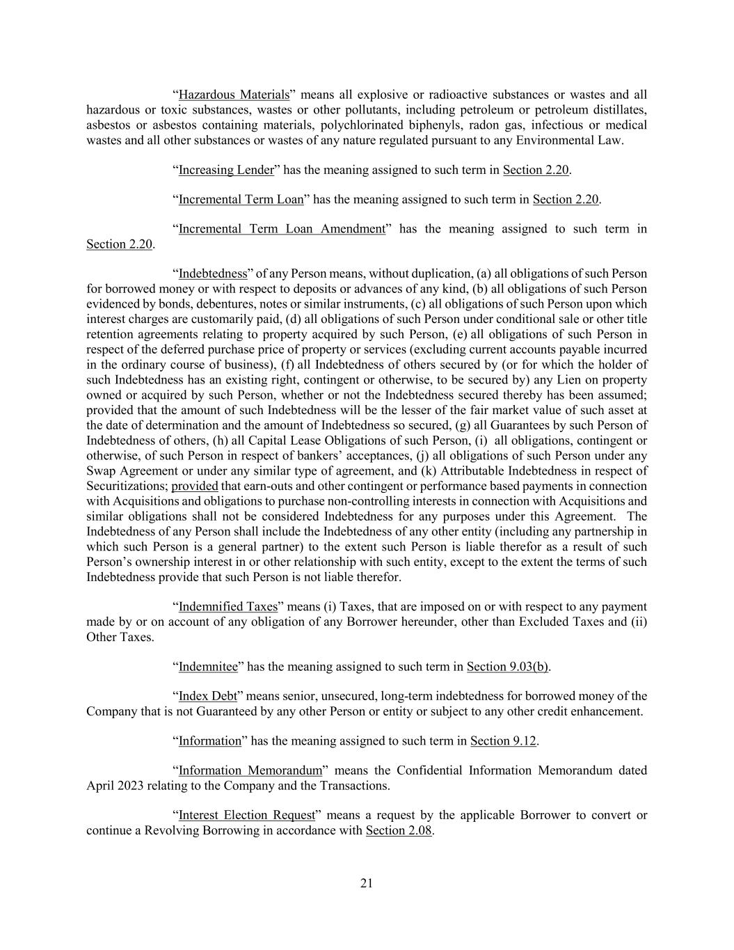 21 “Hazardous Materials” means all explosive or radioactive substances or wastes and all hazardous or toxic substances, wastes or other pollutants, including petroleum or petroleum distillates, asbestos or asbestos containing materials, polychlorinated biphenyls, radon gas, infectious or medical wastes and all other substances or wastes of any nature regulated pursuant to any Environmental Law. “Increasing Lender” has the meaning assigned to such term in Section 2.20. “Incremental Term Loan” has the meaning assigned to such term in Section 2.20. “Incremental Term Loan Amendment” has the meaning assigned to such term in Section 2.20. “Indebtedness” of any Person means, without duplication, (a) all obligations of such Person for borrowed money or with respect to deposits or advances of any kind, (b) all obligations of such Person evidenced by bonds, debentures, notes or similar instruments, (c) all obligations of such Person upon which interest charges are customarily paid, (d) all obligations of such Person under conditional sale or other title retention agreements relating to property acquired by such Person, (e) all obligations of such Person in respect of the deferred purchase price of property or services (excluding current accounts payable incurred in the ordinary course of business), (f) all Indebtedness of others secured by (or for which the holder of such Indebtedness has an existing right, contingent or otherwise, to be secured by) any Lien on property owned or acquired by such Person, whether or not the Indebtedness secured thereby has been assumed; provided that the amount of such Indebtedness will be the lesser of the fair market value of such asset at the date of determination and the amount of Indebtedness so secured, (g) all Guarantees by such Person of Indebtedness of others, (h) all Capital Lease Obligations of such Person, (i) all obligations, contingent or otherwise, of such Person in respect of bankers’ acceptances, (j) all obligations of such Person under any Swap Agreement or under any similar type of agreement, and (k) Attributable Indebtedness in respect of Securitizations; provided that earn-outs and other contingent or performance based payments in connection with Acquisitions and obligations to purchase non-controlling interests in connection with Acquisitions and similar obligations shall not be considered Indebtedness for any purposes under this Agreement. The Indebtedness of any Person shall include the Indebtedness of any other entity (including any partnership in which such Person is a general partner) to the extent such Person is liable therefor as a result of such Person’s ownership interest in or other relationship with such entity, except to the extent the terms of such Indebtedness provide that such Person is not liable therefor. “Indemnified Taxes” means (i) Taxes, that are imposed on or with respect to any payment made by or on account of any obligation of any Borrower hereunder, other than Excluded Taxes and (ii) Other Taxes. “Indemnitee” has the meaning assigned to such term in Section 9.03(b). “Index Debt” means senior, unsecured, long-term indebtedness for borrowed money of the Company that is not Guaranteed by any other Person or entity or subject to any other credit enhancement. “Information” has the meaning assigned to such term in Section 9.12. “Information Memorandum” means the Confidential Information Memorandum dated April 2023 relating to the Company and the Transactions. “Interest Election Request” means a request by the applicable Borrower to convert or continue a Revolving Borrowing in accordance with Section 2.08.