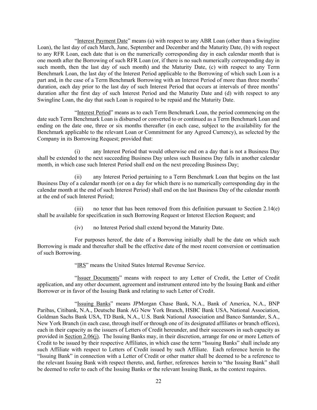 22 “Interest Payment Date” means (a) with respect to any ABR Loan (other than a Swingline Loan), the last day of each March, June, September and December and the Maturity Date, (b) with respect to any RFR Loan, each date that is on the numerically corresponding day in each calendar month that is one month after the Borrowing of such RFR Loan (or, if there is no such numerically corresponding day in such month, then the last day of such month) and the Maturity Date, (c) with respect to any Term Benchmark Loan, the last day of the Interest Period applicable to the Borrowing of which such Loan is a part and, in the case of a Term Benchmark Borrowing with an Interest Period of more than three months’ duration, each day prior to the last day of such Interest Period that occurs at intervals of three months’ duration after the first day of such Interest Period and the Maturity Date and (d) with respect to any Swingline Loan, the day that such Loan is required to be repaid and the Maturity Date. “Interest Period” means as to each Term Benchmark Loan, the period commencing on the date such Term Benchmark Loan is disbursed or converted to or continued as a Term Benchmark Loan and ending on the date one, three or six months thereafter (in each case, subject to the availability for the Benchmark applicable to the relevant Loan or Commitment for any Agreed Currency), as selected by the Company in its Borrowing Request; provided that: (i) any Interest Period that would otherwise end on a day that is not a Business Day shall be extended to the next succeeding Business Day unless such Business Day falls in another calendar month, in which case such Interest Period shall end on the next preceding Business Day; (ii) any Interest Period pertaining to a Term Benchmark Loan that begins on the last Business Day of a calendar month (or on a day for which there is no numerically corresponding day in the calendar month at the end of such Interest Period) shall end on the last Business Day of the calendar month at the end of such Interest Period; (iii) no tenor that has been removed from this definition pursuant to Section 2.14(e) shall be available for specification in such Borrowing Request or Interest Election Request; and (iv) no Interest Period shall extend beyond the Maturity Date. For purposes hereof, the date of a Borrowing initially shall be the date on which such Borrowing is made and thereafter shall be the effective date of the most recent conversion or continuation of such Borrowing. “IRS” means the United States Internal Revenue Service. “Issuer Documents” means with respect to any Letter of Credit, the Letter of Credit application, and any other document, agreement and instrument entered into by the Issuing Bank and either Borrower or in favor of the Issuing Bank and relating to such Letter of Credit. “Issuing Banks” means JPMorgan Chase Bank, N.A., Bank of America, N.A., BNP Paribas, Citibank, N.A., Deutsche Bank AG New York Branch, HSBC Bank USA, National Association, Goldman Sachs Bank USA, TD Bank, N.A., U.S. Bank National Association and Banco Santander, S.A., New York Branch (in each case, through itself or through one of its designated affiliates or branch offices), each in their capacity as the issuers of Letters of Credit hereunder, and their successors in such capacity as provided in Section 2.06(j). The Issuing Banks may, in their discretion, arrange for one or more Letters of Credit to be issued by their respective Affiliates, in which case the term “Issuing Banks” shall include any such Affiliate with respect to Letters of Credit issued by such Affiliate. Each reference herein to the “Issuing Bank” in connection with a Letter of Credit or other matter shall be deemed to be a reference to the relevant Issuing Bank with respect thereto, and, further, references herein to “the Issuing Bank” shall be deemed to refer to each of the Issuing Banks or the relevant Issuing Bank, as the context requires.