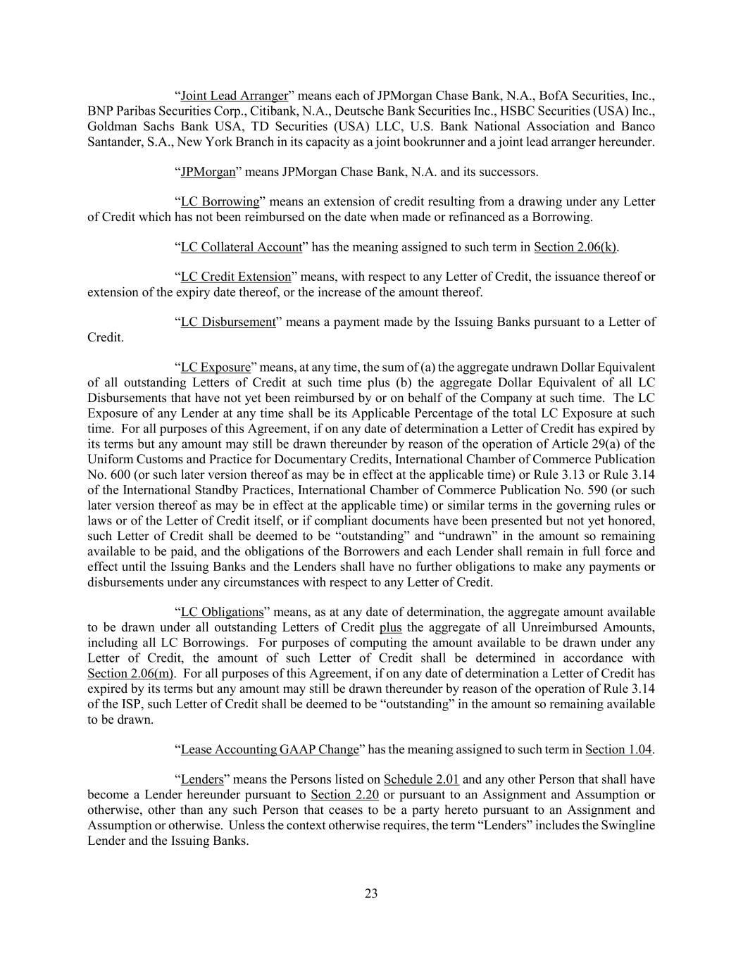23 “Joint Lead Arranger” means each of JPMorgan Chase Bank, N.A., BofA Securities, Inc., BNP Paribas Securities Corp., Citibank, N.A., Deutsche Bank Securities Inc., HSBC Securities (USA) Inc., Goldman Sachs Bank USA, TD Securities (USA) LLC, U.S. Bank National Association and Banco Santander, S.A., New York Branch in its capacity as a joint bookrunner and a joint lead arranger hereunder. “JPMorgan” means JPMorgan Chase Bank, N.A. and its successors. “LC Borrowing” means an extension of credit resulting from a drawing under any Letter of Credit which has not been reimbursed on the date when made or refinanced as a Borrowing. “LC Collateral Account” has the meaning assigned to such term in Section 2.06(k). “LC Credit Extension” means, with respect to any Letter of Credit, the issuance thereof or extension of the expiry date thereof, or the increase of the amount thereof. “LC Disbursement” means a payment made by the Issuing Banks pursuant to a Letter of Credit. “LC Exposure” means, at any time, the sum of (a) the aggregate undrawn Dollar Equivalent of all outstanding Letters of Credit at such time plus (b) the aggregate Dollar Equivalent of all LC Disbursements that have not yet been reimbursed by or on behalf of the Company at such time. The LC Exposure of any Lender at any time shall be its Applicable Percentage of the total LC Exposure at such time. For all purposes of this Agreement, if on any date of determination a Letter of Credit has expired by its terms but any amount may still be drawn thereunder by reason of the operation of Article 29(a) of the Uniform Customs and Practice for Documentary Credits, International Chamber of Commerce Publication No. 600 (or such later version thereof as may be in effect at the applicable time) or Rule 3.13 or Rule 3.14 of the International Standby Practices, International Chamber of Commerce Publication No. 590 (or such later version thereof as may be in effect at the applicable time) or similar terms in the governing rules or laws or of the Letter of Credit itself, or if compliant documents have been presented but not yet honored, such Letter of Credit shall be deemed to be “outstanding” and “undrawn” in the amount so remaining available to be paid, and the obligations of the Borrowers and each Lender shall remain in full force and effect until the Issuing Banks and the Lenders shall have no further obligations to make any payments or disbursements under any circumstances with respect to any Letter of Credit. “LC Obligations” means, as at any date of determination, the aggregate amount available to be drawn under all outstanding Letters of Credit plus the aggregate of all Unreimbursed Amounts, including all LC Borrowings. For purposes of computing the amount available to be drawn under any Letter of Credit, the amount of such Letter of Credit shall be determined in accordance with Section 2.06(m). For all purposes of this Agreement, if on any date of determination a Letter of Credit has expired by its terms but any amount may still be drawn thereunder by reason of the operation of Rule 3.14 of the ISP, such Letter of Credit shall be deemed to be “outstanding” in the amount so remaining available to be drawn. “Lease Accounting GAAP Change” has the meaning assigned to such term in Section 1.04. “Lenders” means the Persons listed on Schedule 2.01 and any other Person that shall have become a Lender hereunder pursuant to Section 2.20 or pursuant to an Assignment and Assumption or otherwise, other than any such Person that ceases to be a party hereto pursuant to an Assignment and Assumption or otherwise. Unless the context otherwise requires, the term “Lenders” includes the Swingline Lender and the Issuing Banks.