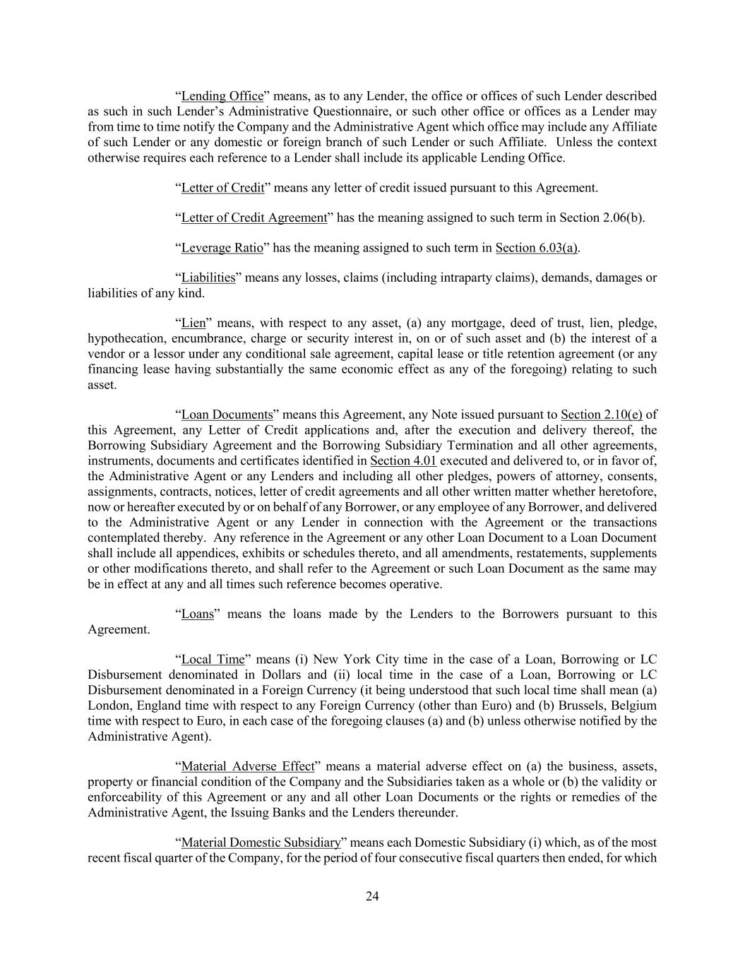 24 “Lending Office” means, as to any Lender, the office or offices of such Lender described as such in such Lender’s Administrative Questionnaire, or such other office or offices as a Lender may from time to time notify the Company and the Administrative Agent which office may include any Affiliate of such Lender or any domestic or foreign branch of such Lender or such Affiliate. Unless the context otherwise requires each reference to a Lender shall include its applicable Lending Office. “Letter of Credit” means any letter of credit issued pursuant to this Agreement. “Letter of Credit Agreement” has the meaning assigned to such term in Section 2.06(b). “Leverage Ratio” has the meaning assigned to such term in Section 6.03(a). “Liabilities” means any losses, claims (including intraparty claims), demands, damages or liabilities of any kind. “Lien” means, with respect to any asset, (a) any mortgage, deed of trust, lien, pledge, hypothecation, encumbrance, charge or security interest in, on or of such asset and (b) the interest of a vendor or a lessor under any conditional sale agreement, capital lease or title retention agreement (or any financing lease having substantially the same economic effect as any of the foregoing) relating to such asset. “Loan Documents” means this Agreement, any Note issued pursuant to Section 2.10(e) of this Agreement, any Letter of Credit applications and, after the execution and delivery thereof, the Borrowing Subsidiary Agreement and the Borrowing Subsidiary Termination and all other agreements, instruments, documents and certificates identified in Section 4.01 executed and delivered to, or in favor of, the Administrative Agent or any Lenders and including all other pledges, powers of attorney, consents, assignments, contracts, notices, letter of credit agreements and all other written matter whether heretofore, now or hereafter executed by or on behalf of any Borrower, or any employee of any Borrower, and delivered to the Administrative Agent or any Lender in connection with the Agreement or the transactions contemplated thereby. Any reference in the Agreement or any other Loan Document to a Loan Document shall include all appendices, exhibits or schedules thereto, and all amendments, restatements, supplements or other modifications thereto, and shall refer to the Agreement or such Loan Document as the same may be in effect at any and all times such reference becomes operative. “Loans” means the loans made by the Lenders to the Borrowers pursuant to this Agreement. “Local Time” means (i) New York City time in the case of a Loan, Borrowing or LC Disbursement denominated in Dollars and (ii) local time in the case of a Loan, Borrowing or LC Disbursement denominated in a Foreign Currency (it being understood that such local time shall mean (a) London, England time with respect to any Foreign Currency (other than Euro) and (b) Brussels, Belgium time with respect to Euro, in each case of the foregoing clauses (a) and (b) unless otherwise notified by the Administrative Agent). “Material Adverse Effect” means a material adverse effect on (a) the business, assets, property or financial condition of the Company and the Subsidiaries taken as a whole or (b) the validity or enforceability of this Agreement or any and all other Loan Documents or the rights or remedies of the Administrative Agent, the Issuing Banks and the Lenders thereunder. “Material Domestic Subsidiary” means each Domestic Subsidiary (i) which, as of the most recent fiscal quarter of the Company, for the period of four consecutive fiscal quarters then ended, for which