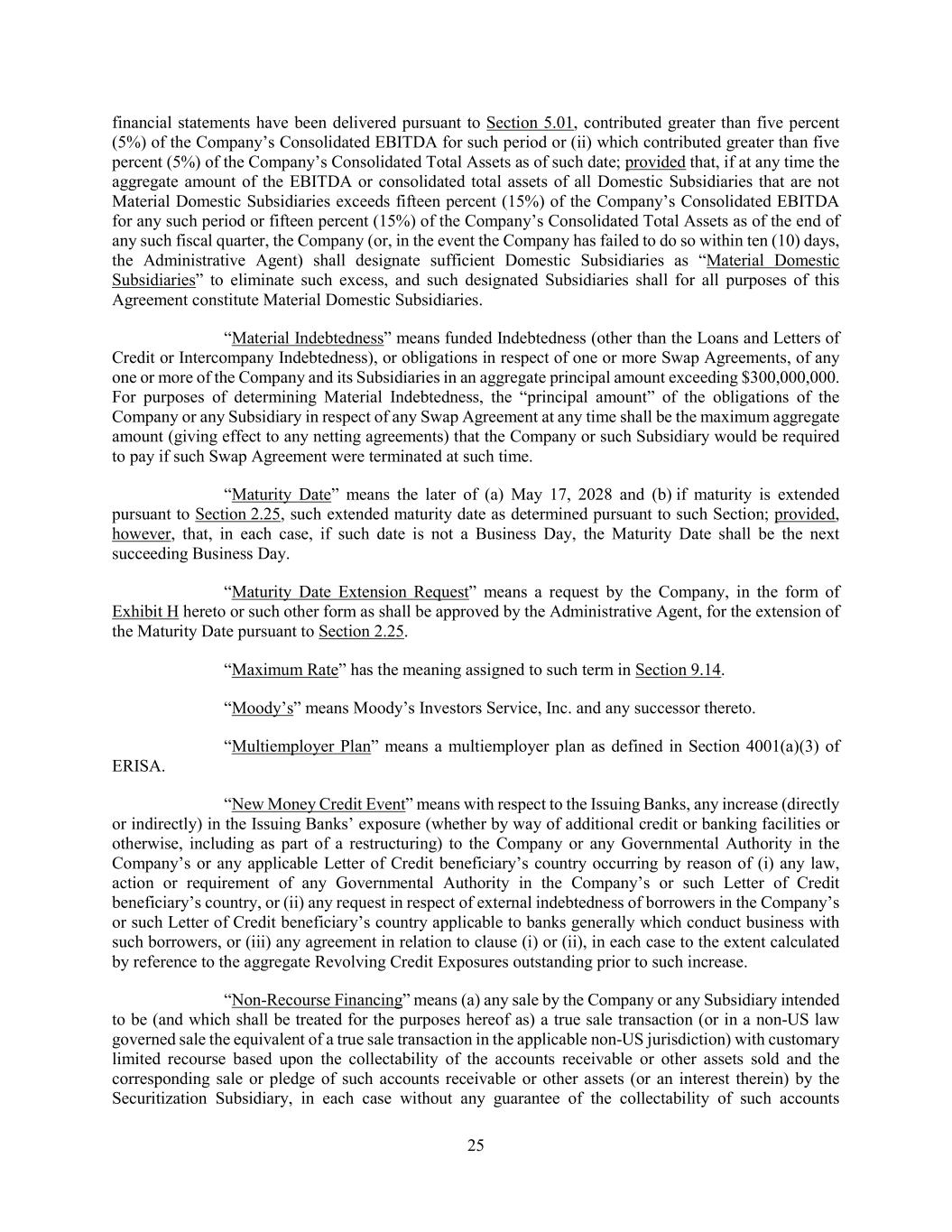 25 financial statements have been delivered pursuant to Section 5.01, contributed greater than five percent (5%) of the Company’s Consolidated EBITDA for such period or (ii) which contributed greater than five percent (5%) of the Company’s Consolidated Total Assets as of such date; provided that, if at any time the aggregate amount of the EBITDA or consolidated total assets of all Domestic Subsidiaries that are not Material Domestic Subsidiaries exceeds fifteen percent (15%) of the Company’s Consolidated EBITDA for any such period or fifteen percent (15%) of the Company’s Consolidated Total Assets as of the end of any such fiscal quarter, the Company (or, in the event the Company has failed to do so within ten (10) days, the Administrative Agent) shall designate sufficient Domestic Subsidiaries as “Material Domestic Subsidiaries” to eliminate such excess, and such designated Subsidiaries shall for all purposes of this Agreement constitute Material Domestic Subsidiaries. “Material Indebtedness” means funded Indebtedness (other than the Loans and Letters of Credit or Intercompany Indebtedness), or obligations in respect of one or more Swap Agreements, of any one or more of the Company and its Subsidiaries in an aggregate principal amount exceeding $300,000,000. For purposes of determining Material Indebtedness, the “principal amount” of the obligations of the Company or any Subsidiary in respect of any Swap Agreement at any time shall be the maximum aggregate amount (giving effect to any netting agreements) that the Company or such Subsidiary would be required to pay if such Swap Agreement were terminated at such time. “Maturity Date” means the later of (a) May 17, 2028 and (b) if maturity is extended pursuant to Section 2.25, such extended maturity date as determined pursuant to such Section; provided, however, that, in each case, if such date is not a Business Day, the Maturity Date shall be the next succeeding Business Day. “Maturity Date Extension Request” means a request by the Company, in the form of Exhibit H hereto or such other form as shall be approved by the Administrative Agent, for the extension of the Maturity Date pursuant to Section 2.25. “Maximum Rate” has the meaning assigned to such term in Section 9.14. “Moody’s” means Moody’s Investors Service, Inc. and any successor thereto. “Multiemployer Plan” means a multiemployer plan as defined in Section 4001(a)(3) of ERISA. “New Money Credit Event” means with respect to the Issuing Banks, any increase (directly or indirectly) in the Issuing Banks’ exposure (whether by way of additional credit or banking facilities or otherwise, including as part of a restructuring) to the Company or any Governmental Authority in the Company’s or any applicable Letter of Credit beneficiary’s country occurring by reason of (i) any law, action or requirement of any Governmental Authority in the Company’s or such Letter of Credit beneficiary’s country, or (ii) any request in respect of external indebtedness of borrowers in the Company’s or such Letter of Credit beneficiary’s country applicable to banks generally which conduct business with such borrowers, or (iii) any agreement in relation to clause (i) or (ii), in each case to the extent calculated by reference to the aggregate Revolving Credit Exposures outstanding prior to such increase. “Non-Recourse Financing” means (a) any sale by the Company or any Subsidiary intended to be (and which shall be treated for the purposes hereof as) a true sale transaction (or in a non-US law governed sale the equivalent of a true sale transaction in the applicable non-US jurisdiction) with customary limited recourse based upon the collectability of the accounts receivable or other assets sold and the corresponding sale or pledge of such accounts receivable or other assets (or an interest therein) by the Securitization Subsidiary, in each case without any guarantee of the collectability of such accounts