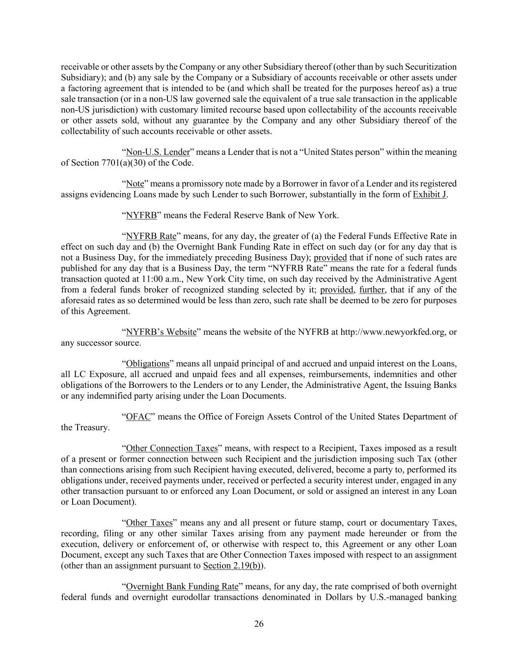 26 receivable or other assets by the Company or any other Subsidiary thereof (other than by such Securitization Subsidiary); and (b) any sale by the Company or a Subsidiary of accounts receivable or other assets under a factoring agreement that is intended to be (and which shall be treated for the purposes hereof as) a true sale transaction (or in a non-US law governed sale the equivalent of a true sale transaction in the applicable non-US jurisdiction) with customary limited recourse based upon collectability of the accounts receivable or other assets sold, without any guarantee by the Company and any other Subsidiary thereof of the collectability of such accounts receivable or other assets. “Non-U.S. Lender” means a Lender that is not a “United States person” within the meaning of Section 7701(a)(30) of the Code. “Note” means a promissory note made by a Borrower in favor of a Lender and its registered assigns evidencing Loans made by such Lender to such Borrower, substantially in the form of Exhibit J. “NYFRB” means the Federal Reserve Bank of New York. “NYFRB Rate” means, for any day, the greater of (a) the Federal Funds Effective Rate in effect on such day and (b) the Overnight Bank Funding Rate in effect on such day (or for any day that is not a Business Day, for the immediately preceding Business Day); provided that if none of such rates are published for any day that is a Business Day, the term “NYFRB Rate” means the rate for a federal funds transaction quoted at 11:00 a.m., New York City time, on such day received by the Administrative Agent from a federal funds broker of recognized standing selected by it; provided, further, that if any of the aforesaid rates as so determined would be less than zero, such rate shall be deemed to be zero for purposes of this Agreement. “NYFRB’s Website” means the website of the NYFRB at http://www.newyorkfed.org, or any successor source. “Obligations” means all unpaid principal of and accrued and unpaid interest on the Loans, all LC Exposure, all accrued and unpaid fees and all expenses, reimbursements, indemnities and other obligations of the Borrowers to the Lenders or to any Lender, the Administrative Agent, the Issuing Banks or any indemnified party arising under the Loan Documents. “OFAC” means the Office of Foreign Assets Control of the United States Department of the Treasury. “Other Connection Taxes” means, with respect to a Recipient, Taxes imposed as a result of a present or former connection between such Recipient and the jurisdiction imposing such Tax (other than connections arising from such Recipient having executed, delivered, become a party to, performed its obligations under, received payments under, received or perfected a security interest under, engaged in any other transaction pursuant to or enforced any Loan Document, or sold or assigned an interest in any Loan or Loan Document). “Other Taxes” means any and all present or future stamp, court or documentary Taxes, recording, filing or any other similar Taxes arising from any payment made hereunder or from the execution, delivery or enforcement of, or otherwise with respect to, this Agreement or any other Loan Document, except any such Taxes that are Other Connection Taxes imposed with respect to an assignment (other than an assignment pursuant to Section 2.19(b)). “Overnight Bank Funding Rate” means, for any day, the rate comprised of both overnight federal funds and overnight eurodollar transactions denominated in Dollars by U.S.-managed banking