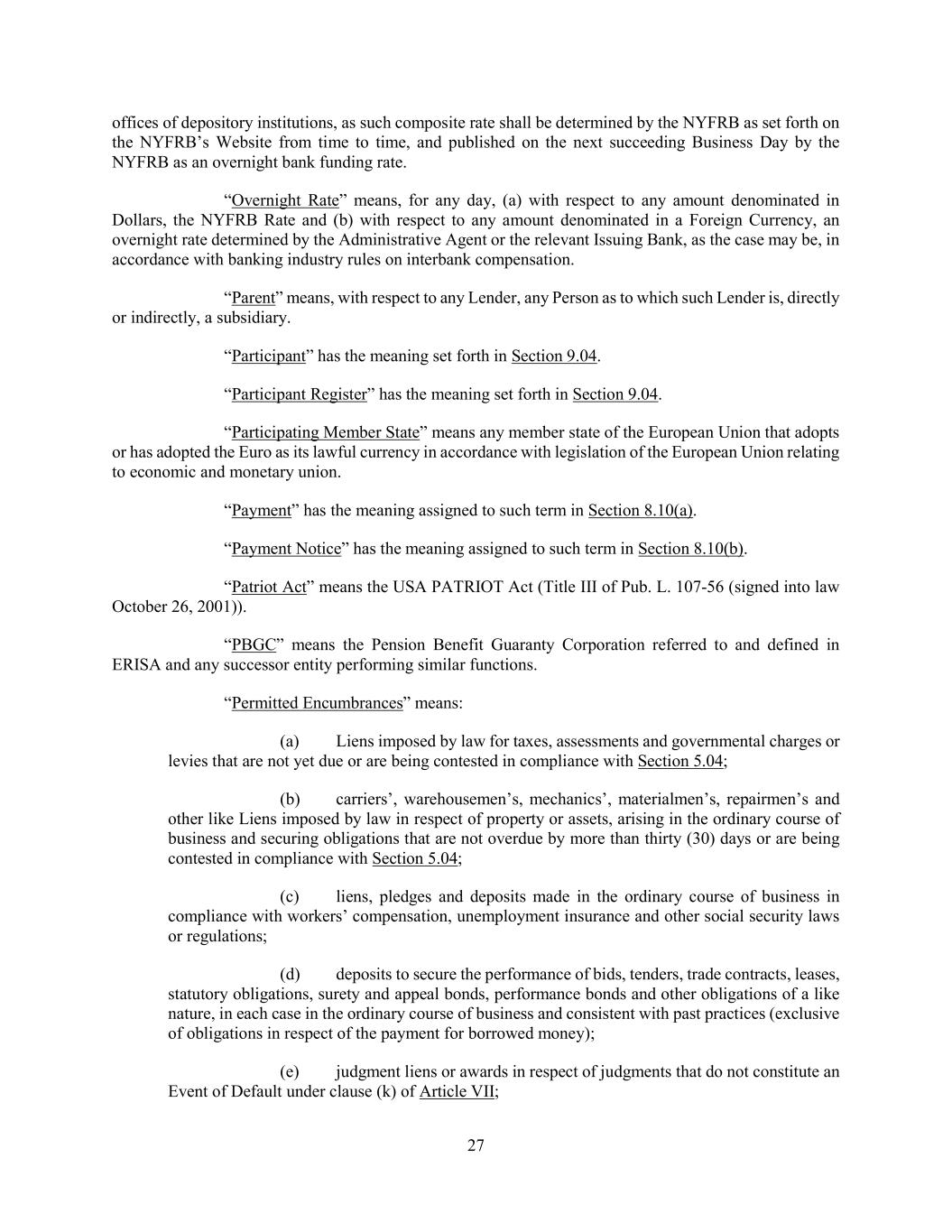 27 offices of depository institutions, as such composite rate shall be determined by the NYFRB as set forth on the NYFRB’s Website from time to time, and published on the next succeeding Business Day by the NYFRB as an overnight bank funding rate. “Overnight Rate” means, for any day, (a) with respect to any amount denominated in Dollars, the NYFRB Rate and (b) with respect to any amount denominated in a Foreign Currency, an overnight rate determined by the Administrative Agent or the relevant Issuing Bank, as the case may be, in accordance with banking industry rules on interbank compensation. “Parent” means, with respect to any Lender, any Person as to which such Lender is, directly or indirectly, a subsidiary. “Participant” has the meaning set forth in Section 9.04. “Participant Register” has the meaning set forth in Section 9.04. “Participating Member State” means any member state of the European Union that adopts or has adopted the Euro as its lawful currency in accordance with legislation of the European Union relating to economic and monetary union. “Payment” has the meaning assigned to such term in Section 8.10(a). “Payment Notice” has the meaning assigned to such term in Section 8.10(b). “Patriot Act” means the USA PATRIOT Act (Title III of Pub. L. 107-56 (signed into law October 26, 2001)). “PBGC” means the Pension Benefit Guaranty Corporation referred to and defined in ERISA and any successor entity performing similar functions. “Permitted Encumbrances” means: (a) Liens imposed by law for taxes, assessments and governmental charges or levies that are not yet due or are being contested in compliance with Section 5.04; (b) carriers’, warehousemen’s, mechanics’, materialmen’s, repairmen’s and other like Liens imposed by law in respect of property or assets, arising in the ordinary course of business and securing obligations that are not overdue by more than thirty (30) days or are being contested in compliance with Section 5.04; (c) liens, pledges and deposits made in the ordinary course of business in compliance with workers’ compensation, unemployment insurance and other social security laws or regulations; (d) deposits to secure the performance of bids, tenders, trade contracts, leases, statutory obligations, surety and appeal bonds, performance bonds and other obligations of a like nature, in each case in the ordinary course of business and consistent with past practices (exclusive of obligations in respect of the payment for borrowed money); (e) judgment liens or awards in respect of judgments that do not constitute an Event of Default under clause (k) of Article VII;