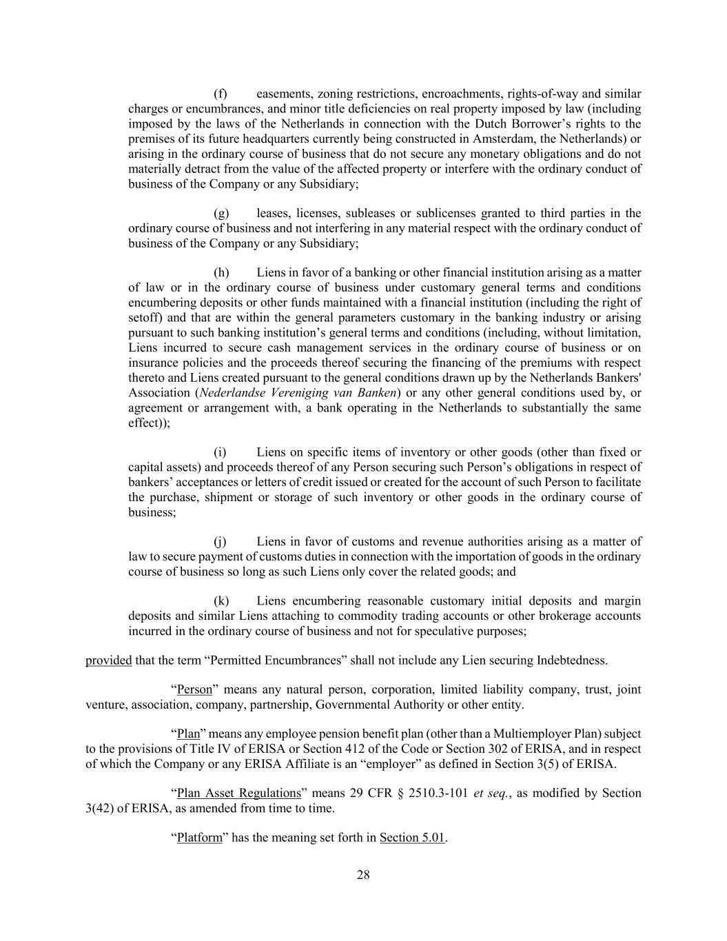 28 (f) easements, zoning restrictions, encroachments, rights-of-way and similar charges or encumbrances, and minor title deficiencies on real property imposed by law (including imposed by the laws of the Netherlands in connection with the Dutch Borrower’s rights to the premises of its future headquarters currently being constructed in Amsterdam, the Netherlands) or arising in the ordinary course of business that do not secure any monetary obligations and do not materially detract from the value of the affected property or interfere with the ordinary conduct of business of the Company or any Subsidiary; (g) leases, licenses, subleases or sublicenses granted to third parties in the ordinary course of business and not interfering in any material respect with the ordinary conduct of business of the Company or any Subsidiary; (h) Liens in favor of a banking or other financial institution arising as a matter of law or in the ordinary course of business under customary general terms and conditions encumbering deposits or other funds maintained with a financial institution (including the right of setoff) and that are within the general parameters customary in the banking industry or arising pursuant to such banking institution’s general terms and conditions (including, without limitation, Liens incurred to secure cash management services in the ordinary course of business or on insurance policies and the proceeds thereof securing the financing of the premiums with respect thereto and Liens created pursuant to the general conditions drawn up by the Netherlands Bankers' Association (Nederlandse Vereniging van Banken) or any other general conditions used by, or agreement or arrangement with, a bank operating in the Netherlands to substantially the same effect)); (i) Liens on specific items of inventory or other goods (other than fixed or capital assets) and proceeds thereof of any Person securing such Person’s obligations in respect of bankers’ acceptances or letters of credit issued or created for the account of such Person to facilitate the purchase, shipment or storage of such inventory or other goods in the ordinary course of business; (j) Liens in favor of customs and revenue authorities arising as a matter of law to secure payment of customs duties in connection with the importation of goods in the ordinary course of business so long as such Liens only cover the related goods; and (k) Liens encumbering reasonable customary initial deposits and margin deposits and similar Liens attaching to commodity trading accounts or other brokerage accounts incurred in the ordinary course of business and not for speculative purposes; provided that the term “Permitted Encumbrances” shall not include any Lien securing Indebtedness. “Person” means any natural person, corporation, limited liability company, trust, joint venture, association, company, partnership, Governmental Authority or other entity. “Plan” means any employee pension benefit plan (other than a Multiemployer Plan) subject to the provisions of Title IV of ERISA or Section 412 of the Code or Section 302 of ERISA, and in respect of which the Company or any ERISA Affiliate is an “employer” as defined in Section 3(5) of ERISA. “Plan Asset Regulations” means 29 CFR § 2510.3-101 et seq., as modified by Section 3(42) of ERISA, as amended from time to time. “Platform” has the meaning set forth in Section 5.01.
