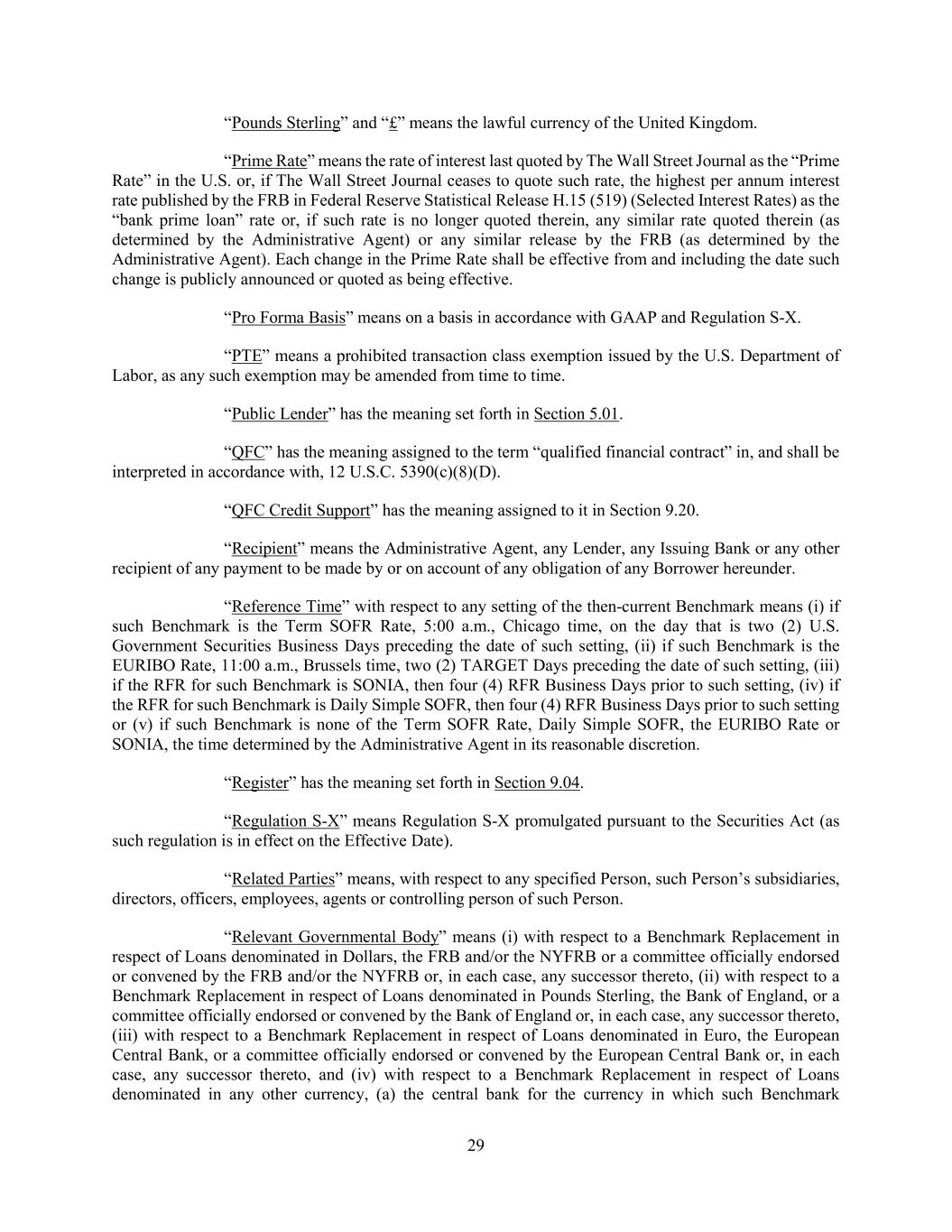 29 “Pounds Sterling” and “£” means the lawful currency of the United Kingdom. “Prime Rate” means the rate of interest last quoted by The Wall Street Journal as the “Prime Rate” in the U.S. or, if The Wall Street Journal ceases to quote such rate, the highest per annum interest rate published by the FRB in Federal Reserve Statistical Release H.15 (519) (Selected Interest Rates) as the “bank prime loan” rate or, if such rate is no longer quoted therein, any similar rate quoted therein (as determined by the Administrative Agent) or any similar release by the FRB (as determined by the Administrative Agent). Each change in the Prime Rate shall be effective from and including the date such change is publicly announced or quoted as being effective. “Pro Forma Basis” means on a basis in accordance with GAAP and Regulation S-X. “PTE” means a prohibited transaction class exemption issued by the U.S. Department of Labor, as any such exemption may be amended from time to time. “Public Lender” has the meaning set forth in Section 5.01. “QFC” has the meaning assigned to the term “qualified financial contract” in, and shall be interpreted in accordance with, 12 U.S.C. 5390(c)(8)(D). “QFC Credit Support” has the meaning assigned to it in Section 9.20. “Recipient” means the Administrative Agent, any Lender, any Issuing Bank or any other recipient of any payment to be made by or on account of any obligation of any Borrower hereunder. “Reference Time” with respect to any setting of the then-current Benchmark means (i) if such Benchmark is the Term SOFR Rate, 5:00 a.m., Chicago time, on the day that is two (2) U.S. Government Securities Business Days preceding the date of such setting, (ii) if such Benchmark is the EURIBO Rate, 11:00 a.m., Brussels time, two (2) TARGET Days preceding the date of such setting, (iii) if the RFR for such Benchmark is SONIA, then four (4) RFR Business Days prior to such setting, (iv) if the RFR for such Benchmark is Daily Simple SOFR, then four (4) RFR Business Days prior to such setting or (v) if such Benchmark is none of the Term SOFR Rate, Daily Simple SOFR, the EURIBO Rate or SONIA, the time determined by the Administrative Agent in its reasonable discretion. “Register” has the meaning set forth in Section 9.04. “Regulation S-X” means Regulation S-X promulgated pursuant to the Securities Act (as such regulation is in effect on the Effective Date). “Related Parties” means, with respect to any specified Person, such Person’s subsidiaries, directors, officers, employees, agents or controlling person of such Person. “Relevant Governmental Body” means (i) with respect to a Benchmark Replacement in respect of Loans denominated in Dollars, the FRB and/or the NYFRB or a committee officially endorsed or convened by the FRB and/or the NYFRB or, in each case, any successor thereto, (ii) with respect to a Benchmark Replacement in respect of Loans denominated in Pounds Sterling, the Bank of England, or a committee officially endorsed or convened by the Bank of England or, in each case, any successor thereto, (iii) with respect to a Benchmark Replacement in respect of Loans denominated in Euro, the European Central Bank, or a committee officially endorsed or convened by the European Central Bank or, in each case, any successor thereto, and (iv) with respect to a Benchmark Replacement in respect of Loans denominated in any other currency, (a) the central bank for the currency in which such Benchmark