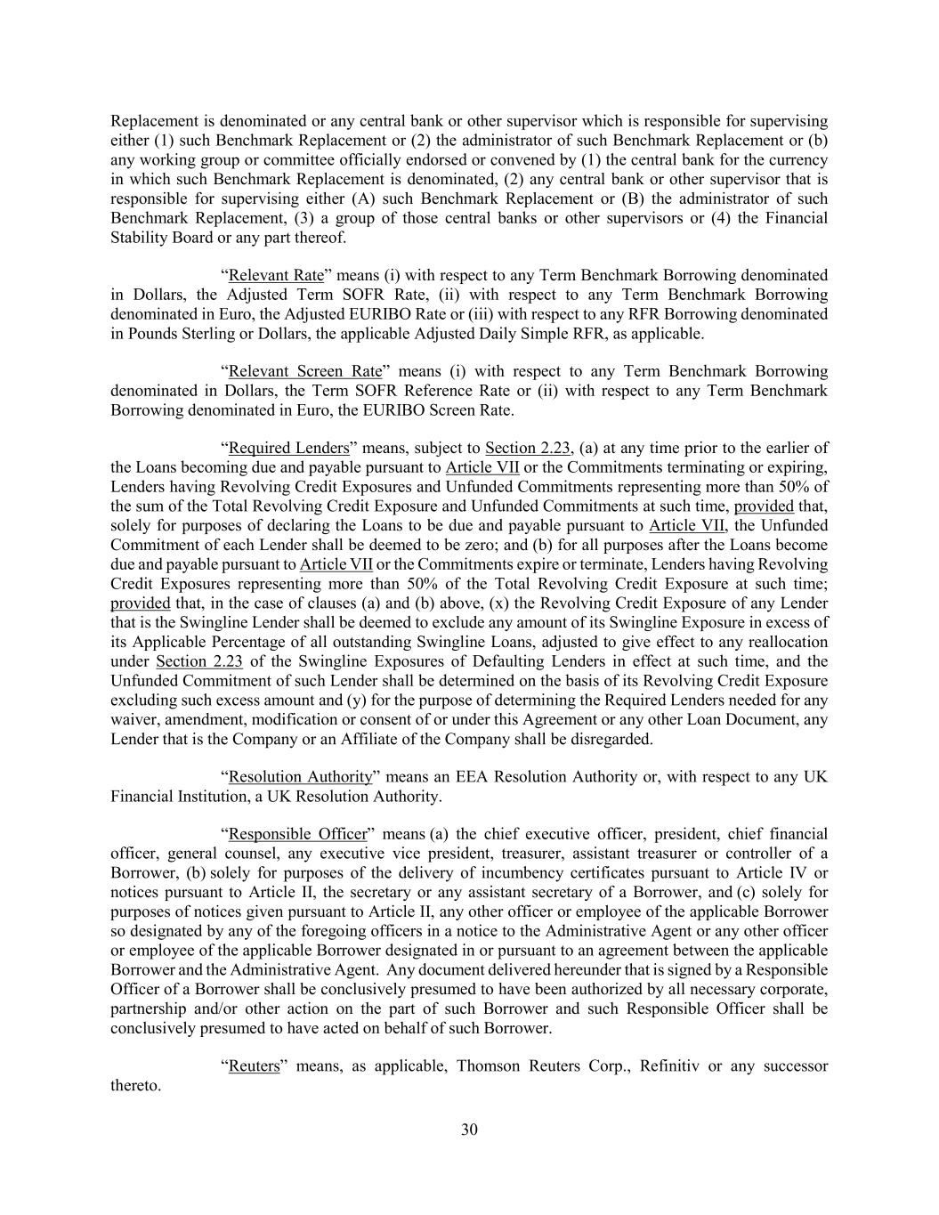 30 Replacement is denominated or any central bank or other supervisor which is responsible for supervising either (1) such Benchmark Replacement or (2) the administrator of such Benchmark Replacement or (b) any working group or committee officially endorsed or convened by (1) the central bank for the currency in which such Benchmark Replacement is denominated, (2) any central bank or other supervisor that is responsible for supervising either (A) such Benchmark Replacement or (B) the administrator of such Benchmark Replacement, (3) a group of those central banks or other supervisors or (4) the Financial Stability Board or any part thereof. “Relevant Rate” means (i) with respect to any Term Benchmark Borrowing denominated in Dollars, the Adjusted Term SOFR Rate, (ii) with respect to any Term Benchmark Borrowing denominated in Euro, the Adjusted EURIBO Rate or (iii) with respect to any RFR Borrowing denominated in Pounds Sterling or Dollars, the applicable Adjusted Daily Simple RFR, as applicable. “Relevant Screen Rate” means (i) with respect to any Term Benchmark Borrowing denominated in Dollars, the Term SOFR Reference Rate or (ii) with respect to any Term Benchmark Borrowing denominated in Euro, the EURIBO Screen Rate. “Required Lenders” means, subject to Section 2.23, (a) at any time prior to the earlier of the Loans becoming due and payable pursuant to Article VII or the Commitments terminating or expiring, Lenders having Revolving Credit Exposures and Unfunded Commitments representing more than 50% of the sum of the Total Revolving Credit Exposure and Unfunded Commitments at such time, provided that, solely for purposes of declaring the Loans to be due and payable pursuant to Article VII, the Unfunded Commitment of each Lender shall be deemed to be zero; and (b) for all purposes after the Loans become due and payable pursuant to Article VII or the Commitments expire or terminate, Lenders having Revolving Credit Exposures representing more than 50% of the Total Revolving Credit Exposure at such time; provided that, in the case of clauses (a) and (b) above, (x) the Revolving Credit Exposure of any Lender that is the Swingline Lender shall be deemed to exclude any amount of its Swingline Exposure in excess of its Applicable Percentage of all outstanding Swingline Loans, adjusted to give effect to any reallocation under Section 2.23 of the Swingline Exposures of Defaulting Lenders in effect at such time, and the Unfunded Commitment of such Lender shall be determined on the basis of its Revolving Credit Exposure excluding such excess amount and (y) for the purpose of determining the Required Lenders needed for any waiver, amendment, modification or consent of or under this Agreement or any other Loan Document, any Lender that is the Company or an Affiliate of the Company shall be disregarded. “Resolution Authority” means an EEA Resolution Authority or, with respect to any UK Financial Institution, a UK Resolution Authority. “Responsible Officer” means (a) the chief executive officer, president, chief financial officer, general counsel, any executive vice president, treasurer, assistant treasurer or controller of a Borrower, (b) solely for purposes of the delivery of incumbency certificates pursuant to Article IV or notices pursuant to Article II, the secretary or any assistant secretary of a Borrower, and (c) solely for purposes of notices given pursuant to Article II, any other officer or employee of the applicable Borrower so designated by any of the foregoing officers in a notice to the Administrative Agent or any other officer or employee of the applicable Borrower designated in or pursuant to an agreement between the applicable Borrower and the Administrative Agent. Any document delivered hereunder that is signed by a Responsible Officer of a Borrower shall be conclusively presumed to have been authorized by all necessary corporate, partnership and/or other action on the part of such Borrower and such Responsible Officer shall be conclusively presumed to have acted on behalf of such Borrower. “Reuters” means, as applicable, Thomson Reuters Corp., Refinitiv or any successor thereto.