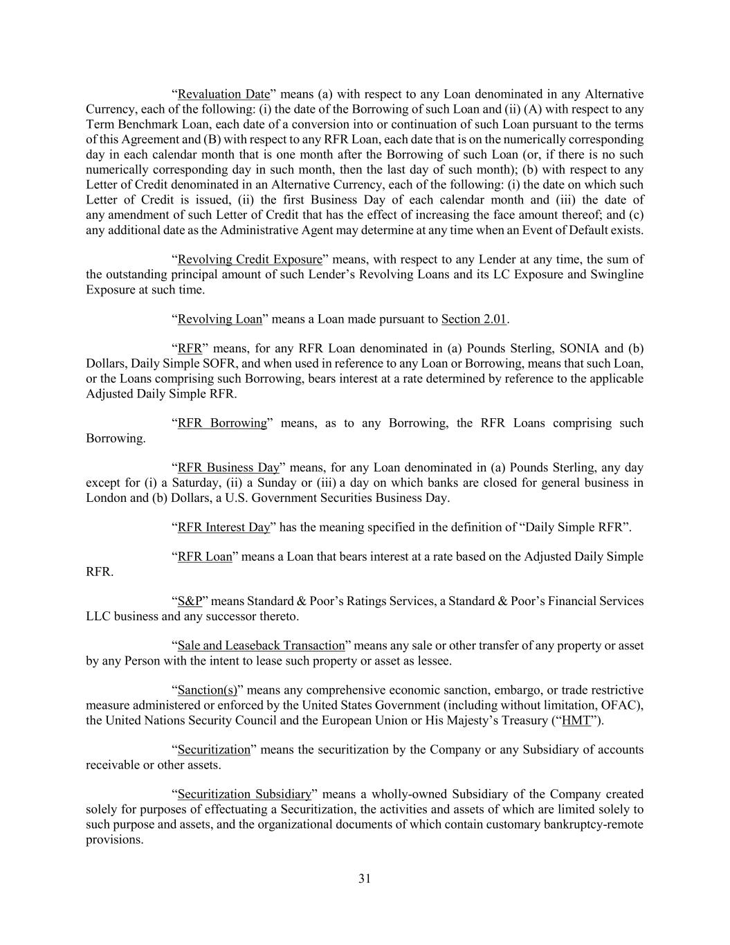 31 “Revaluation Date” means (a) with respect to any Loan denominated in any Alternative Currency, each of the following: (i) the date of the Borrowing of such Loan and (ii) (A) with respect to any Term Benchmark Loan, each date of a conversion into or continuation of such Loan pursuant to the terms of this Agreement and (B) with respect to any RFR Loan, each date that is on the numerically corresponding day in each calendar month that is one month after the Borrowing of such Loan (or, if there is no such numerically corresponding day in such month, then the last day of such month); (b) with respect to any Letter of Credit denominated in an Alternative Currency, each of the following: (i) the date on which such Letter of Credit is issued, (ii) the first Business Day of each calendar month and (iii) the date of any amendment of such Letter of Credit that has the effect of increasing the face amount thereof; and (c) any additional date as the Administrative Agent may determine at any time when an Event of Default exists. “Revolving Credit Exposure” means, with respect to any Lender at any time, the sum of the outstanding principal amount of such Lender’s Revolving Loans and its LC Exposure and Swingline Exposure at such time. “Revolving Loan” means a Loan made pursuant to Section 2.01. “RFR” means, for any RFR Loan denominated in (a) Pounds Sterling, SONIA and (b) Dollars, Daily Simple SOFR, and when used in reference to any Loan or Borrowing, means that such Loan, or the Loans comprising such Borrowing, bears interest at a rate determined by reference to the applicable Adjusted Daily Simple RFR. “RFR Borrowing” means, as to any Borrowing, the RFR Loans comprising such Borrowing. “RFR Business Day” means, for any Loan denominated in (a) Pounds Sterling, any day except for (i) a Saturday, (ii) a Sunday or (iii) a day on which banks are closed for general business in London and (b) Dollars, a U.S. Government Securities Business Day. “RFR Interest Day” has the meaning specified in the definition of “Daily Simple RFR”. “RFR Loan” means a Loan that bears interest at a rate based on the Adjusted Daily Simple RFR. “S&P” means Standard & Poor’s Ratings Services, a Standard & Poor’s Financial Services LLC business and any successor thereto. “Sale and Leaseback Transaction” means any sale or other transfer of any property or asset by any Person with the intent to lease such property or asset as lessee. “Sanction(s)” means any comprehensive economic sanction, embargo, or trade restrictive measure administered or enforced by the United States Government (including without limitation, OFAC), the United Nations Security Council and the European Union or His Majesty’s Treasury (“HMT”). “Securitization” means the securitization by the Company or any Subsidiary of accounts receivable or other assets. “Securitization Subsidiary” means a wholly-owned Subsidiary of the Company created solely for purposes of effectuating a Securitization, the activities and assets of which are limited solely to such purpose and assets, and the organizational documents of which contain customary bankruptcy-remote provisions.