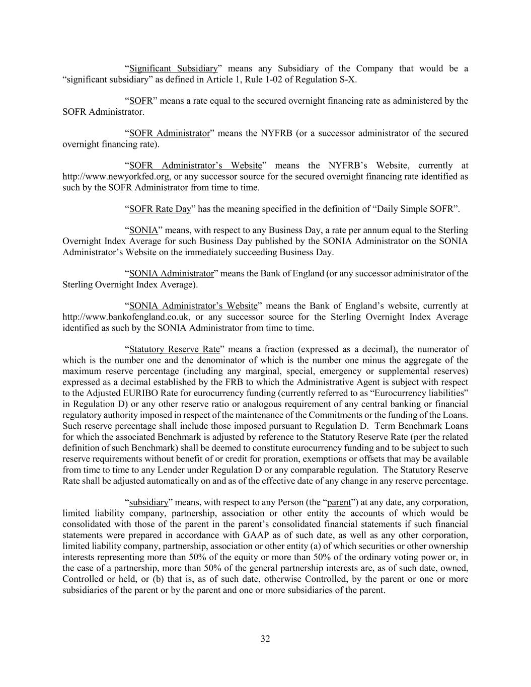 32 “Significant Subsidiary” means any Subsidiary of the Company that would be a “significant subsidiary” as defined in Article 1, Rule 1-02 of Regulation S-X. “SOFR” means a rate equal to the secured overnight financing rate as administered by the SOFR Administrator. “SOFR Administrator” means the NYFRB (or a successor administrator of the secured overnight financing rate). “SOFR Administrator’s Website” means the NYFRB’s Website, currently at http://www.newyorkfed.org, or any successor source for the secured overnight financing rate identified as such by the SOFR Administrator from time to time. “SOFR Rate Day” has the meaning specified in the definition of “Daily Simple SOFR”. “SONIA” means, with respect to any Business Day, a rate per annum equal to the Sterling Overnight Index Average for such Business Day published by the SONIA Administrator on the SONIA Administrator’s Website on the immediately succeeding Business Day. “SONIA Administrator” means the Bank of England (or any successor administrator of the Sterling Overnight Index Average). “SONIA Administrator’s Website” means the Bank of England’s website, currently at http://www.bankofengland.co.uk, or any successor source for the Sterling Overnight Index Average identified as such by the SONIA Administrator from time to time. “Statutory Reserve Rate” means a fraction (expressed as a decimal), the numerator of which is the number one and the denominator of which is the number one minus the aggregate of the maximum reserve percentage (including any marginal, special, emergency or supplemental reserves) expressed as a decimal established by the FRB to which the Administrative Agent is subject with respect to the Adjusted EURIBO Rate for eurocurrency funding (currently referred to as “Eurocurrency liabilities” in Regulation D) or any other reserve ratio or analogous requirement of any central banking or financial regulatory authority imposed in respect of the maintenance of the Commitments or the funding of the Loans. Such reserve percentage shall include those imposed pursuant to Regulation D. Term Benchmark Loans for which the associated Benchmark is adjusted by reference to the Statutory Reserve Rate (per the related definition of such Benchmark) shall be deemed to constitute eurocurrency funding and to be subject to such reserve requirements without benefit of or credit for proration, exemptions or offsets that may be available from time to time to any Lender under Regulation D or any comparable regulation. The Statutory Reserve Rate shall be adjusted automatically on and as of the effective date of any change in any reserve percentage. “subsidiary” means, with respect to any Person (the “parent”) at any date, any corporation, limited liability company, partnership, association or other entity the accounts of which would be consolidated with those of the parent in the parent’s consolidated financial statements if such financial statements were prepared in accordance with GAAP as of such date, as well as any other corporation, limited liability company, partnership, association or other entity (a) of which securities or other ownership interests representing more than 50% of the equity or more than 50% of the ordinary voting power or, in the case of a partnership, more than 50% of the general partnership interests are, as of such date, owned, Controlled or held, or (b) that is, as of such date, otherwise Controlled, by the parent or one or more subsidiaries of the parent or by the parent and one or more subsidiaries of the parent.