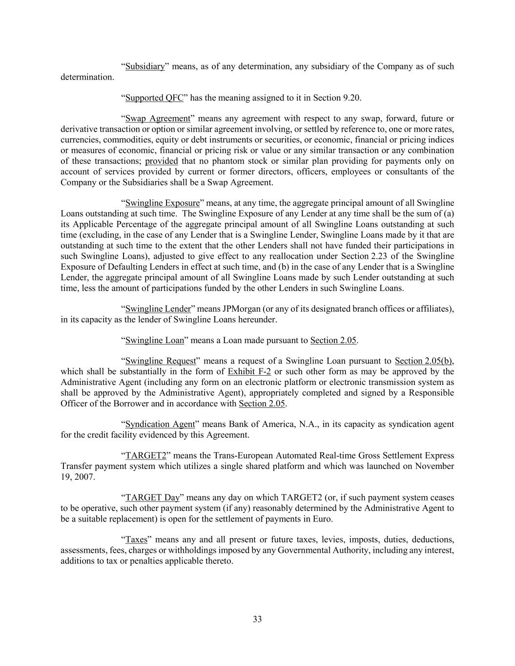 33 “Subsidiary” means, as of any determination, any subsidiary of the Company as of such determination. “Supported QFC” has the meaning assigned to it in Section 9.20. “Swap Agreement” means any agreement with respect to any swap, forward, future or derivative transaction or option or similar agreement involving, or settled by reference to, one or more rates, currencies, commodities, equity or debt instruments or securities, or economic, financial or pricing indices or measures of economic, financial or pricing risk or value or any similar transaction or any combination of these transactions; provided that no phantom stock or similar plan providing for payments only on account of services provided by current or former directors, officers, employees or consultants of the Company or the Subsidiaries shall be a Swap Agreement. “Swingline Exposure” means, at any time, the aggregate principal amount of all Swingline Loans outstanding at such time. The Swingline Exposure of any Lender at any time shall be the sum of (a) its Applicable Percentage of the aggregate principal amount of all Swingline Loans outstanding at such time (excluding, in the case of any Lender that is a Swingline Lender, Swingline Loans made by it that are outstanding at such time to the extent that the other Lenders shall not have funded their participations in such Swingline Loans), adjusted to give effect to any reallocation under Section 2.23 of the Swingline Exposure of Defaulting Lenders in effect at such time, and (b) in the case of any Lender that is a Swingline Lender, the aggregate principal amount of all Swingline Loans made by such Lender outstanding at such time, less the amount of participations funded by the other Lenders in such Swingline Loans. “Swingline Lender” means JPMorgan (or any of its designated branch offices or affiliates), in its capacity as the lender of Swingline Loans hereunder. “Swingline Loan” means a Loan made pursuant to Section 2.05. “Swingline Request” means a request of a Swingline Loan pursuant to Section 2.05(b), which shall be substantially in the form of Exhibit F-2 or such other form as may be approved by the Administrative Agent (including any form on an electronic platform or electronic transmission system as shall be approved by the Administrative Agent), appropriately completed and signed by a Responsible Officer of the Borrower and in accordance with Section 2.05. “Syndication Agent” means Bank of America, N.A., in its capacity as syndication agent for the credit facility evidenced by this Agreement. “TARGET2” means the Trans-European Automated Real-time Gross Settlement Express Transfer payment system which utilizes a single shared platform and which was launched on November 19, 2007. “TARGET Day” means any day on which TARGET2 (or, if such payment system ceases to be operative, such other payment system (if any) reasonably determined by the Administrative Agent to be a suitable replacement) is open for the settlement of payments in Euro. “Taxes” means any and all present or future taxes, levies, imposts, duties, deductions, assessments, fees, charges or withholdings imposed by any Governmental Authority, including any interest, additions to tax or penalties applicable thereto.
