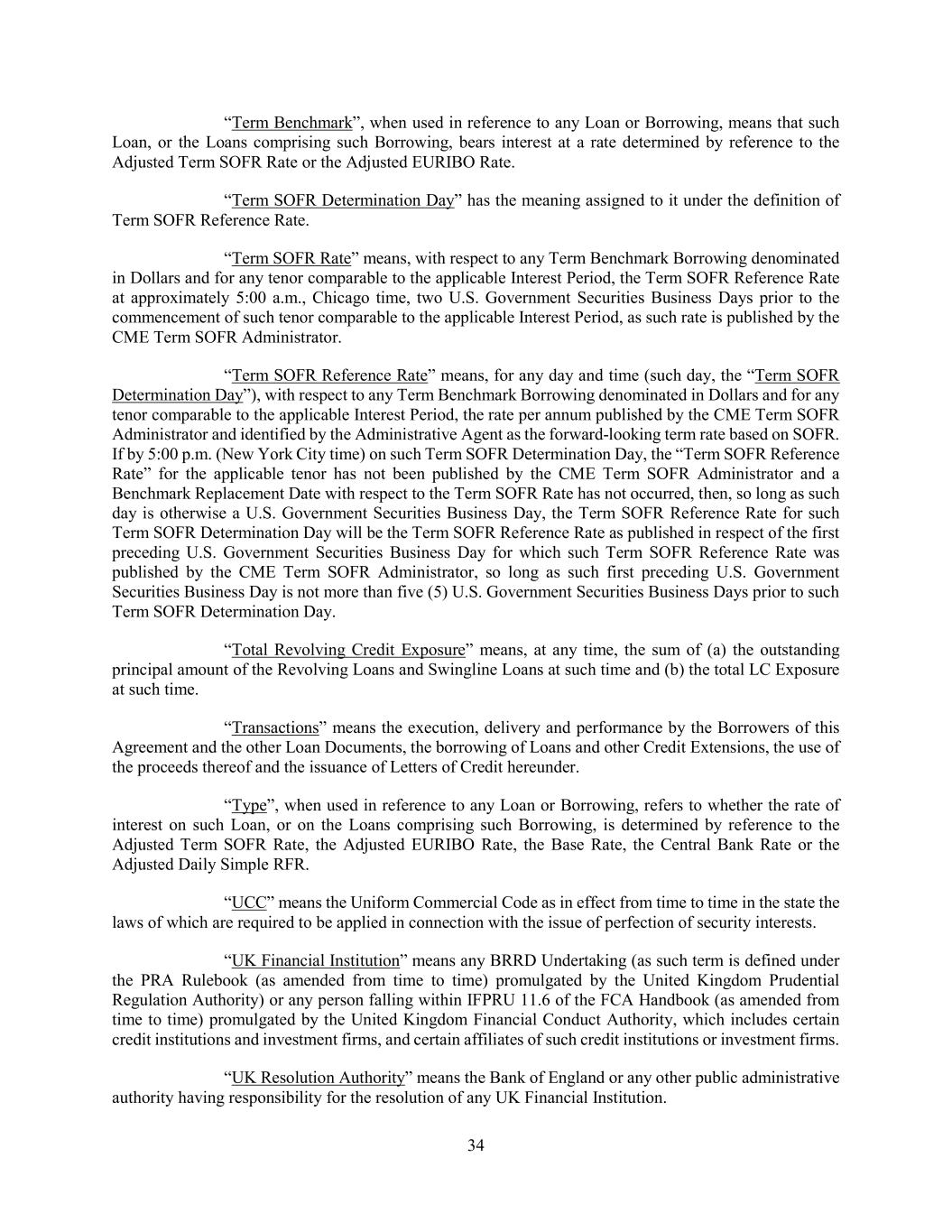 34 “Term Benchmark”, when used in reference to any Loan or Borrowing, means that such Loan, or the Loans comprising such Borrowing, bears interest at a rate determined by reference to the Adjusted Term SOFR Rate or the Adjusted EURIBO Rate. “Term SOFR Determination Day” has the meaning assigned to it under the definition of Term SOFR Reference Rate. “Term SOFR Rate” means, with respect to any Term Benchmark Borrowing denominated in Dollars and for any tenor comparable to the applicable Interest Period, the Term SOFR Reference Rate at approximately 5:00 a.m., Chicago time, two U.S. Government Securities Business Days prior to the commencement of such tenor comparable to the applicable Interest Period, as such rate is published by the CME Term SOFR Administrator. “Term SOFR Reference Rate” means, for any day and time (such day, the “Term SOFR Determination Day”), with respect to any Term Benchmark Borrowing denominated in Dollars and for any tenor comparable to the applicable Interest Period, the rate per annum published by the CME Term SOFR Administrator and identified by the Administrative Agent as the forward-looking term rate based on SOFR. If by 5:00 p.m. (New York City time) on such Term SOFR Determination Day, the “Term SOFR Reference Rate” for the applicable tenor has not been published by the CME Term SOFR Administrator and a Benchmark Replacement Date with respect to the Term SOFR Rate has not occurred, then, so long as such day is otherwise a U.S. Government Securities Business Day, the Term SOFR Reference Rate for such Term SOFR Determination Day will be the Term SOFR Reference Rate as published in respect of the first preceding U.S. Government Securities Business Day for which such Term SOFR Reference Rate was published by the CME Term SOFR Administrator, so long as such first preceding U.S. Government Securities Business Day is not more than five (5) U.S. Government Securities Business Days prior to such Term SOFR Determination Day. “Total Revolving Credit Exposure” means, at any time, the sum of (a) the outstanding principal amount of the Revolving Loans and Swingline Loans at such time and (b) the total LC Exposure at such time. “Transactions” means the execution, delivery and performance by the Borrowers of this Agreement and the other Loan Documents, the borrowing of Loans and other Credit Extensions, the use of the proceeds thereof and the issuance of Letters of Credit hereunder. “Type”, when used in reference to any Loan or Borrowing, refers to whether the rate of interest on such Loan, or on the Loans comprising such Borrowing, is determined by reference to the Adjusted Term SOFR Rate, the Adjusted EURIBO Rate, the Base Rate, the Central Bank Rate or the Adjusted Daily Simple RFR. “UCC” means the Uniform Commercial Code as in effect from time to time in the state the laws of which are required to be applied in connection with the issue of perfection of security interests. “UK Financial Institution” means any BRRD Undertaking (as such term is defined under the PRA Rulebook (as amended from time to time) promulgated by the United Kingdom Prudential Regulation Authority) or any person falling within IFPRU 11.6 of the FCA Handbook (as amended from time to time) promulgated by the United Kingdom Financial Conduct Authority, which includes certain credit institutions and investment firms, and certain affiliates of such credit institutions or investment firms. “UK Resolution Authority” means the Bank of England or any other public administrative authority having responsibility for the resolution of any UK Financial Institution.