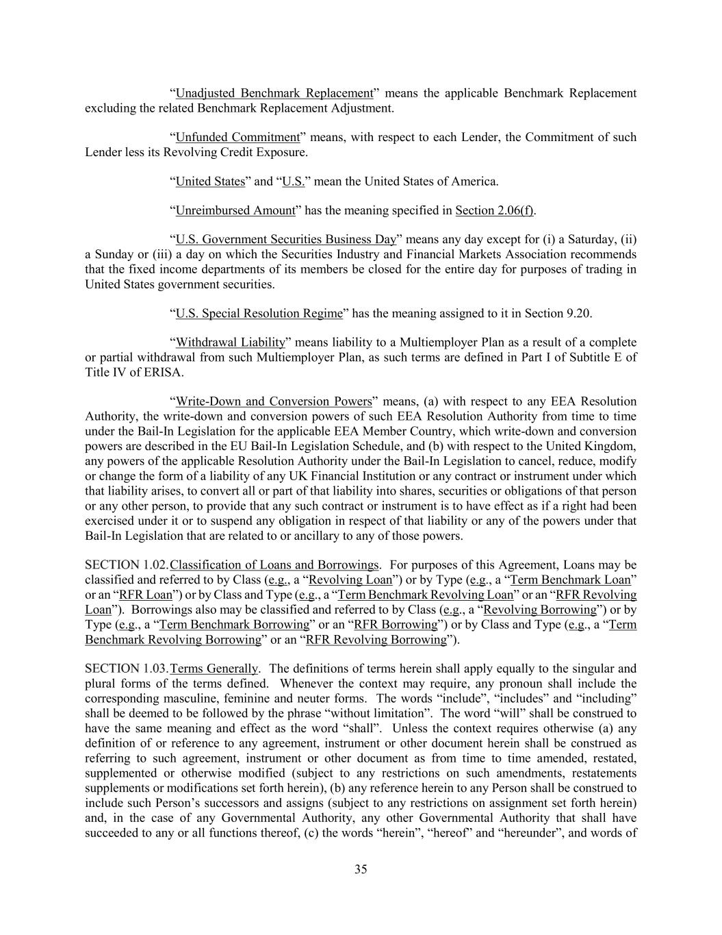 35 “Unadjusted Benchmark Replacement” means the applicable Benchmark Replacement excluding the related Benchmark Replacement Adjustment. “Unfunded Commitment” means, with respect to each Lender, the Commitment of such Lender less its Revolving Credit Exposure. “United States” and “U.S.” mean the United States of America. “Unreimbursed Amount” has the meaning specified in Section 2.06(f). “U.S. Government Securities Business Day” means any day except for (i) a Saturday, (ii) a Sunday or (iii) a day on which the Securities Industry and Financial Markets Association recommends that the fixed income departments of its members be closed for the entire day for purposes of trading in United States government securities. “U.S. Special Resolution Regime” has the meaning assigned to it in Section 9.20. “Withdrawal Liability” means liability to a Multiemployer Plan as a result of a complete or partial withdrawal from such Multiemployer Plan, as such terms are defined in Part I of Subtitle E of Title IV of ERISA. “Write-Down and Conversion Powers” means, (a) with respect to any EEA Resolution Authority, the write-down and conversion powers of such EEA Resolution Authority from time to time under the Bail-In Legislation for the applicable EEA Member Country, which write-down and conversion powers are described in the EU Bail-In Legislation Schedule, and (b) with respect to the United Kingdom, any powers of the applicable Resolution Authority under the Bail-In Legislation to cancel, reduce, modify or change the form of a liability of any UK Financial Institution or any contract or instrument under which that liability arises, to convert all or part of that liability into shares, securities or obligations of that person or any other person, to provide that any such contract or instrument is to have effect as if a right had been exercised under it or to suspend any obligation in respect of that liability or any of the powers under that Bail-In Legislation that are related to or ancillary to any of those powers. Classification of Loans and Borrowings. For purposes of this Agreement, Loans may be classified and referred to by Class (e.g., a “Revolving Loan”) or by Type (e.g., a “Term Benchmark Loan” or an “RFR Loan”) or by Class and Type (e.g., a “Term Benchmark Revolving Loan” or an “RFR Revolving Loan”). Borrowings also may be classified and referred to by Class (e.g., a “Revolving Borrowing”) or by Type (e.g., a “Term Benchmark Borrowing” or an “RFR Borrowing”) or by Class and Type (e.g., a “Term Benchmark Revolving Borrowing” or an “RFR Revolving Borrowing”). Terms Generally. The definitions of terms herein shall apply equally to the singular and plural forms of the terms defined. Whenever the context may require, any pronoun shall include the corresponding masculine, feminine and neuter forms. The words “include”, “includes” and “including” shall be deemed to be followed by the phrase “without limitation”. The word “will” shall be construed to have the same meaning and effect as the word “shall”. Unless the context requires otherwise (a) any definition of or reference to any agreement, instrument or other document herein shall be construed as referring to such agreement, instrument or other document as from time to time amended, restated, supplemented or otherwise modified (subject to any restrictions on such amendments, restatements supplements or modifications set forth herein), (b) any reference herein to any Person shall be construed to include such Person’s successors and assigns (subject to any restrictions on assignment set forth herein) and, in the case of any Governmental Authority, any other Governmental Authority that shall have succeeded to any or all functions thereof, (c) the words “herein”, “hereof” and “hereunder”, and words of