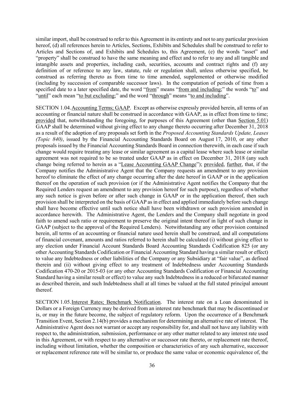 36 similar import, shall be construed to refer to this Agreement in its entirety and not to any particular provision hereof, (d) all references herein to Articles, Sections, Exhibits and Schedules shall be construed to refer to Articles and Sections of, and Exhibits and Schedules to, this Agreement, (e) the words “asset” and “property” shall be construed to have the same meaning and effect and to refer to any and all tangible and intangible assets and properties, including cash, securities, accounts and contract rights and (f) any definition of or reference to any law, statute, rule or regulation shall, unless otherwise specified, be construed as referring thereto as from time to time amended, supplemented or otherwise modified (including by succession of comparable successor laws). In the computation of periods of time from a specified date to a later specified date, the word “from” means “from and including;” the words “to” and “until” each mean “to but excluding;” and the word “through” means “to and including”. Accounting Terms; GAAP. Except as otherwise expressly provided herein, all terms of an accounting or financial nature shall be construed in accordance with GAAP, as in effect from time to time; provided that, notwithstanding the foregoing, for purposes of this Agreement (other than Section 5.01) GAAP shall be determined without giving effect to any change thereto occurring after December 31, 2018 as a result of the adoption of any proposals set forth in the Proposed Accounting Standards Update, Leases (Topic 840), issued by the Financial Accounting Standards Board on August 17, 2010, or any other proposals issued by the Financial Accounting Standards Board in connection therewith, in each case if such change would require treating any lease or similar agreement as a capital lease where such lease or similar agreement was not required to be so treated under GAAP as in effect on December 31, 2018 (any such change being referred to herein as a “Lease Accounting GAAP Change”); provided, further, that, if the Company notifies the Administrative Agent that the Company requests an amendment to any provision hereof to eliminate the effect of any change occurring after the date hereof in GAAP or in the application thereof on the operation of such provision (or if the Administrative Agent notifies the Company that the Required Lenders request an amendment to any provision hereof for such purpose), regardless of whether any such notice is given before or after such change in GAAP or in the application thereof, then such provision shall be interpreted on the basis of GAAP as in effect and applied immediately before such change shall have become effective until such notice shall have been withdrawn or such provision amended in accordance herewith. The Administrative Agent, the Lenders and the Company shall negotiate in good faith to amend such ratio or requirement to preserve the original intent thereof in light of such change in GAAP (subject to the approval of the Required Lenders). Notwithstanding any other provision contained herein, all terms of an accounting or financial nature used herein shall be construed, and all computations of financial covenant, amounts and ratios referred to herein shall be calculated (i) without giving effect to any election under Financial Account Standards Board Accounting Standards Codification 825 (or any other Accounting Standards Codification or Financial Accounting Standard having a similar result or effect) to value any Indebtedness or other liabilities of the Company or any Subsidiary at “fair value”, as defined therein and (ii) without giving effect to any treatment of Indebtedness under Accounting Standards Codification 470-20 or 2015-03 (or any other Accounting Standards Codification or Financial Accounting Standard having a similar result or effect) to value any such Indebtedness in a reduced or bifurcated manner as described therein, and such Indebtedness shall at all times be valued at the full stated principal amount thereof. Interest Rates; Benchmark Notification. The interest rate on a Loan denominated in Dollars or a Foreign Currency may be derived from an interest rate benchmark that may be discontinued or is, or may in the future become, the subject of regulatory reform. Upon the occurrence of a Benchmark Transition Event, Section 2.14(b) provides a mechanism for determining an alternative rate of interest. The Administrative Agent does not warrant or accept any responsibility for, and shall not have any liability with respect to, the administration, submission, performance or any other matter related to any interest rate used in this Agreement, or with respect to any alternative or successor rate thereto, or replacement rate thereof, including without limitation, whether the composition or characteristics of any such alternative, successor or replacement reference rate will be similar to, or produce the same value or economic equivalence of, the