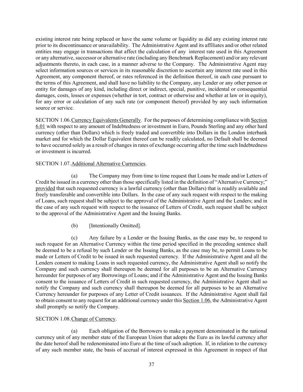 37 existing interest rate being replaced or have the same volume or liquidity as did any existing interest rate prior to its discontinuance or unavailability. The Administrative Agent and its affiliates and/or other related entities may engage in transactions that affect the calculation of any interest rate used in this Agreement or any alternative, successor or alternative rate (including any Benchmark Replacement) and/or any relevant adjustments thereto, in each case, in a manner adverse to the Company. The Administrative Agent may select information sources or services in its reasonable discretion to ascertain any interest rate used in this Agreement, any component thereof, or rates referenced in the definition thereof, in each case pursuant to the terms of this Agreement, and shall have no liability to the Company, any Lender or any other person or entity for damages of any kind, including direct or indirect, special, punitive, incidental or consequential damages, costs, losses or expenses (whether in tort, contract or otherwise and whether at law or in equity), for any error or calculation of any such rate (or component thereof) provided by any such information source or service. Currency Equivalents Generally. For the purposes of determining compliance with Section 6.01 with respect to any amount of Indebtedness or investment in Euro, Pounds Sterling and any other hard currency (other than Dollars) which is freely traded and convertible into Dollars in the London interbank market and for which the Dollar Equivalent thereof can be readily calculated, no Default shall be deemed to have occurred solely as a result of changes in rates of exchange occurring after the time such Indebtedness or investment is incurred. Additional Alternative Currencies. (a) The Company may from time to time request that Loans be made and/or Letters of Credit be issued in a currency other than those specifically listed in the definition of “Alternative Currency;” provided that such requested currency is a lawful currency (other than Dollars) that is readily available and freely transferable and convertible into Dollars. In the case of any such request with respect to the making of Loans, such request shall be subject to the approval of the Administrative Agent and the Lenders; and in the case of any such request with respect to the issuance of Letters of Credit, such request shall be subject to the approval of the Administrative Agent and the Issuing Banks. (b) [Intentionally Omitted]. (c) Any failure by a Lender or the Issuing Banks, as the case may be, to respond to such request for an Alternative Currency within the time period specified in the preceding sentence shall be deemed to be a refusal by such Lender or the Issuing Banks, as the case may be, to permit Loans to be made or Letters of Credit to be issued in such requested currency. If the Administrative Agent and all the Lenders consent to making Loans in such requested currency, the Administrative Agent shall so notify the Company and such currency shall thereupon be deemed for all purposes to be an Alternative Currency hereunder for purposes of any Borrowings of Loans; and if the Administrative Agent and the Issuing Banks consent to the issuance of Letters of Credit in such requested currency, the Administrative Agent shall so notify the Company and such currency shall thereupon be deemed for all purposes to be an Alternative Currency hereunder for purposes of any Letter of Credit issuances. If the Administrative Agent shall fail to obtain consent to any request for an additional currency under this Section 1.06, the Administrative Agent shall promptly so notify the Company. Change of Currency. (a) Each obligation of the Borrowers to make a payment denominated in the national currency unit of any member state of the European Union that adopts the Euro as its lawful currency after the date hereof shall be redenominated into Euro at the time of such adoption. If, in relation to the currency of any such member state, the basis of accrual of interest expressed in this Agreement in respect of that