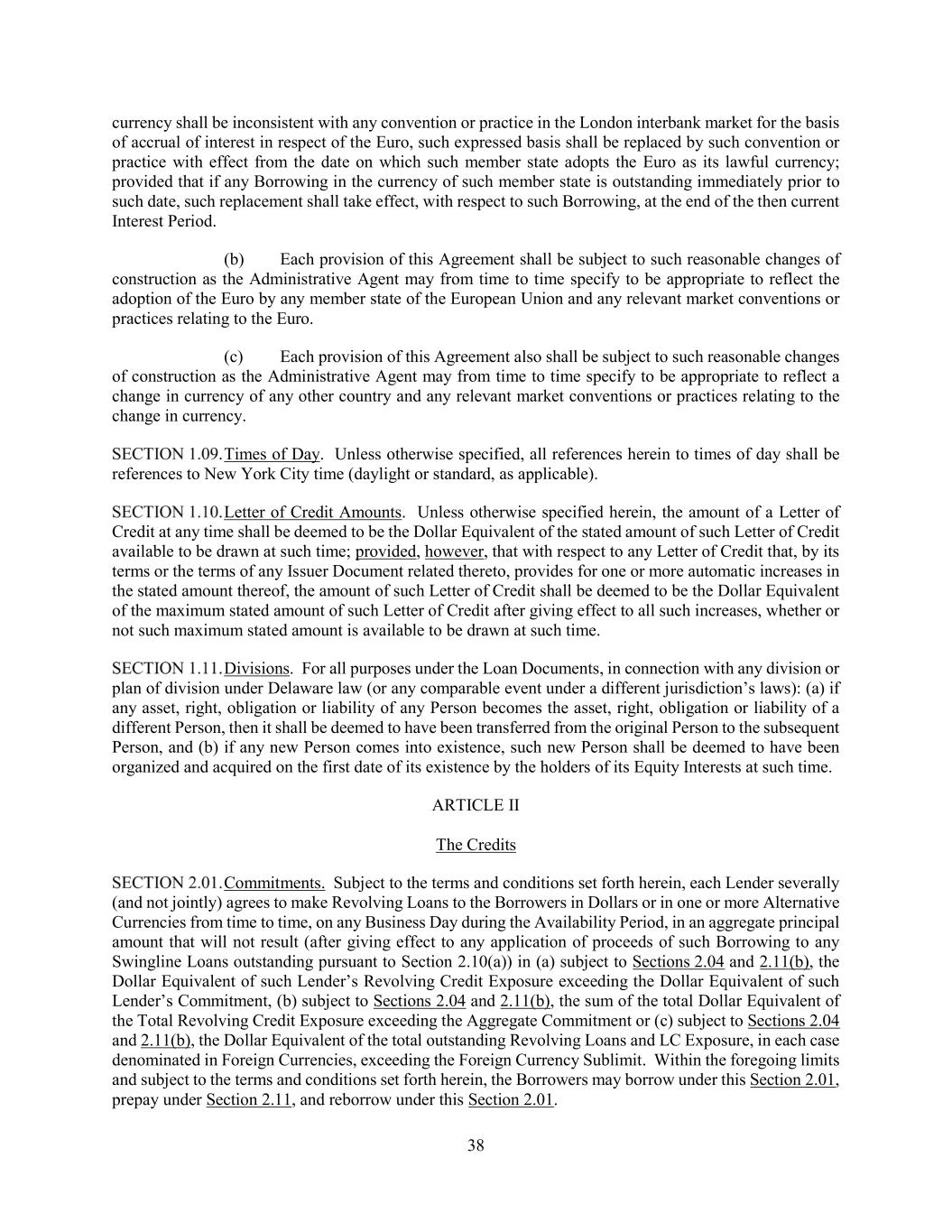 38 currency shall be inconsistent with any convention or practice in the London interbank market for the basis of accrual of interest in respect of the Euro, such expressed basis shall be replaced by such convention or practice with effect from the date on which such member state adopts the Euro as its lawful currency; provided that if any Borrowing in the currency of such member state is outstanding immediately prior to such date, such replacement shall take effect, with respect to such Borrowing, at the end of the then current Interest Period. (b) Each provision of this Agreement shall be subject to such reasonable changes of construction as the Administrative Agent may from time to time specify to be appropriate to reflect the adoption of the Euro by any member state of the European Union and any relevant market conventions or practices relating to the Euro. (c) Each provision of this Agreement also shall be subject to such reasonable changes of construction as the Administrative Agent may from time to time specify to be appropriate to reflect a change in currency of any other country and any relevant market conventions or practices relating to the change in currency. Times of Day. Unless otherwise specified, all references herein to times of day shall be references to New York City time (daylight or standard, as applicable). Letter of Credit Amounts. Unless otherwise specified herein, the amount of a Letter of Credit at any time shall be deemed to be the Dollar Equivalent of the stated amount of such Letter of Credit available to be drawn at such time; provided, however, that with respect to any Letter of Credit that, by its terms or the terms of any Issuer Document related thereto, provides for one or more automatic increases in the stated amount thereof, the amount of such Letter of Credit shall be deemed to be the Dollar Equivalent of the maximum stated amount of such Letter of Credit after giving effect to all such increases, whether or not such maximum stated amount is available to be drawn at such time. Divisions. For all purposes under the Loan Documents, in connection with any division or plan of division under Delaware law (or any comparable event under a different jurisdiction’s laws): (a) if any asset, right, obligation or liability of any Person becomes the asset, right, obligation or liability of a different Person, then it shall be deemed to have been transferred from the original Person to the subsequent Person, and (b) if any new Person comes into existence, such new Person shall be deemed to have been organized and acquired on the first date of its existence by the holders of its Equity Interests at such time. ARTICLE II The Credits Commitments. Subject to the terms and conditions set forth herein, each Lender severally (and not jointly) agrees to make Revolving Loans to the Borrowers in Dollars or in one or more Alternative Currencies from time to time, on any Business Day during the Availability Period, in an aggregate principal amount that will not result (after giving effect to any application of proceeds of such Borrowing to any Swingline Loans outstanding pursuant to Section 2.10(a)) in (a) subject to Sections 2.04 and 2.11(b), the Dollar Equivalent of such Lender’s Revolving Credit Exposure exceeding the Dollar Equivalent of such Lender’s Commitment, (b) subject to Sections 2.04 and 2.11(b), the sum of the total Dollar Equivalent of the Total Revolving Credit Exposure exceeding the Aggregate Commitment or (c) subject to Sections 2.04 and 2.11(b), the Dollar Equivalent of the total outstanding Revolving Loans and LC Exposure, in each case denominated in Foreign Currencies, exceeding the Foreign Currency Sublimit. Within the foregoing limits and subject to the terms and conditions set forth herein, the Borrowers may borrow under this Section 2.01, prepay under Section 2.11, and reborrow under this Section 2.01.