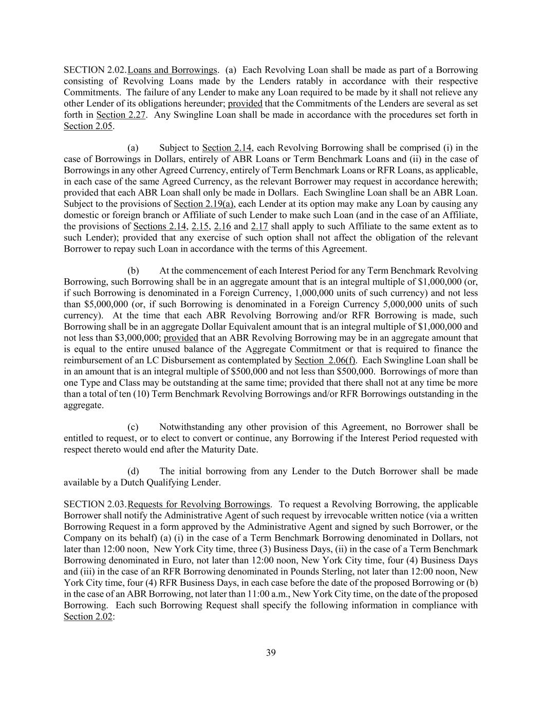 39 Loans and Borrowings. (a) Each Revolving Loan shall be made as part of a Borrowing consisting of Revolving Loans made by the Lenders ratably in accordance with their respective Commitments. The failure of any Lender to make any Loan required to be made by it shall not relieve any other Lender of its obligations hereunder; provided that the Commitments of the Lenders are several as set forth in Section 2.27. Any Swingline Loan shall be made in accordance with the procedures set forth in Section 2.05. (a) Subject to Section 2.14, each Revolving Borrowing shall be comprised (i) in the case of Borrowings in Dollars, entirely of ABR Loans or Term Benchmark Loans and (ii) in the case of Borrowings in any other Agreed Currency, entirely of Term Benchmark Loans or RFR Loans, as applicable, in each case of the same Agreed Currency, as the relevant Borrower may request in accordance herewith; provided that each ABR Loan shall only be made in Dollars. Each Swingline Loan shall be an ABR Loan. Subject to the provisions of Section 2.19(a), each Lender at its option may make any Loan by causing any domestic or foreign branch or Affiliate of such Lender to make such Loan (and in the case of an Affiliate, the provisions of Sections 2.14, 2.15, 2.16 and 2.17 shall apply to such Affiliate to the same extent as to such Lender); provided that any exercise of such option shall not affect the obligation of the relevant Borrower to repay such Loan in accordance with the terms of this Agreement. (b) At the commencement of each Interest Period for any Term Benchmark Revolving Borrowing, such Borrowing shall be in an aggregate amount that is an integral multiple of $1,000,000 (or, if such Borrowing is denominated in a Foreign Currency, 1,000,000 units of such currency) and not less than $5,000,000 (or, if such Borrowing is denominated in a Foreign Currency 5,000,000 units of such currency). At the time that each ABR Revolving Borrowing and/or RFR Borrowing is made, such Borrowing shall be in an aggregate Dollar Equivalent amount that is an integral multiple of $1,000,000 and not less than $3,000,000; provided that an ABR Revolving Borrowing may be in an aggregate amount that is equal to the entire unused balance of the Aggregate Commitment or that is required to finance the reimbursement of an LC Disbursement as contemplated by Section 2.06(f). Each Swingline Loan shall be in an amount that is an integral multiple of $500,000 and not less than $500,000. Borrowings of more than one Type and Class may be outstanding at the same time; provided that there shall not at any time be more than a total of ten (10) Term Benchmark Revolving Borrowings and/or RFR Borrowings outstanding in the aggregate. (c) Notwithstanding any other provision of this Agreement, no Borrower shall be entitled to request, or to elect to convert or continue, any Borrowing if the Interest Period requested with respect thereto would end after the Maturity Date. (d) The initial borrowing from any Lender to the Dutch Borrower shall be made available by a Dutch Qualifying Lender. Requests for Revolving Borrowings. To request a Revolving Borrowing, the applicable Borrower shall notify the Administrative Agent of such request by irrevocable written notice (via a written Borrowing Request in a form approved by the Administrative Agent and signed by such Borrower, or the Company on its behalf) (a) (i) in the case of a Term Benchmark Borrowing denominated in Dollars, not later than 12:00 noon, New York City time, three (3) Business Days, (ii) in the case of a Term Benchmark Borrowing denominated in Euro, not later than 12:00 noon, New York City time, four (4) Business Days and (iii) in the case of an RFR Borrowing denominated in Pounds Sterling, not later than 12:00 noon, New York City time, four (4) RFR Business Days, in each case before the date of the proposed Borrowing or (b) in the case of an ABR Borrowing, not later than 11:00 a.m., New York City time, on the date of the proposed Borrowing. Each such Borrowing Request shall specify the following information in compliance with Section 2.02: