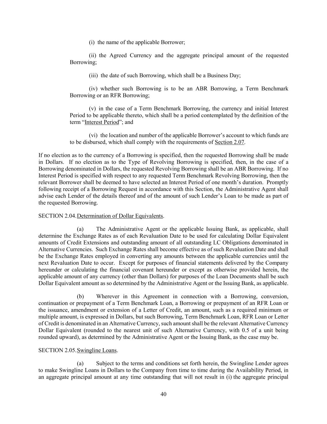 40 (i) the name of the applicable Borrower; (ii) the Agreed Currency and the aggregate principal amount of the requested Borrowing; (iii) the date of such Borrowing, which shall be a Business Day; (iv) whether such Borrowing is to be an ABR Borrowing, a Term Benchmark Borrowing or an RFR Borrowing; (v) in the case of a Term Benchmark Borrowing, the currency and initial Interest Period to be applicable thereto, which shall be a period contemplated by the definition of the term “Interest Period”; and (vi) the location and number of the applicable Borrower’s account to which funds are to be disbursed, which shall comply with the requirements of Section 2.07. If no election as to the currency of a Borrowing is specified, then the requested Borrowing shall be made in Dollars. If no election as to the Type of Revolving Borrowing is specified, then, in the case of a Borrowing denominated in Dollars, the requested Revolving Borrowing shall be an ABR Borrowing. If no Interest Period is specified with respect to any requested Term Benchmark Revolving Borrowing, then the relevant Borrower shall be deemed to have selected an Interest Period of one month’s duration. Promptly following receipt of a Borrowing Request in accordance with this Section, the Administrative Agent shall advise each Lender of the details thereof and of the amount of such Lender’s Loan to be made as part of the requested Borrowing. Determination of Dollar Equivalents. (a) The Administrative Agent or the applicable Issuing Bank, as applicable, shall determine the Exchange Rates as of each Revaluation Date to be used for calculating Dollar Equivalent amounts of Credit Extensions and outstanding amount of all outstanding LC Obligations denominated in Alternative Currencies. Such Exchange Rates shall become effective as of such Revaluation Date and shall be the Exchange Rates employed in converting any amounts between the applicable currencies until the next Revaluation Date to occur. Except for purposes of financial statements delivered by the Company hereunder or calculating the financial covenant hereunder or except as otherwise provided herein, the applicable amount of any currency (other than Dollars) for purposes of the Loan Documents shall be such Dollar Equivalent amount as so determined by the Administrative Agent or the Issuing Bank, as applicable. (b) Wherever in this Agreement in connection with a Borrowing, conversion, continuation or prepayment of a Term Benchmark Loan, a Borrowing or prepayment of an RFR Loan or the issuance, amendment or extension of a Letter of Credit, an amount, such as a required minimum or multiple amount, is expressed in Dollars, but such Borrowing, Term Benchmark Loan, RFR Loan or Letter of Credit is denominated in an Alternative Currency, such amount shall be the relevant Alternative Currency Dollar Equivalent (rounded to the nearest unit of such Alternative Currency, with 0.5 of a unit being rounded upward), as determined by the Administrative Agent or the Issuing Bank, as the case may be. Swingline Loans. (a) Subject to the terms and conditions set forth herein, the Swingline Lender agrees to make Swingline Loans in Dollars to the Company from time to time during the Availability Period, in an aggregate principal amount at any time outstanding that will not result in (i) the aggregate principal