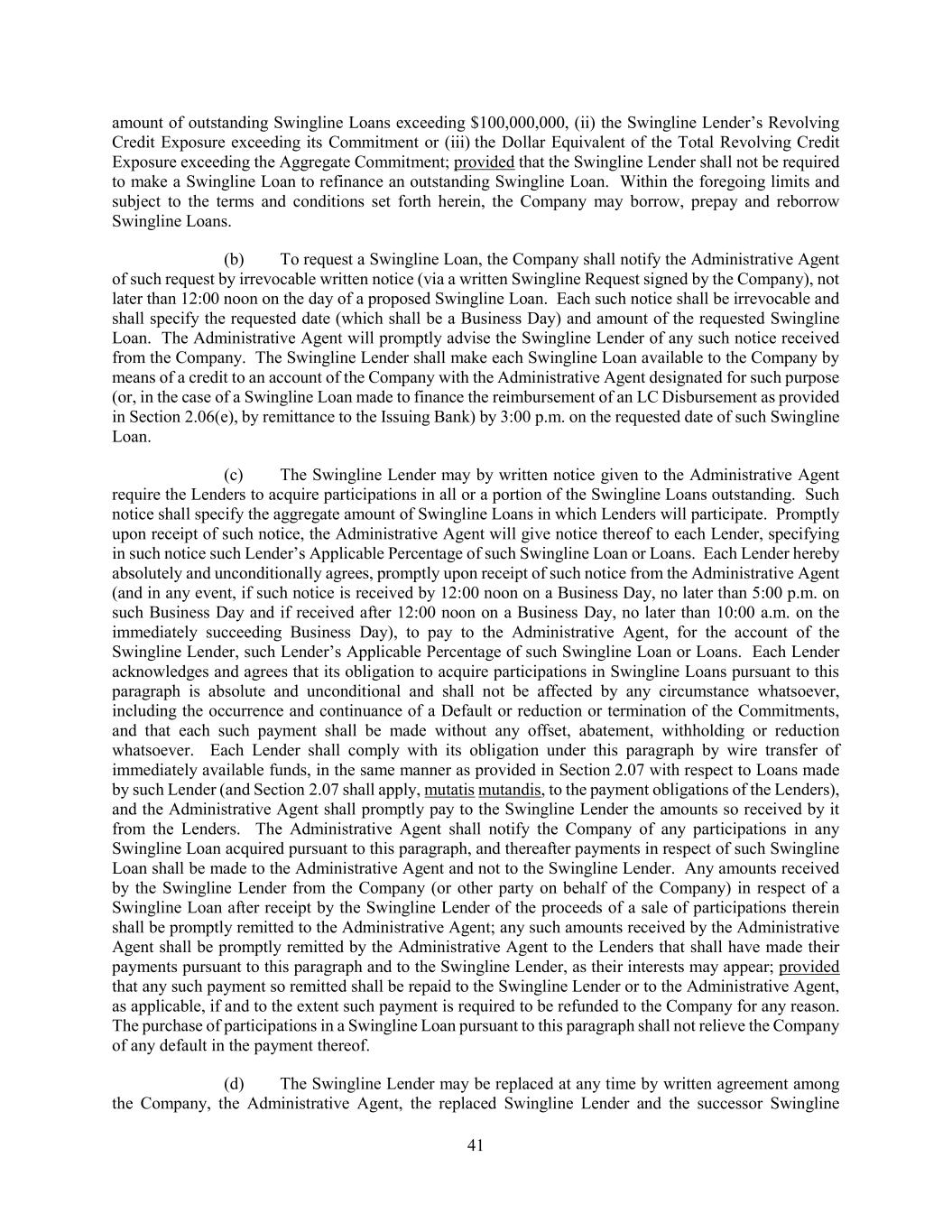 41 amount of outstanding Swingline Loans exceeding $100,000,000, (ii) the Swingline Lender’s Revolving Credit Exposure exceeding its Commitment or (iii) the Dollar Equivalent of the Total Revolving Credit Exposure exceeding the Aggregate Commitment; provided that the Swingline Lender shall not be required to make a Swingline Loan to refinance an outstanding Swingline Loan. Within the foregoing limits and subject to the terms and conditions set forth herein, the Company may borrow, prepay and reborrow Swingline Loans. (b) To request a Swingline Loan, the Company shall notify the Administrative Agent of such request by irrevocable written notice (via a written Swingline Request signed by the Company), not later than 12:00 noon on the day of a proposed Swingline Loan. Each such notice shall be irrevocable and shall specify the requested date (which shall be a Business Day) and amount of the requested Swingline Loan. The Administrative Agent will promptly advise the Swingline Lender of any such notice received from the Company. The Swingline Lender shall make each Swingline Loan available to the Company by means of a credit to an account of the Company with the Administrative Agent designated for such purpose (or, in the case of a Swingline Loan made to finance the reimbursement of an LC Disbursement as provided in Section 2.06(e), by remittance to the Issuing Bank) by 3:00 p.m. on the requested date of such Swingline Loan. (c) The Swingline Lender may by written notice given to the Administrative Agent require the Lenders to acquire participations in all or a portion of the Swingline Loans outstanding. Such notice shall specify the aggregate amount of Swingline Loans in which Lenders will participate. Promptly upon receipt of such notice, the Administrative Agent will give notice thereof to each Lender, specifying in such notice such Lender’s Applicable Percentage of such Swingline Loan or Loans. Each Lender hereby absolutely and unconditionally agrees, promptly upon receipt of such notice from the Administrative Agent (and in any event, if such notice is received by 12:00 noon on a Business Day, no later than 5:00 p.m. on such Business Day and if received after 12:00 noon on a Business Day, no later than 10:00 a.m. on the immediately succeeding Business Day), to pay to the Administrative Agent, for the account of the Swingline Lender, such Lender’s Applicable Percentage of such Swingline Loan or Loans. Each Lender acknowledges and agrees that its obligation to acquire participations in Swingline Loans pursuant to this paragraph is absolute and unconditional and shall not be affected by any circumstance whatsoever, including the occurrence and continuance of a Default or reduction or termination of the Commitments, and that each such payment shall be made without any offset, abatement, withholding or reduction whatsoever. Each Lender shall comply with its obligation under this paragraph by wire transfer of immediately available funds, in the same manner as provided in Section 2.07 with respect to Loans made by such Lender (and Section 2.07 shall apply, mutatis mutandis, to the payment obligations of the Lenders), and the Administrative Agent shall promptly pay to the Swingline Lender the amounts so received by it from the Lenders. The Administrative Agent shall notify the Company of any participations in any Swingline Loan acquired pursuant to this paragraph, and thereafter payments in respect of such Swingline Loan shall be made to the Administrative Agent and not to the Swingline Lender. Any amounts received by the Swingline Lender from the Company (or other party on behalf of the Company) in respect of a Swingline Loan after receipt by the Swingline Lender of the proceeds of a sale of participations therein shall be promptly remitted to the Administrative Agent; any such amounts received by the Administrative Agent shall be promptly remitted by the Administrative Agent to the Lenders that shall have made their payments pursuant to this paragraph and to the Swingline Lender, as their interests may appear; provided that any such payment so remitted shall be repaid to the Swingline Lender or to the Administrative Agent, as applicable, if and to the extent such payment is required to be refunded to the Company for any reason. The purchase of participations in a Swingline Loan pursuant to this paragraph shall not relieve the Company of any default in the payment thereof. (d) The Swingline Lender may be replaced at any time by written agreement among the Company, the Administrative Agent, the replaced Swingline Lender and the successor Swingline