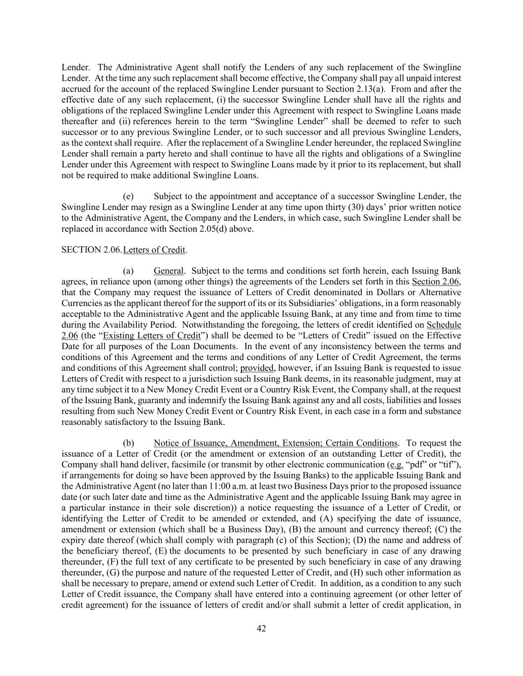 42 Lender. The Administrative Agent shall notify the Lenders of any such replacement of the Swingline Lender. At the time any such replacement shall become effective, the Company shall pay all unpaid interest accrued for the account of the replaced Swingline Lender pursuant to Section 2.13(a). From and after the effective date of any such replacement, (i) the successor Swingline Lender shall have all the rights and obligations of the replaced Swingline Lender under this Agreement with respect to Swingline Loans made thereafter and (ii) references herein to the term “Swingline Lender” shall be deemed to refer to such successor or to any previous Swingline Lender, or to such successor and all previous Swingline Lenders, as the context shall require. After the replacement of a Swingline Lender hereunder, the replaced Swingline Lender shall remain a party hereto and shall continue to have all the rights and obligations of a Swingline Lender under this Agreement with respect to Swingline Loans made by it prior to its replacement, but shall not be required to make additional Swingline Loans. (e) Subject to the appointment and acceptance of a successor Swingline Lender, the Swingline Lender may resign as a Swingline Lender at any time upon thirty (30) days’ prior written notice to the Administrative Agent, the Company and the Lenders, in which case, such Swingline Lender shall be replaced in accordance with Section 2.05(d) above. Letters of Credit. (a) General. Subject to the terms and conditions set forth herein, each Issuing Bank agrees, in reliance upon (among other things) the agreements of the Lenders set forth in this Section 2.06, that the Company may request the issuance of Letters of Credit denominated in Dollars or Alternative Currencies as the applicant thereof for the support of its or its Subsidiaries’ obligations, in a form reasonably acceptable to the Administrative Agent and the applicable Issuing Bank, at any time and from time to time during the Availability Period. Notwithstanding the foregoing, the letters of credit identified on Schedule 2.06 (the “Existing Letters of Credit”) shall be deemed to be “Letters of Credit” issued on the Effective Date for all purposes of the Loan Documents. In the event of any inconsistency between the terms and conditions of this Agreement and the terms and conditions of any Letter of Credit Agreement, the terms and conditions of this Agreement shall control; provided, however, if an Issuing Bank is requested to issue Letters of Credit with respect to a jurisdiction such Issuing Bank deems, in its reasonable judgment, may at any time subject it to a New Money Credit Event or a Country Risk Event, the Company shall, at the request of the Issuing Bank, guaranty and indemnify the Issuing Bank against any and all costs, liabilities and losses resulting from such New Money Credit Event or Country Risk Event, in each case in a form and substance reasonably satisfactory to the Issuing Bank. (b) Notice of Issuance, Amendment, Extension; Certain Conditions. To request the issuance of a Letter of Credit (or the amendment or extension of an outstanding Letter of Credit), the Company shall hand deliver, facsimile (or transmit by other electronic communication (e.g. “pdf” or “tif”), if arrangements for doing so have been approved by the Issuing Banks) to the applicable Issuing Bank and the Administrative Agent (no later than 11:00 a.m. at least two Business Days prior to the proposed issuance date (or such later date and time as the Administrative Agent and the applicable Issuing Bank may agree in a particular instance in their sole discretion)) a notice requesting the issuance of a Letter of Credit, or identifying the Letter of Credit to be amended or extended, and (A) specifying the date of issuance, amendment or extension (which shall be a Business Day), (B) the amount and currency thereof; (C) the expiry date thereof (which shall comply with paragraph (c) of this Section); (D) the name and address of the beneficiary thereof, (E) the documents to be presented by such beneficiary in case of any drawing thereunder, (F) the full text of any certificate to be presented by such beneficiary in case of any drawing thereunder, (G) the purpose and nature of the requested Letter of Credit, and (H) such other information as shall be necessary to prepare, amend or extend such Letter of Credit. In addition, as a condition to any such Letter of Credit issuance, the Company shall have entered into a continuing agreement (or other letter of credit agreement) for the issuance of letters of credit and/or shall submit a letter of credit application, in