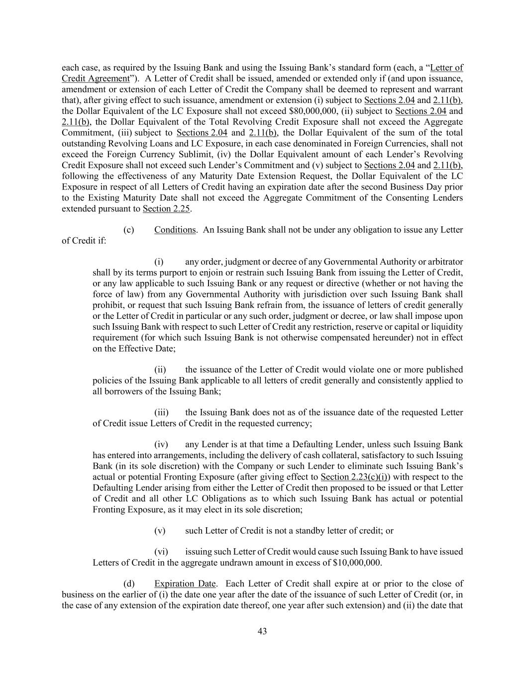 43 each case, as required by the Issuing Bank and using the Issuing Bank’s standard form (each, a “Letter of Credit Agreement”). A Letter of Credit shall be issued, amended or extended only if (and upon issuance, amendment or extension of each Letter of Credit the Company shall be deemed to represent and warrant that), after giving effect to such issuance, amendment or extension (i) subject to Sections 2.04 and 2.11(b), the Dollar Equivalent of the LC Exposure shall not exceed $80,000,000, (ii) subject to Sections 2.04 and 2.11(b), the Dollar Equivalent of the Total Revolving Credit Exposure shall not exceed the Aggregate Commitment, (iii) subject to Sections 2.04 and 2.11(b), the Dollar Equivalent of the sum of the total outstanding Revolving Loans and LC Exposure, in each case denominated in Foreign Currencies, shall not exceed the Foreign Currency Sublimit, (iv) the Dollar Equivalent amount of each Lender’s Revolving Credit Exposure shall not exceed such Lender’s Commitment and (v) subject to Sections 2.04 and 2.11(b), following the effectiveness of any Maturity Date Extension Request, the Dollar Equivalent of the LC Exposure in respect of all Letters of Credit having an expiration date after the second Business Day prior to the Existing Maturity Date shall not exceed the Aggregate Commitment of the Consenting Lenders extended pursuant to Section 2.25. (c) Conditions. An Issuing Bank shall not be under any obligation to issue any Letter of Credit if: (i) any order, judgment or decree of any Governmental Authority or arbitrator shall by its terms purport to enjoin or restrain such Issuing Bank from issuing the Letter of Credit, or any law applicable to such Issuing Bank or any request or directive (whether or not having the force of law) from any Governmental Authority with jurisdiction over such Issuing Bank shall prohibit, or request that such Issuing Bank refrain from, the issuance of letters of credit generally or the Letter of Credit in particular or any such order, judgment or decree, or law shall impose upon such Issuing Bank with respect to such Letter of Credit any restriction, reserve or capital or liquidity requirement (for which such Issuing Bank is not otherwise compensated hereunder) not in effect on the Effective Date; (ii) the issuance of the Letter of Credit would violate one or more published policies of the Issuing Bank applicable to all letters of credit generally and consistently applied to all borrowers of the Issuing Bank; (iii) the Issuing Bank does not as of the issuance date of the requested Letter of Credit issue Letters of Credit in the requested currency; (iv) any Lender is at that time a Defaulting Lender, unless such Issuing Bank has entered into arrangements, including the delivery of cash collateral, satisfactory to such Issuing Bank (in its sole discretion) with the Company or such Lender to eliminate such Issuing Bank’s actual or potential Fronting Exposure (after giving effect to Section 2.23(c)(i)) with respect to the Defaulting Lender arising from either the Letter of Credit then proposed to be issued or that Letter of Credit and all other LC Obligations as to which such Issuing Bank has actual or potential Fronting Exposure, as it may elect in its sole discretion; (v) such Letter of Credit is not a standby letter of credit; or (vi) issuing such Letter of Credit would cause such Issuing Bank to have issued Letters of Credit in the aggregate undrawn amount in excess of $10,000,000. (d) Expiration Date. Each Letter of Credit shall expire at or prior to the close of business on the earlier of (i) the date one year after the date of the issuance of such Letter of Credit (or, in the case of any extension of the expiration date thereof, one year after such extension) and (ii) the date that
