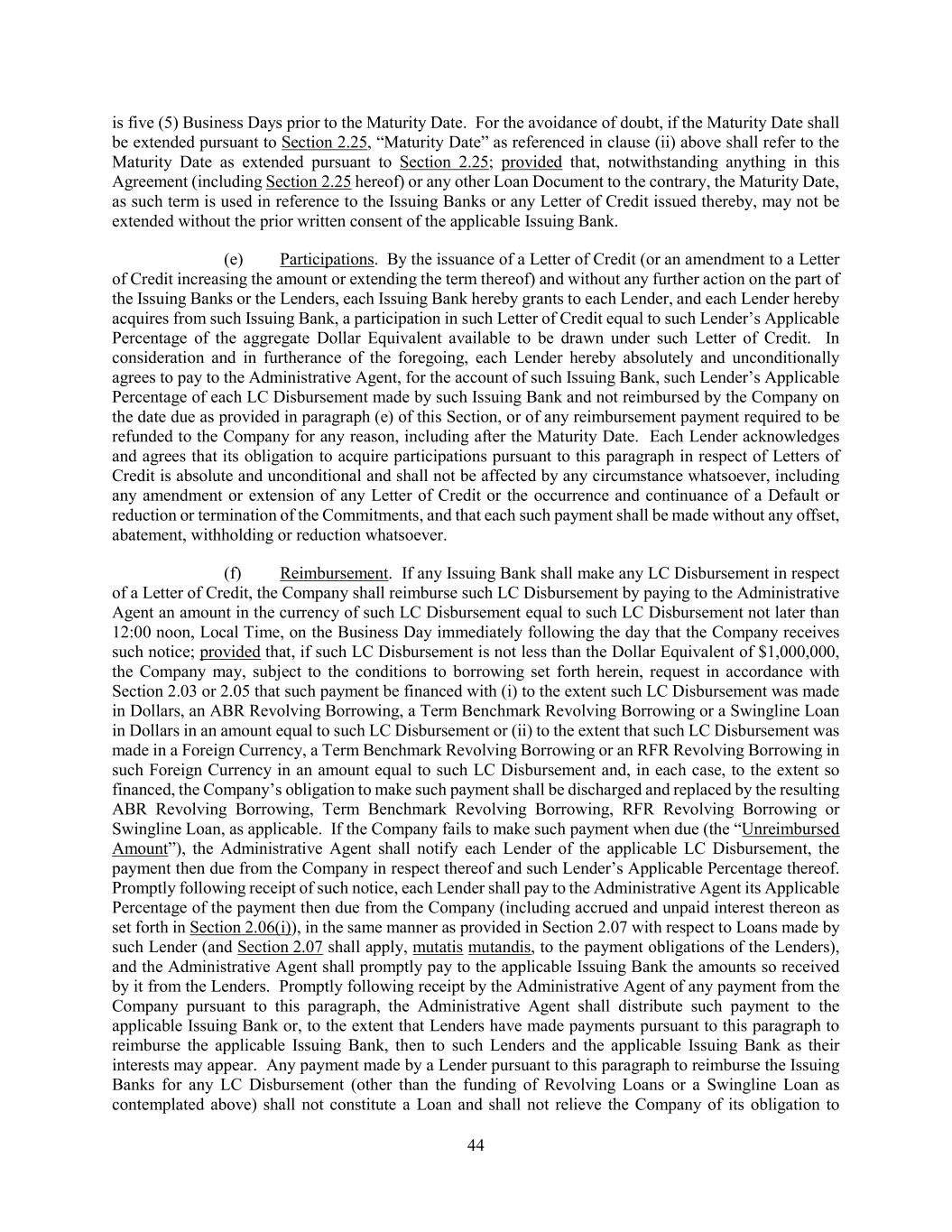 44 is five (5) Business Days prior to the Maturity Date. For the avoidance of doubt, if the Maturity Date shall be extended pursuant to Section 2.25, “Maturity Date” as referenced in clause (ii) above shall refer to the Maturity Date as extended pursuant to Section 2.25; provided that, notwithstanding anything in this Agreement (including Section 2.25 hereof) or any other Loan Document to the contrary, the Maturity Date, as such term is used in reference to the Issuing Banks or any Letter of Credit issued thereby, may not be extended without the prior written consent of the applicable Issuing Bank. (e) Participations. By the issuance of a Letter of Credit (or an amendment to a Letter of Credit increasing the amount or extending the term thereof) and without any further action on the part of the Issuing Banks or the Lenders, each Issuing Bank hereby grants to each Lender, and each Lender hereby acquires from such Issuing Bank, a participation in such Letter of Credit equal to such Lender’s Applicable Percentage of the aggregate Dollar Equivalent available to be drawn under such Letter of Credit. In consideration and in furtherance of the foregoing, each Lender hereby absolutely and unconditionally agrees to pay to the Administrative Agent, for the account of such Issuing Bank, such Lender’s Applicable Percentage of each LC Disbursement made by such Issuing Bank and not reimbursed by the Company on the date due as provided in paragraph (e) of this Section, or of any reimbursement payment required to be refunded to the Company for any reason, including after the Maturity Date. Each Lender acknowledges and agrees that its obligation to acquire participations pursuant to this paragraph in respect of Letters of Credit is absolute and unconditional and shall not be affected by any circumstance whatsoever, including any amendment or extension of any Letter of Credit or the occurrence and continuance of a Default or reduction or termination of the Commitments, and that each such payment shall be made without any offset, abatement, withholding or reduction whatsoever. (f) Reimbursement. If any Issuing Bank shall make any LC Disbursement in respect of a Letter of Credit, the Company shall reimburse such LC Disbursement by paying to the Administrative Agent an amount in the currency of such LC Disbursement equal to such LC Disbursement not later than 12:00 noon, Local Time, on the Business Day immediately following the day that the Company receives such notice; provided that, if such LC Disbursement is not less than the Dollar Equivalent of $1,000,000, the Company may, subject to the conditions to borrowing set forth herein, request in accordance with Section 2.03 or 2.05 that such payment be financed with (i) to the extent such LC Disbursement was made in Dollars, an ABR Revolving Borrowing, a Term Benchmark Revolving Borrowing or a Swingline Loan in Dollars in an amount equal to such LC Disbursement or (ii) to the extent that such LC Disbursement was made in a Foreign Currency, a Term Benchmark Revolving Borrowing or an RFR Revolving Borrowing in such Foreign Currency in an amount equal to such LC Disbursement and, in each case, to the extent so financed, the Company’s obligation to make such payment shall be discharged and replaced by the resulting ABR Revolving Borrowing, Term Benchmark Revolving Borrowing, RFR Revolving Borrowing or Swingline Loan, as applicable. If the Company fails to make such payment when due (the “Unreimbursed Amount”), the Administrative Agent shall notify each Lender of the applicable LC Disbursement, the payment then due from the Company in respect thereof and such Lender’s Applicable Percentage thereof. Promptly following receipt of such notice, each Lender shall pay to the Administrative Agent its Applicable Percentage of the payment then due from the Company (including accrued and unpaid interest thereon as set forth in Section 2.06(i)), in the same manner as provided in Section 2.07 with respect to Loans made by such Lender (and Section 2.07 shall apply, mutatis mutandis, to the payment obligations of the Lenders), and the Administrative Agent shall promptly pay to the applicable Issuing Bank the amounts so received by it from the Lenders. Promptly following receipt by the Administrative Agent of any payment from the Company pursuant to this paragraph, the Administrative Agent shall distribute such payment to the applicable Issuing Bank or, to the extent that Lenders have made payments pursuant to this paragraph to reimburse the applicable Issuing Bank, then to such Lenders and the applicable Issuing Bank as their interests may appear. Any payment made by a Lender pursuant to this paragraph to reimburse the Issuing Banks for any LC Disbursement (other than the funding of Revolving Loans or a Swingline Loan as contemplated above) shall not constitute a Loan and shall not relieve the Company of its obligation to