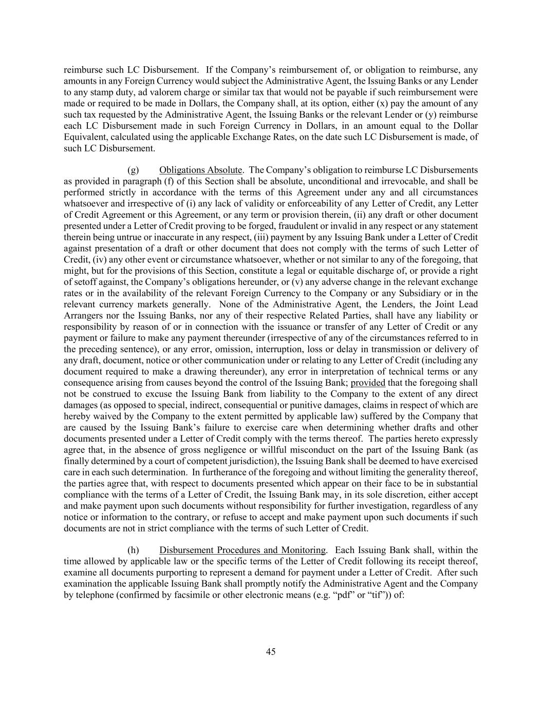 45 reimburse such LC Disbursement. If the Company’s reimbursement of, or obligation to reimburse, any amounts in any Foreign Currency would subject the Administrative Agent, the Issuing Banks or any Lender to any stamp duty, ad valorem charge or similar tax that would not be payable if such reimbursement were made or required to be made in Dollars, the Company shall, at its option, either (x) pay the amount of any such tax requested by the Administrative Agent, the Issuing Banks or the relevant Lender or (y) reimburse each LC Disbursement made in such Foreign Currency in Dollars, in an amount equal to the Dollar Equivalent, calculated using the applicable Exchange Rates, on the date such LC Disbursement is made, of such LC Disbursement. (g) Obligations Absolute. The Company’s obligation to reimburse LC Disbursements as provided in paragraph (f) of this Section shall be absolute, unconditional and irrevocable, and shall be performed strictly in accordance with the terms of this Agreement under any and all circumstances whatsoever and irrespective of (i) any lack of validity or enforceability of any Letter of Credit, any Letter of Credit Agreement or this Agreement, or any term or provision therein, (ii) any draft or other document presented under a Letter of Credit proving to be forged, fraudulent or invalid in any respect or any statement therein being untrue or inaccurate in any respect, (iii) payment by any Issuing Bank under a Letter of Credit against presentation of a draft or other document that does not comply with the terms of such Letter of Credit, (iv) any other event or circumstance whatsoever, whether or not similar to any of the foregoing, that might, but for the provisions of this Section, constitute a legal or equitable discharge of, or provide a right of setoff against, the Company’s obligations hereunder, or (v) any adverse change in the relevant exchange rates or in the availability of the relevant Foreign Currency to the Company or any Subsidiary or in the relevant currency markets generally. None of the Administrative Agent, the Lenders, the Joint Lead Arrangers nor the Issuing Banks, nor any of their respective Related Parties, shall have any liability or responsibility by reason of or in connection with the issuance or transfer of any Letter of Credit or any payment or failure to make any payment thereunder (irrespective of any of the circumstances referred to in the preceding sentence), or any error, omission, interruption, loss or delay in transmission or delivery of any draft, document, notice or other communication under or relating to any Letter of Credit (including any document required to make a drawing thereunder), any error in interpretation of technical terms or any consequence arising from causes beyond the control of the Issuing Bank; provided that the foregoing shall not be construed to excuse the Issuing Bank from liability to the Company to the extent of any direct damages (as opposed to special, indirect, consequential or punitive damages, claims in respect of which are hereby waived by the Company to the extent permitted by applicable law) suffered by the Company that are caused by the Issuing Bank’s failure to exercise care when determining whether drafts and other documents presented under a Letter of Credit comply with the terms thereof. The parties hereto expressly agree that, in the absence of gross negligence or willful misconduct on the part of the Issuing Bank (as finally determined by a court of competent jurisdiction), the Issuing Bank shall be deemed to have exercised care in each such determination. In furtherance of the foregoing and without limiting the generality thereof, the parties agree that, with respect to documents presented which appear on their face to be in substantial compliance with the terms of a Letter of Credit, the Issuing Bank may, in its sole discretion, either accept and make payment upon such documents without responsibility for further investigation, regardless of any notice or information to the contrary, or refuse to accept and make payment upon such documents if such documents are not in strict compliance with the terms of such Letter of Credit. (h) Disbursement Procedures and Monitoring. Each Issuing Bank shall, within the time allowed by applicable law or the specific terms of the Letter of Credit following its receipt thereof, examine all documents purporting to represent a demand for payment under a Letter of Credit. After such examination the applicable Issuing Bank shall promptly notify the Administrative Agent and the Company by telephone (confirmed by facsimile or other electronic means (e.g. “pdf” or “tif”)) of: