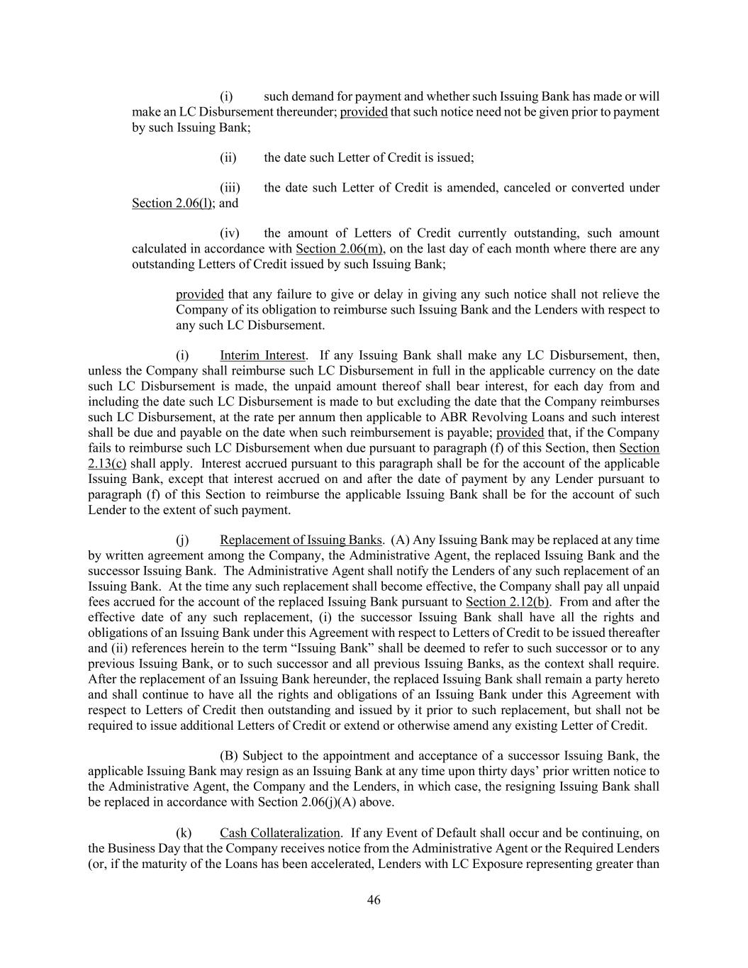 46 (i) such demand for payment and whether such Issuing Bank has made or will make an LC Disbursement thereunder; provided that such notice need not be given prior to payment by such Issuing Bank; (ii) the date such Letter of Credit is issued; (iii) the date such Letter of Credit is amended, canceled or converted under Section 2.06(l); and (iv) the amount of Letters of Credit currently outstanding, such amount calculated in accordance with Section 2.06(m), on the last day of each month where there are any outstanding Letters of Credit issued by such Issuing Bank; provided that any failure to give or delay in giving any such notice shall not relieve the Company of its obligation to reimburse such Issuing Bank and the Lenders with respect to any such LC Disbursement. (i) Interim Interest. If any Issuing Bank shall make any LC Disbursement, then, unless the Company shall reimburse such LC Disbursement in full in the applicable currency on the date such LC Disbursement is made, the unpaid amount thereof shall bear interest, for each day from and including the date such LC Disbursement is made to but excluding the date that the Company reimburses such LC Disbursement, at the rate per annum then applicable to ABR Revolving Loans and such interest shall be due and payable on the date when such reimbursement is payable; provided that, if the Company fails to reimburse such LC Disbursement when due pursuant to paragraph (f) of this Section, then Section 2.13(c) shall apply. Interest accrued pursuant to this paragraph shall be for the account of the applicable Issuing Bank, except that interest accrued on and after the date of payment by any Lender pursuant to paragraph (f) of this Section to reimburse the applicable Issuing Bank shall be for the account of such Lender to the extent of such payment. (j) Replacement of Issuing Banks. (A) Any Issuing Bank may be replaced at any time by written agreement among the Company, the Administrative Agent, the replaced Issuing Bank and the successor Issuing Bank. The Administrative Agent shall notify the Lenders of any such replacement of an Issuing Bank. At the time any such replacement shall become effective, the Company shall pay all unpaid fees accrued for the account of the replaced Issuing Bank pursuant to Section 2.12(b). From and after the effective date of any such replacement, (i) the successor Issuing Bank shall have all the rights and obligations of an Issuing Bank under this Agreement with respect to Letters of Credit to be issued thereafter and (ii) references herein to the term “Issuing Bank” shall be deemed to refer to such successor or to any previous Issuing Bank, or to such successor and all previous Issuing Banks, as the context shall require. After the replacement of an Issuing Bank hereunder, the replaced Issuing Bank shall remain a party hereto and shall continue to have all the rights and obligations of an Issuing Bank under this Agreement with respect to Letters of Credit then outstanding and issued by it prior to such replacement, but shall not be required to issue additional Letters of Credit or extend or otherwise amend any existing Letter of Credit. (B) Subject to the appointment and acceptance of a successor Issuing Bank, the applicable Issuing Bank may resign as an Issuing Bank at any time upon thirty days’ prior written notice to the Administrative Agent, the Company and the Lenders, in which case, the resigning Issuing Bank shall be replaced in accordance with Section 2.06(j)(A) above. (k) Cash Collateralization. If any Event of Default shall occur and be continuing, on the Business Day that the Company receives notice from the Administrative Agent or the Required Lenders (or, if the maturity of the Loans has been accelerated, Lenders with LC Exposure representing greater than