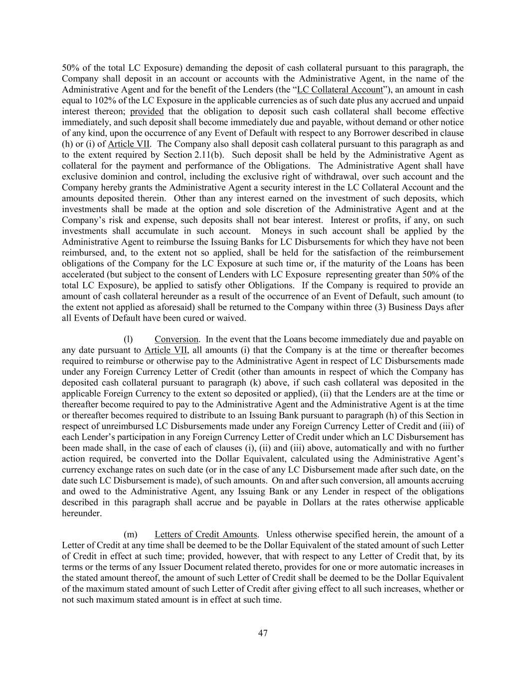 47 50% of the total LC Exposure) demanding the deposit of cash collateral pursuant to this paragraph, the Company shall deposit in an account or accounts with the Administrative Agent, in the name of the Administrative Agent and for the benefit of the Lenders (the “LC Collateral Account”), an amount in cash equal to 102% of the LC Exposure in the applicable currencies as of such date plus any accrued and unpaid interest thereon; provided that the obligation to deposit such cash collateral shall become effective immediately, and such deposit shall become immediately due and payable, without demand or other notice of any kind, upon the occurrence of any Event of Default with respect to any Borrower described in clause (h) or (i) of Article VII. The Company also shall deposit cash collateral pursuant to this paragraph as and to the extent required by Section 2.11(b). Such deposit shall be held by the Administrative Agent as collateral for the payment and performance of the Obligations. The Administrative Agent shall have exclusive dominion and control, including the exclusive right of withdrawal, over such account and the Company hereby grants the Administrative Agent a security interest in the LC Collateral Account and the amounts deposited therein. Other than any interest earned on the investment of such deposits, which investments shall be made at the option and sole discretion of the Administrative Agent and at the Company’s risk and expense, such deposits shall not bear interest. Interest or profits, if any, on such investments shall accumulate in such account. Moneys in such account shall be applied by the Administrative Agent to reimburse the Issuing Banks for LC Disbursements for which they have not been reimbursed, and, to the extent not so applied, shall be held for the satisfaction of the reimbursement obligations of the Company for the LC Exposure at such time or, if the maturity of the Loans has been accelerated (but subject to the consent of Lenders with LC Exposure representing greater than 50% of the total LC Exposure), be applied to satisfy other Obligations. If the Company is required to provide an amount of cash collateral hereunder as a result of the occurrence of an Event of Default, such amount (to the extent not applied as aforesaid) shall be returned to the Company within three (3) Business Days after all Events of Default have been cured or waived. (l) Conversion. In the event that the Loans become immediately due and payable on any date pursuant to Article VII, all amounts (i) that the Company is at the time or thereafter becomes required to reimburse or otherwise pay to the Administrative Agent in respect of LC Disbursements made under any Foreign Currency Letter of Credit (other than amounts in respect of which the Company has deposited cash collateral pursuant to paragraph (k) above, if such cash collateral was deposited in the applicable Foreign Currency to the extent so deposited or applied), (ii) that the Lenders are at the time or thereafter become required to pay to the Administrative Agent and the Administrative Agent is at the time or thereafter becomes required to distribute to an Issuing Bank pursuant to paragraph (h) of this Section in respect of unreimbursed LC Disbursements made under any Foreign Currency Letter of Credit and (iii) of each Lender’s participation in any Foreign Currency Letter of Credit under which an LC Disbursement has been made shall, in the case of each of clauses (i), (ii) and (iii) above, automatically and with no further action required, be converted into the Dollar Equivalent, calculated using the Administrative Agent’s currency exchange rates on such date (or in the case of any LC Disbursement made after such date, on the date such LC Disbursement is made), of such amounts. On and after such conversion, all amounts accruing and owed to the Administrative Agent, any Issuing Bank or any Lender in respect of the obligations described in this paragraph shall accrue and be payable in Dollars at the rates otherwise applicable hereunder. (m) Letters of Credit Amounts. Unless otherwise specified herein, the amount of a Letter of Credit at any time shall be deemed to be the Dollar Equivalent of the stated amount of such Letter of Credit in effect at such time; provided, however, that with respect to any Letter of Credit that, by its terms or the terms of any Issuer Document related thereto, provides for one or more automatic increases in the stated amount thereof, the amount of such Letter of Credit shall be deemed to be the Dollar Equivalent of the maximum stated amount of such Letter of Credit after giving effect to all such increases, whether or not such maximum stated amount is in effect at such time.
