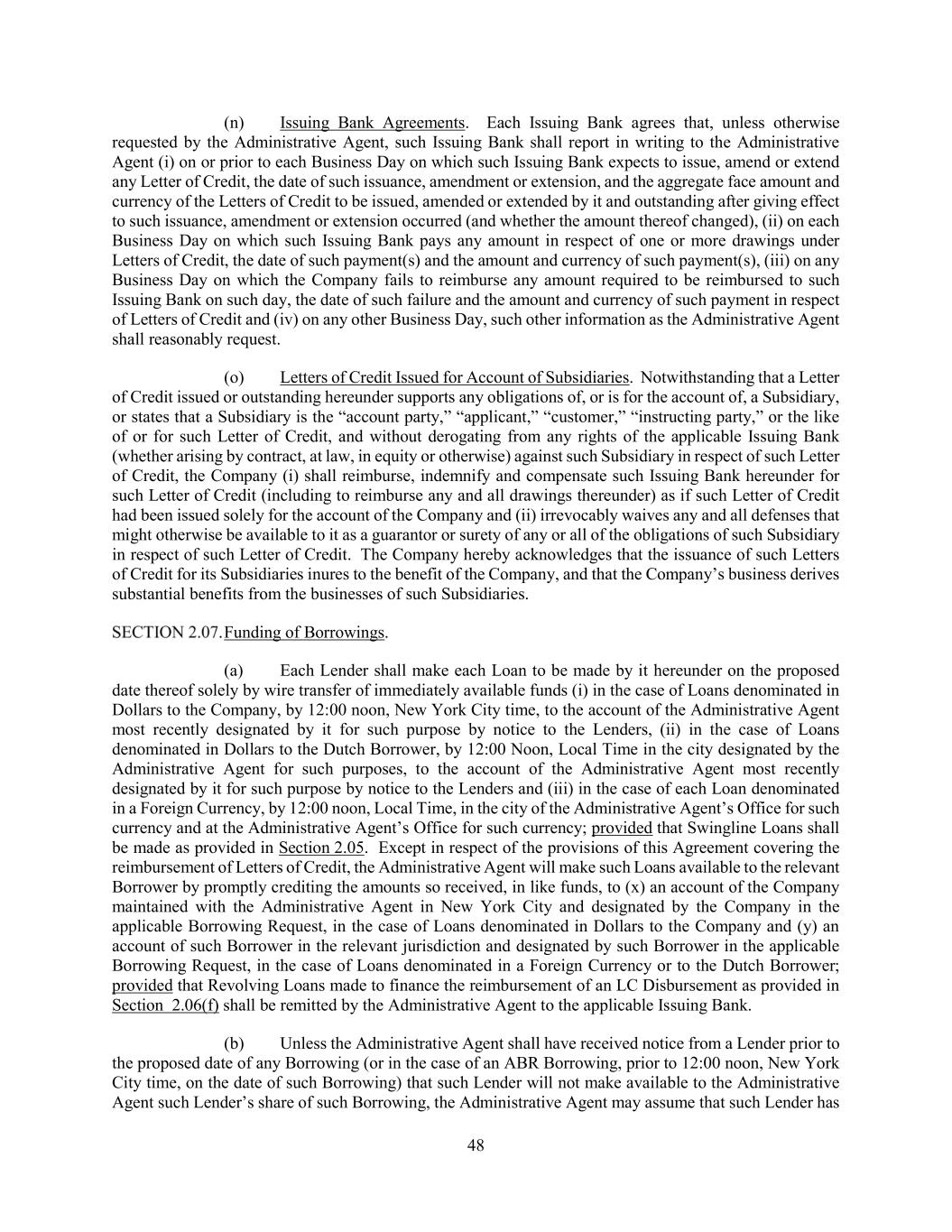 48 (n) Issuing Bank Agreements. Each Issuing Bank agrees that, unless otherwise requested by the Administrative Agent, such Issuing Bank shall report in writing to the Administrative Agent (i) on or prior to each Business Day on which such Issuing Bank expects to issue, amend or extend any Letter of Credit, the date of such issuance, amendment or extension, and the aggregate face amount and currency of the Letters of Credit to be issued, amended or extended by it and outstanding after giving effect to such issuance, amendment or extension occurred (and whether the amount thereof changed), (ii) on each Business Day on which such Issuing Bank pays any amount in respect of one or more drawings under Letters of Credit, the date of such payment(s) and the amount and currency of such payment(s), (iii) on any Business Day on which the Company fails to reimburse any amount required to be reimbursed to such Issuing Bank on such day, the date of such failure and the amount and currency of such payment in respect of Letters of Credit and (iv) on any other Business Day, such other information as the Administrative Agent shall reasonably request. (o) Letters of Credit Issued for Account of Subsidiaries. Notwithstanding that a Letter of Credit issued or outstanding hereunder supports any obligations of, or is for the account of, a Subsidiary, or states that a Subsidiary is the “account party,” “applicant,” “customer,” “instructing party,” or the like of or for such Letter of Credit, and without derogating from any rights of the applicable Issuing Bank (whether arising by contract, at law, in equity or otherwise) against such Subsidiary in respect of such Letter of Credit, the Company (i) shall reimburse, indemnify and compensate such Issuing Bank hereunder for such Letter of Credit (including to reimburse any and all drawings thereunder) as if such Letter of Credit had been issued solely for the account of the Company and (ii) irrevocably waives any and all defenses that might otherwise be available to it as a guarantor or surety of any or all of the obligations of such Subsidiary in respect of such Letter of Credit. The Company hereby acknowledges that the issuance of such Letters of Credit for its Subsidiaries inures to the benefit of the Company, and that the Company’s business derives substantial benefits from the businesses of such Subsidiaries. Funding of Borrowings. (a) Each Lender shall make each Loan to be made by it hereunder on the proposed date thereof solely by wire transfer of immediately available funds (i) in the case of Loans denominated in Dollars to the Company, by 12:00 noon, New York City time, to the account of the Administrative Agent most recently designated by it for such purpose by notice to the Lenders, (ii) in the case of Loans denominated in Dollars to the Dutch Borrower, by 12:00 Noon, Local Time in the city designated by the Administrative Agent for such purposes, to the account of the Administrative Agent most recently designated by it for such purpose by notice to the Lenders and (iii) in the case of each Loan denominated in a Foreign Currency, by 12:00 noon, Local Time, in the city of the Administrative Agent’s Office for such currency and at the Administrative Agent’s Office for such currency; provided that Swingline Loans shall be made as provided in Section 2.05. Except in respect of the provisions of this Agreement covering the reimbursement of Letters of Credit, the Administrative Agent will make such Loans available to the relevant Borrower by promptly crediting the amounts so received, in like funds, to (x) an account of the Company maintained with the Administrative Agent in New York City and designated by the Company in the applicable Borrowing Request, in the case of Loans denominated in Dollars to the Company and (y) an account of such Borrower in the relevant jurisdiction and designated by such Borrower in the applicable Borrowing Request, in the case of Loans denominated in a Foreign Currency or to the Dutch Borrower; provided that Revolving Loans made to finance the reimbursement of an LC Disbursement as provided in Section 2.06(f) shall be remitted by the Administrative Agent to the applicable Issuing Bank. (b) Unless the Administrative Agent shall have received notice from a Lender prior to the proposed date of any Borrowing (or in the case of an ABR Borrowing, prior to 12:00 noon, New York City time, on the date of such Borrowing) that such Lender will not make available to the Administrative Agent such Lender’s share of such Borrowing, the Administrative Agent may assume that such Lender has