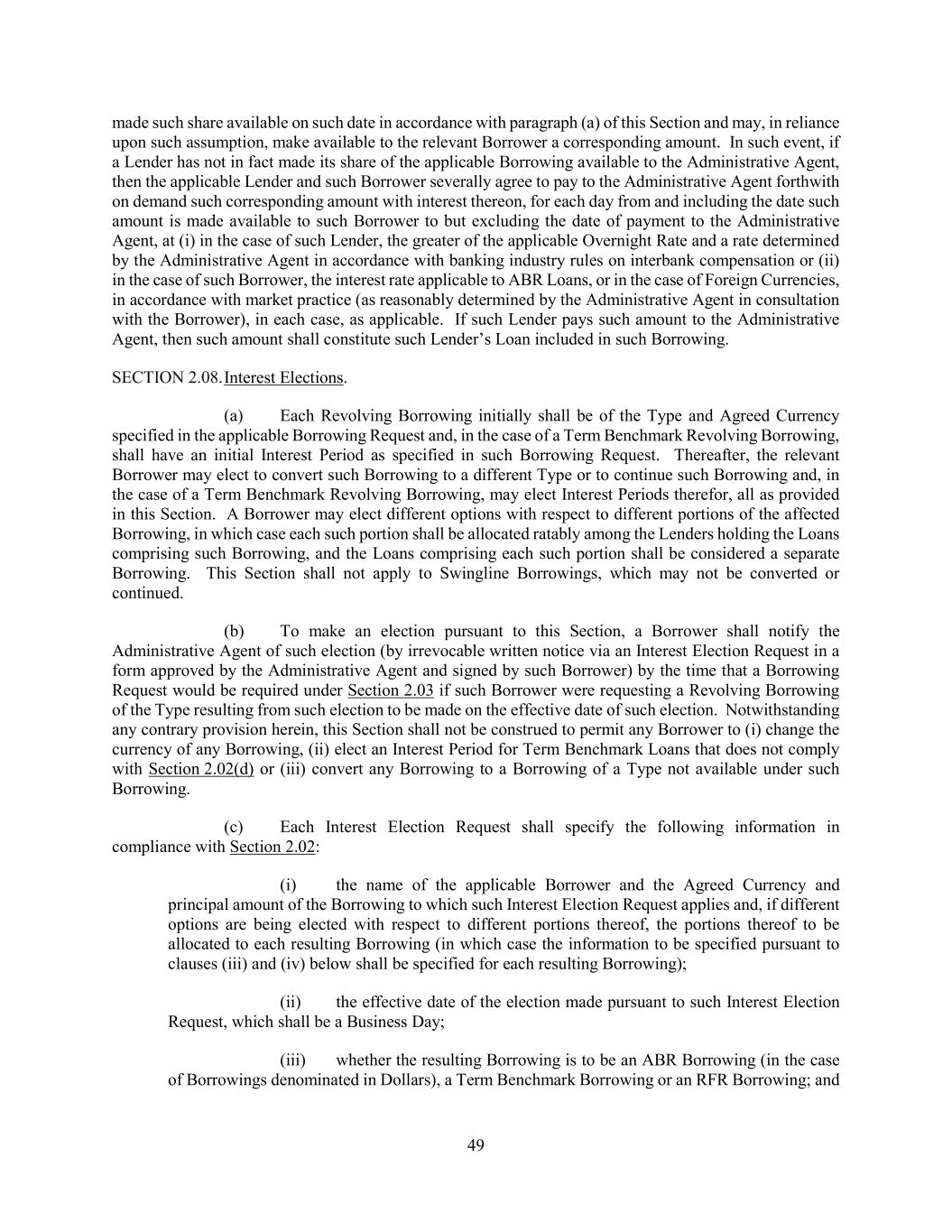 49 made such share available on such date in accordance with paragraph (a) of this Section and may, in reliance upon such assumption, make available to the relevant Borrower a corresponding amount. In such event, if a Lender has not in fact made its share of the applicable Borrowing available to the Administrative Agent, then the applicable Lender and such Borrower severally agree to pay to the Administrative Agent forthwith on demand such corresponding amount with interest thereon, for each day from and including the date such amount is made available to such Borrower to but excluding the date of payment to the Administrative Agent, at (i) in the case of such Lender, the greater of the applicable Overnight Rate and a rate determined by the Administrative Agent in accordance with banking industry rules on interbank compensation or (ii) in the case of such Borrower, the interest rate applicable to ABR Loans, or in the case of Foreign Currencies, in accordance with market practice (as reasonably determined by the Administrative Agent in consultation with the Borrower), in each case, as applicable. If such Lender pays such amount to the Administrative Agent, then such amount shall constitute such Lender’s Loan included in such Borrowing. Interest Elections. (a) Each Revolving Borrowing initially shall be of the Type and Agreed Currency specified in the applicable Borrowing Request and, in the case of a Term Benchmark Revolving Borrowing, shall have an initial Interest Period as specified in such Borrowing Request. Thereafter, the relevant Borrower may elect to convert such Borrowing to a different Type or to continue such Borrowing and, in the case of a Term Benchmark Revolving Borrowing, may elect Interest Periods therefor, all as provided in this Section. A Borrower may elect different options with respect to different portions of the affected Borrowing, in which case each such portion shall be allocated ratably among the Lenders holding the Loans comprising such Borrowing, and the Loans comprising each such portion shall be considered a separate Borrowing. This Section shall not apply to Swingline Borrowings, which may not be converted or continued. (b) To make an election pursuant to this Section, a Borrower shall notify the Administrative Agent of such election (by irrevocable written notice via an Interest Election Request in a form approved by the Administrative Agent and signed by such Borrower) by the time that a Borrowing Request would be required under Section 2.03 if such Borrower were requesting a Revolving Borrowing of the Type resulting from such election to be made on the effective date of such election. Notwithstanding any contrary provision herein, this Section shall not be construed to permit any Borrower to (i) change the currency of any Borrowing, (ii) elect an Interest Period for Term Benchmark Loans that does not comply with Section 2.02(d) or (iii) convert any Borrowing to a Borrowing of a Type not available under such Borrowing. (c) Each Interest Election Request shall specify the following information in compliance with Section 2.02: (i) the name of the applicable Borrower and the Agreed Currency and principal amount of the Borrowing to which such Interest Election Request applies and, if different options are being elected with respect to different portions thereof, the portions thereof to be allocated to each resulting Borrowing (in which case the information to be specified pursuant to clauses (iii) and (iv) below shall be specified for each resulting Borrowing); (ii) the effective date of the election made pursuant to such Interest Election Request, which shall be a Business Day; (iii) whether the resulting Borrowing is to be an ABR Borrowing (in the case of Borrowings denominated in Dollars), a Term Benchmark Borrowing or an RFR Borrowing; and