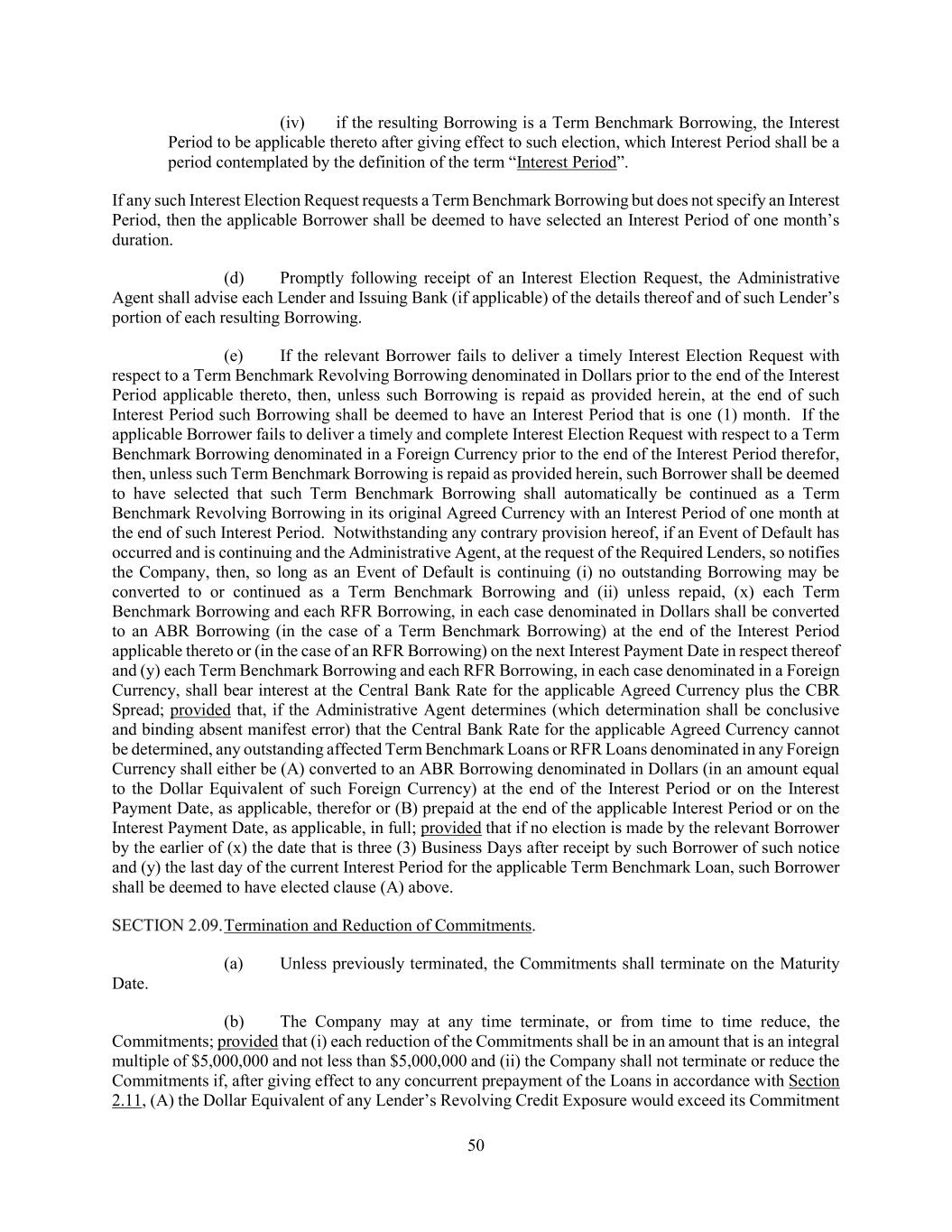 50 (iv) if the resulting Borrowing is a Term Benchmark Borrowing, the Interest Period to be applicable thereto after giving effect to such election, which Interest Period shall be a period contemplated by the definition of the term “Interest Period”. If any such Interest Election Request requests a Term Benchmark Borrowing but does not specify an Interest Period, then the applicable Borrower shall be deemed to have selected an Interest Period of one month’s duration. (d) Promptly following receipt of an Interest Election Request, the Administrative Agent shall advise each Lender and Issuing Bank (if applicable) of the details thereof and of such Lender’s portion of each resulting Borrowing. (e) If the relevant Borrower fails to deliver a timely Interest Election Request with respect to a Term Benchmark Revolving Borrowing denominated in Dollars prior to the end of the Interest Period applicable thereto, then, unless such Borrowing is repaid as provided herein, at the end of such Interest Period such Borrowing shall be deemed to have an Interest Period that is one (1) month. If the applicable Borrower fails to deliver a timely and complete Interest Election Request with respect to a Term Benchmark Borrowing denominated in a Foreign Currency prior to the end of the Interest Period therefor, then, unless such Term Benchmark Borrowing is repaid as provided herein, such Borrower shall be deemed to have selected that such Term Benchmark Borrowing shall automatically be continued as a Term Benchmark Revolving Borrowing in its original Agreed Currency with an Interest Period of one month at the end of such Interest Period. Notwithstanding any contrary provision hereof, if an Event of Default has occurred and is continuing and the Administrative Agent, at the request of the Required Lenders, so notifies the Company, then, so long as an Event of Default is continuing (i) no outstanding Borrowing may be converted to or continued as a Term Benchmark Borrowing and (ii) unless repaid, (x) each Term Benchmark Borrowing and each RFR Borrowing, in each case denominated in Dollars shall be converted to an ABR Borrowing (in the case of a Term Benchmark Borrowing) at the end of the Interest Period applicable thereto or (in the case of an RFR Borrowing) on the next Interest Payment Date in respect thereof and (y) each Term Benchmark Borrowing and each RFR Borrowing, in each case denominated in a Foreign Currency, shall bear interest at the Central Bank Rate for the applicable Agreed Currency plus the CBR Spread; provided that, if the Administrative Agent determines (which determination shall be conclusive and binding absent manifest error) that the Central Bank Rate for the applicable Agreed Currency cannot be determined, any outstanding affected Term Benchmark Loans or RFR Loans denominated in any Foreign Currency shall either be (A) converted to an ABR Borrowing denominated in Dollars (in an amount equal to the Dollar Equivalent of such Foreign Currency) at the end of the Interest Period or on the Interest Payment Date, as applicable, therefor or (B) prepaid at the end of the applicable Interest Period or on the Interest Payment Date, as applicable, in full; provided that if no election is made by the relevant Borrower by the earlier of (x) the date that is three (3) Business Days after receipt by such Borrower of such notice and (y) the last day of the current Interest Period for the applicable Term Benchmark Loan, such Borrower shall be deemed to have elected clause (A) above. Termination and Reduction of Commitments. (a) Unless previously terminated, the Commitments shall terminate on the Maturity Date. (b) The Company may at any time terminate, or from time to time reduce, the Commitments; provided that (i) each reduction of the Commitments shall be in an amount that is an integral multiple of $5,000,000 and not less than $5,000,000 and (ii) the Company shall not terminate or reduce the Commitments if, after giving effect to any concurrent prepayment of the Loans in accordance with Section 2.11, (A) the Dollar Equivalent of any Lender’s Revolving Credit Exposure would exceed its Commitment
