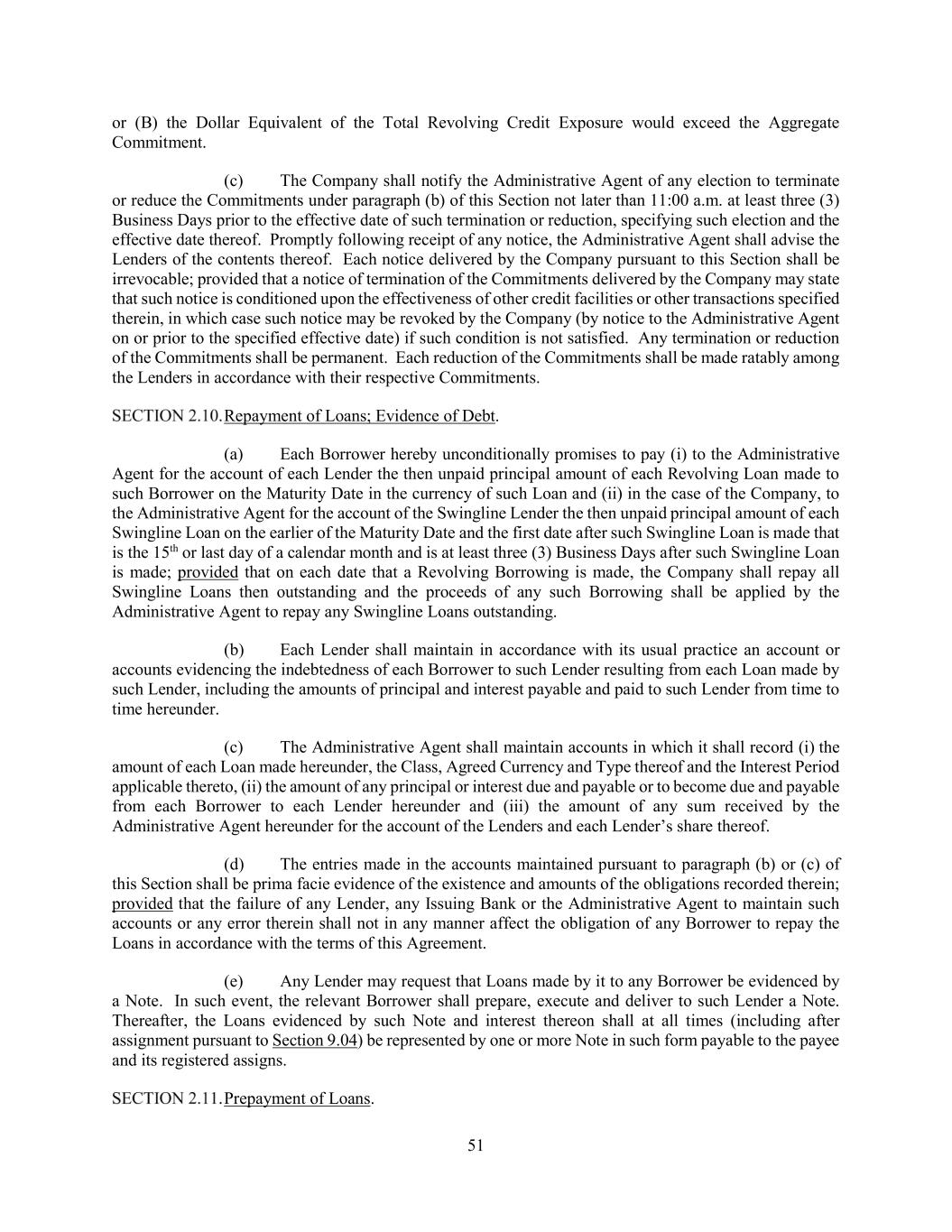 51 or (B) the Dollar Equivalent of the Total Revolving Credit Exposure would exceed the Aggregate Commitment. (c) The Company shall notify the Administrative Agent of any election to terminate or reduce the Commitments under paragraph (b) of this Section not later than 11:00 a.m. at least three (3) Business Days prior to the effective date of such termination or reduction, specifying such election and the effective date thereof. Promptly following receipt of any notice, the Administrative Agent shall advise the Lenders of the contents thereof. Each notice delivered by the Company pursuant to this Section shall be irrevocable; provided that a notice of termination of the Commitments delivered by the Company may state that such notice is conditioned upon the effectiveness of other credit facilities or other transactions specified therein, in which case such notice may be revoked by the Company (by notice to the Administrative Agent on or prior to the specified effective date) if such condition is not satisfied. Any termination or reduction of the Commitments shall be permanent. Each reduction of the Commitments shall be made ratably among the Lenders in accordance with their respective Commitments. Repayment of Loans; Evidence of Debt. (a) Each Borrower hereby unconditionally promises to pay (i) to the Administrative Agent for the account of each Lender the then unpaid principal amount of each Revolving Loan made to such Borrower on the Maturity Date in the currency of such Loan and (ii) in the case of the Company, to the Administrative Agent for the account of the Swingline Lender the then unpaid principal amount of each Swingline Loan on the earlier of the Maturity Date and the first date after such Swingline Loan is made that is the 15th or last day of a calendar month and is at least three (3) Business Days after such Swingline Loan is made; provided that on each date that a Revolving Borrowing is made, the Company shall repay all Swingline Loans then outstanding and the proceeds of any such Borrowing shall be applied by the Administrative Agent to repay any Swingline Loans outstanding. (b) Each Lender shall maintain in accordance with its usual practice an account or accounts evidencing the indebtedness of each Borrower to such Lender resulting from each Loan made by such Lender, including the amounts of principal and interest payable and paid to such Lender from time to time hereunder. (c) The Administrative Agent shall maintain accounts in which it shall record (i) the amount of each Loan made hereunder, the Class, Agreed Currency and Type thereof and the Interest Period applicable thereto, (ii) the amount of any principal or interest due and payable or to become due and payable from each Borrower to each Lender hereunder and (iii) the amount of any sum received by the Administrative Agent hereunder for the account of the Lenders and each Lender’s share thereof. (d) The entries made in the accounts maintained pursuant to paragraph (b) or (c) of this Section shall be prima facie evidence of the existence and amounts of the obligations recorded therein; provided that the failure of any Lender, any Issuing Bank or the Administrative Agent to maintain such accounts or any error therein shall not in any manner affect the obligation of any Borrower to repay the Loans in accordance with the terms of this Agreement. (e) Any Lender may request that Loans made by it to any Borrower be evidenced by a Note. In such event, the relevant Borrower shall prepare, execute and deliver to such Lender a Note. Thereafter, the Loans evidenced by such Note and interest thereon shall at all times (including after assignment pursuant to Section 9.04) be represented by one or more Note in such form payable to the payee and its registered assigns. Prepayment of Loans.