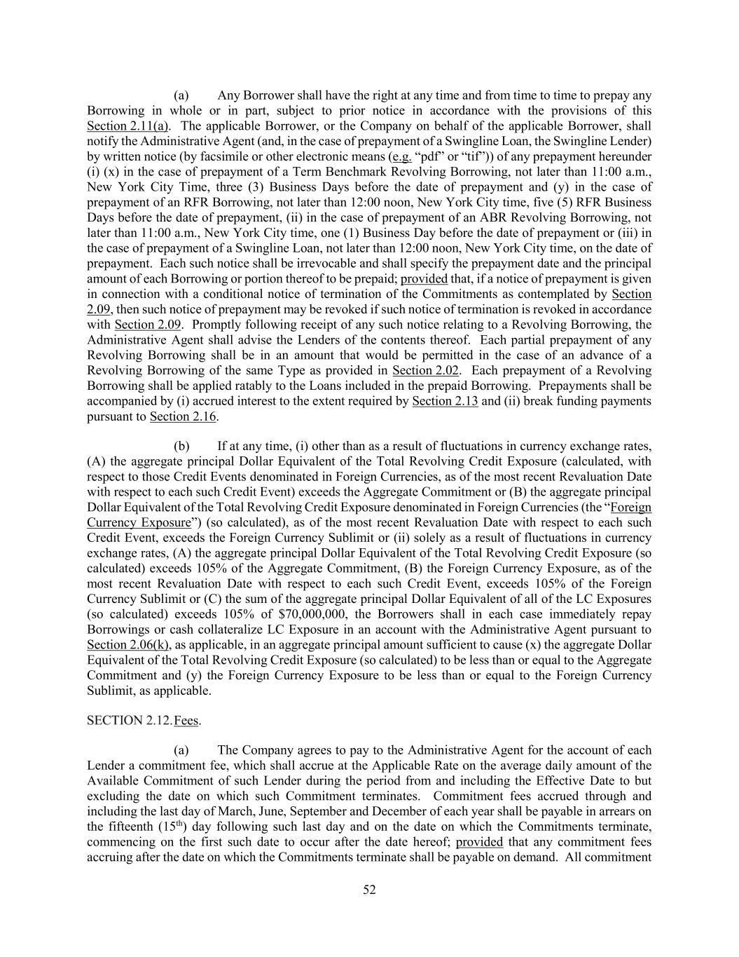 52 (a) Any Borrower shall have the right at any time and from time to time to prepay any Borrowing in whole or in part, subject to prior notice in accordance with the provisions of this Section 2.11(a). The applicable Borrower, or the Company on behalf of the applicable Borrower, shall notify the Administrative Agent (and, in the case of prepayment of a Swingline Loan, the Swingline Lender) by written notice (by facsimile or other electronic means (e.g. “pdf” or “tif”)) of any prepayment hereunder (i) (x) in the case of prepayment of a Term Benchmark Revolving Borrowing, not later than 11:00 a.m., New York City Time, three (3) Business Days before the date of prepayment and (y) in the case of prepayment of an RFR Borrowing, not later than 12:00 noon, New York City time, five (5) RFR Business Days before the date of prepayment, (ii) in the case of prepayment of an ABR Revolving Borrowing, not later than 11:00 a.m., New York City time, one (1) Business Day before the date of prepayment or (iii) in the case of prepayment of a Swingline Loan, not later than 12:00 noon, New York City time, on the date of prepayment. Each such notice shall be irrevocable and shall specify the prepayment date and the principal amount of each Borrowing or portion thereof to be prepaid; provided that, if a notice of prepayment is given in connection with a conditional notice of termination of the Commitments as contemplated by Section 2.09, then such notice of prepayment may be revoked if such notice of termination is revoked in accordance with Section 2.09. Promptly following receipt of any such notice relating to a Revolving Borrowing, the Administrative Agent shall advise the Lenders of the contents thereof. Each partial prepayment of any Revolving Borrowing shall be in an amount that would be permitted in the case of an advance of a Revolving Borrowing of the same Type as provided in Section 2.02. Each prepayment of a Revolving Borrowing shall be applied ratably to the Loans included in the prepaid Borrowing. Prepayments shall be accompanied by (i) accrued interest to the extent required by Section 2.13 and (ii) break funding payments pursuant to Section 2.16. (b) If at any time, (i) other than as a result of fluctuations in currency exchange rates, (A) the aggregate principal Dollar Equivalent of the Total Revolving Credit Exposure (calculated, with respect to those Credit Events denominated in Foreign Currencies, as of the most recent Revaluation Date with respect to each such Credit Event) exceeds the Aggregate Commitment or (B) the aggregate principal Dollar Equivalent of the Total Revolving Credit Exposure denominated in Foreign Currencies (the “Foreign Currency Exposure”) (so calculated), as of the most recent Revaluation Date with respect to each such Credit Event, exceeds the Foreign Currency Sublimit or (ii) solely as a result of fluctuations in currency exchange rates, (A) the aggregate principal Dollar Equivalent of the Total Revolving Credit Exposure (so calculated) exceeds 105% of the Aggregate Commitment, (B) the Foreign Currency Exposure, as of the most recent Revaluation Date with respect to each such Credit Event, exceeds 105% of the Foreign Currency Sublimit or (C) the sum of the aggregate principal Dollar Equivalent of all of the LC Exposures (so calculated) exceeds 105% of $70,000,000, the Borrowers shall in each case immediately repay Borrowings or cash collateralize LC Exposure in an account with the Administrative Agent pursuant to Section 2.06(k), as applicable, in an aggregate principal amount sufficient to cause (x) the aggregate Dollar Equivalent of the Total Revolving Credit Exposure (so calculated) to be less than or equal to the Aggregate Commitment and (y) the Foreign Currency Exposure to be less than or equal to the Foreign Currency Sublimit, as applicable. Fees. (a) The Company agrees to pay to the Administrative Agent for the account of each Lender a commitment fee, which shall accrue at the Applicable Rate on the average daily amount of the Available Commitment of such Lender during the period from and including the Effective Date to but excluding the date on which such Commitment terminates. Commitment fees accrued through and including the last day of March, June, September and December of each year shall be payable in arrears on the fifteenth (15th) day following such last day and on the date on which the Commitments terminate, commencing on the first such date to occur after the date hereof; provided that any commitment fees accruing after the date on which the Commitments terminate shall be payable on demand. All commitment