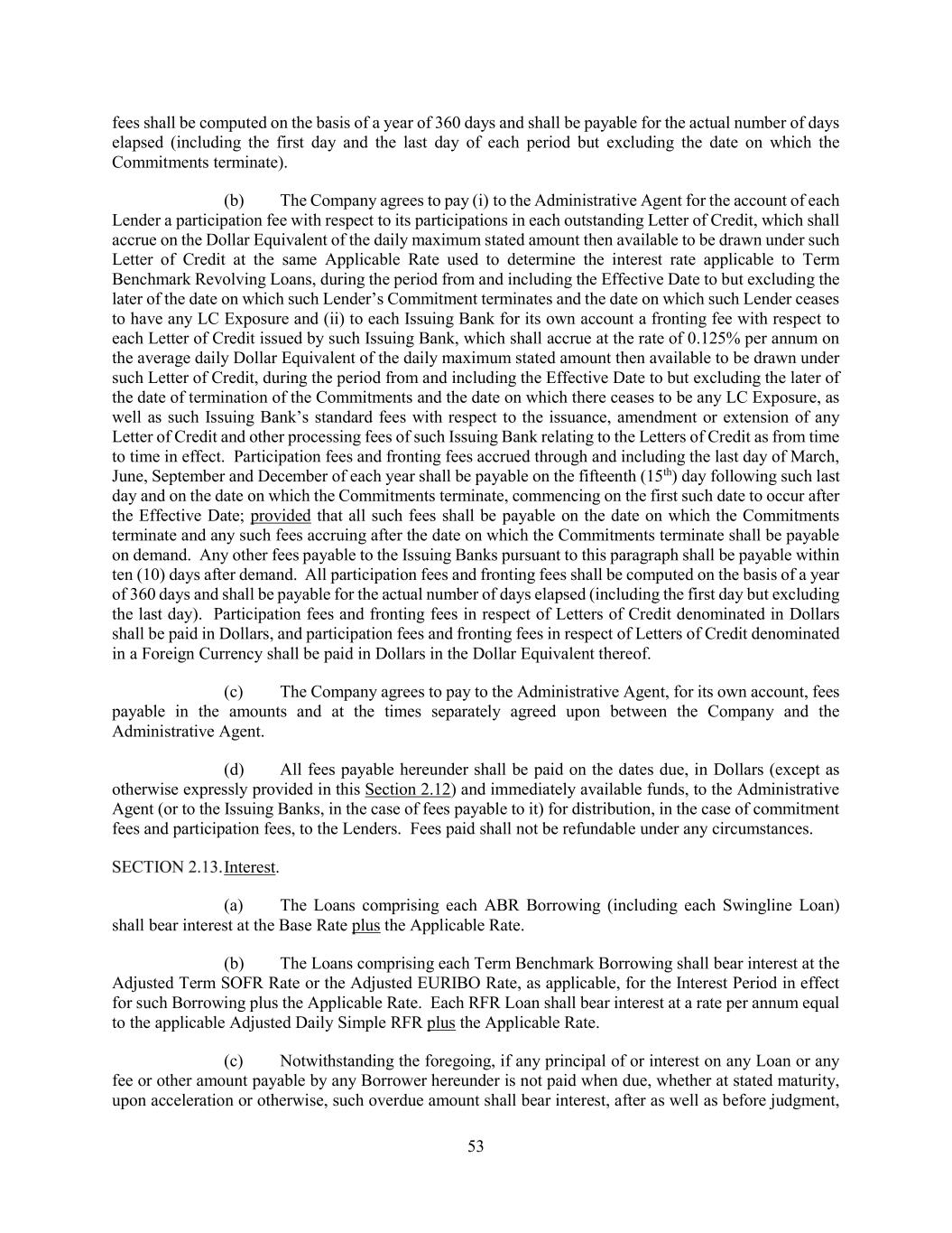 53 fees shall be computed on the basis of a year of 360 days and shall be payable for the actual number of days elapsed (including the first day and the last day of each period but excluding the date on which the Commitments terminate). (b) The Company agrees to pay (i) to the Administrative Agent for the account of each Lender a participation fee with respect to its participations in each outstanding Letter of Credit, which shall accrue on the Dollar Equivalent of the daily maximum stated amount then available to be drawn under such Letter of Credit at the same Applicable Rate used to determine the interest rate applicable to Term Benchmark Revolving Loans, during the period from and including the Effective Date to but excluding the later of the date on which such Lender’s Commitment terminates and the date on which such Lender ceases to have any LC Exposure and (ii) to each Issuing Bank for its own account a fronting fee with respect to each Letter of Credit issued by such Issuing Bank, which shall accrue at the rate of 0.125% per annum on the average daily Dollar Equivalent of the daily maximum stated amount then available to be drawn under such Letter of Credit, during the period from and including the Effective Date to but excluding the later of the date of termination of the Commitments and the date on which there ceases to be any LC Exposure, as well as such Issuing Bank’s standard fees with respect to the issuance, amendment or extension of any Letter of Credit and other processing fees of such Issuing Bank relating to the Letters of Credit as from time to time in effect. Participation fees and fronting fees accrued through and including the last day of March, June, September and December of each year shall be payable on the fifteenth (15th) day following such last day and on the date on which the Commitments terminate, commencing on the first such date to occur after the Effective Date; provided that all such fees shall be payable on the date on which the Commitments terminate and any such fees accruing after the date on which the Commitments terminate shall be payable on demand. Any other fees payable to the Issuing Banks pursuant to this paragraph shall be payable within ten (10) days after demand. All participation fees and fronting fees shall be computed on the basis of a year of 360 days and shall be payable for the actual number of days elapsed (including the first day but excluding the last day). Participation fees and fronting fees in respect of Letters of Credit denominated in Dollars shall be paid in Dollars, and participation fees and fronting fees in respect of Letters of Credit denominated in a Foreign Currency shall be paid in Dollars in the Dollar Equivalent thereof. (c) The Company agrees to pay to the Administrative Agent, for its own account, fees payable in the amounts and at the times separately agreed upon between the Company and the Administrative Agent. (d) All fees payable hereunder shall be paid on the dates due, in Dollars (except as otherwise expressly provided in this Section 2.12) and immediately available funds, to the Administrative Agent (or to the Issuing Banks, in the case of fees payable to it) for distribution, in the case of commitment fees and participation fees, to the Lenders. Fees paid shall not be refundable under any circumstances. Interest. (a) The Loans comprising each ABR Borrowing (including each Swingline Loan) shall bear interest at the Base Rate plus the Applicable Rate. (b) The Loans comprising each Term Benchmark Borrowing shall bear interest at the Adjusted Term SOFR Rate or the Adjusted EURIBO Rate, as applicable, for the Interest Period in effect for such Borrowing plus the Applicable Rate. Each RFR Loan shall bear interest at a rate per annum equal to the applicable Adjusted Daily Simple RFR plus the Applicable Rate. (c) Notwithstanding the foregoing, if any principal of or interest on any Loan or any fee or other amount payable by any Borrower hereunder is not paid when due, whether at stated maturity, upon acceleration or otherwise, such overdue amount shall bear interest, after as well as before judgment,