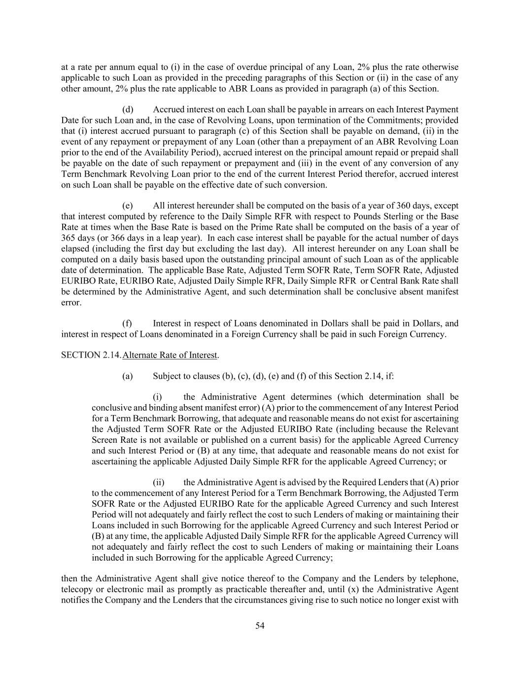 54 at a rate per annum equal to (i) in the case of overdue principal of any Loan, 2% plus the rate otherwise applicable to such Loan as provided in the preceding paragraphs of this Section or (ii) in the case of any other amount, 2% plus the rate applicable to ABR Loans as provided in paragraph (a) of this Section. (d) Accrued interest on each Loan shall be payable in arrears on each Interest Payment Date for such Loan and, in the case of Revolving Loans, upon termination of the Commitments; provided that (i) interest accrued pursuant to paragraph (c) of this Section shall be payable on demand, (ii) in the event of any repayment or prepayment of any Loan (other than a prepayment of an ABR Revolving Loan prior to the end of the Availability Period), accrued interest on the principal amount repaid or prepaid shall be payable on the date of such repayment or prepayment and (iii) in the event of any conversion of any Term Benchmark Revolving Loan prior to the end of the current Interest Period therefor, accrued interest on such Loan shall be payable on the effective date of such conversion. (e) All interest hereunder shall be computed on the basis of a year of 360 days, except that interest computed by reference to the Daily Simple RFR with respect to Pounds Sterling or the Base Rate at times when the Base Rate is based on the Prime Rate shall be computed on the basis of a year of 365 days (or 366 days in a leap year). In each case interest shall be payable for the actual number of days elapsed (including the first day but excluding the last day). All interest hereunder on any Loan shall be computed on a daily basis based upon the outstanding principal amount of such Loan as of the applicable date of determination. The applicable Base Rate, Adjusted Term SOFR Rate, Term SOFR Rate, Adjusted EURIBO Rate, EURIBO Rate, Adjusted Daily Simple RFR, Daily Simple RFR or Central Bank Rate shall be determined by the Administrative Agent, and such determination shall be conclusive absent manifest error. (f) Interest in respect of Loans denominated in Dollars shall be paid in Dollars, and interest in respect of Loans denominated in a Foreign Currency shall be paid in such Foreign Currency. Alternate Rate of Interest. (a) Subject to clauses (b), (c), (d), (e) and (f) of this Section 2.14, if: (i) the Administrative Agent determines (which determination shall be conclusive and binding absent manifest error) (A) prior to the commencement of any Interest Period for a Term Benchmark Borrowing, that adequate and reasonable means do not exist for ascertaining the Adjusted Term SOFR Rate or the Adjusted EURIBO Rate (including because the Relevant Screen Rate is not available or published on a current basis) for the applicable Agreed Currency and such Interest Period or (B) at any time, that adequate and reasonable means do not exist for ascertaining the applicable Adjusted Daily Simple RFR for the applicable Agreed Currency; or (ii) the Administrative Agent is advised by the Required Lenders that (A) prior to the commencement of any Interest Period for a Term Benchmark Borrowing, the Adjusted Term SOFR Rate or the Adjusted EURIBO Rate for the applicable Agreed Currency and such Interest Period will not adequately and fairly reflect the cost to such Lenders of making or maintaining their Loans included in such Borrowing for the applicable Agreed Currency and such Interest Period or (B) at any time, the applicable Adjusted Daily Simple RFR for the applicable Agreed Currency will not adequately and fairly reflect the cost to such Lenders of making or maintaining their Loans included in such Borrowing for the applicable Agreed Currency; then the Administrative Agent shall give notice thereof to the Company and the Lenders by telephone, telecopy or electronic mail as promptly as practicable thereafter and, until (x) the Administrative Agent notifies the Company and the Lenders that the circumstances giving rise to such notice no longer exist with