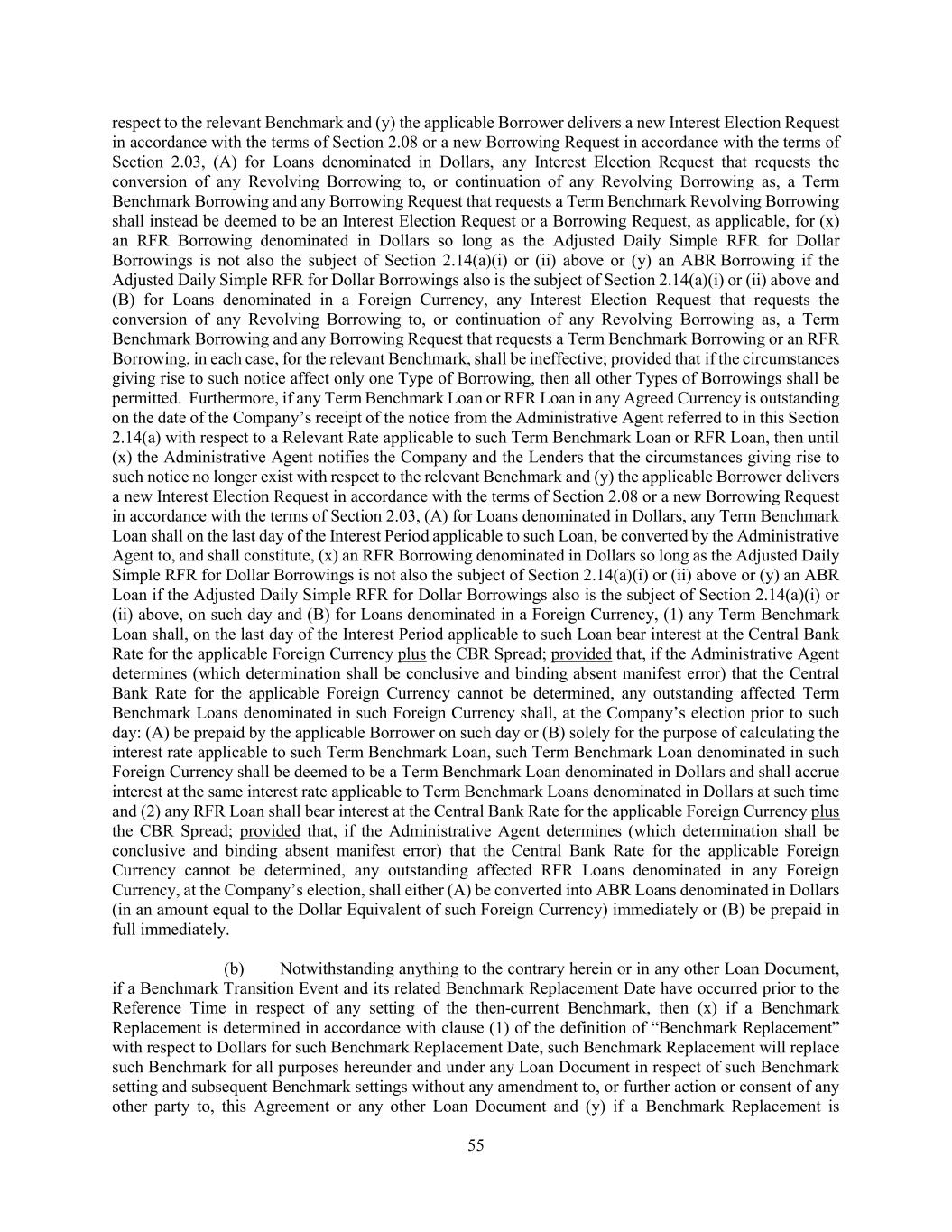 55 respect to the relevant Benchmark and (y) the applicable Borrower delivers a new Interest Election Request in accordance with the terms of Section 2.08 or a new Borrowing Request in accordance with the terms of Section 2.03, (A) for Loans denominated in Dollars, any Interest Election Request that requests the conversion of any Revolving Borrowing to, or continuation of any Revolving Borrowing as, a Term Benchmark Borrowing and any Borrowing Request that requests a Term Benchmark Revolving Borrowing shall instead be deemed to be an Interest Election Request or a Borrowing Request, as applicable, for (x) an RFR Borrowing denominated in Dollars so long as the Adjusted Daily Simple RFR for Dollar Borrowings is not also the subject of Section 2.14(a)(i) or (ii) above or (y) an ABR Borrowing if the Adjusted Daily Simple RFR for Dollar Borrowings also is the subject of Section 2.14(a)(i) or (ii) above and (B) for Loans denominated in a Foreign Currency, any Interest Election Request that requests the conversion of any Revolving Borrowing to, or continuation of any Revolving Borrowing as, a Term Benchmark Borrowing and any Borrowing Request that requests a Term Benchmark Borrowing or an RFR Borrowing, in each case, for the relevant Benchmark, shall be ineffective; provided that if the circumstances giving rise to such notice affect only one Type of Borrowing, then all other Types of Borrowings shall be permitted. Furthermore, if any Term Benchmark Loan or RFR Loan in any Agreed Currency is outstanding on the date of the Company’s receipt of the notice from the Administrative Agent referred to in this Section 2.14(a) with respect to a Relevant Rate applicable to such Term Benchmark Loan or RFR Loan, then until (x) the Administrative Agent notifies the Company and the Lenders that the circumstances giving rise to such notice no longer exist with respect to the relevant Benchmark and (y) the applicable Borrower delivers a new Interest Election Request in accordance with the terms of Section 2.08 or a new Borrowing Request in accordance with the terms of Section 2.03, (A) for Loans denominated in Dollars, any Term Benchmark Loan shall on the last day of the Interest Period applicable to such Loan, be converted by the Administrative Agent to, and shall constitute, (x) an RFR Borrowing denominated in Dollars so long as the Adjusted Daily Simple RFR for Dollar Borrowings is not also the subject of Section 2.14(a)(i) or (ii) above or (y) an ABR Loan if the Adjusted Daily Simple RFR for Dollar Borrowings also is the subject of Section 2.14(a)(i) or (ii) above, on such day and (B) for Loans denominated in a Foreign Currency, (1) any Term Benchmark Loan shall, on the last day of the Interest Period applicable to such Loan bear interest at the Central Bank Rate for the applicable Foreign Currency plus the CBR Spread; provided that, if the Administrative Agent determines (which determination shall be conclusive and binding absent manifest error) that the Central Bank Rate for the applicable Foreign Currency cannot be determined, any outstanding affected Term Benchmark Loans denominated in such Foreign Currency shall, at the Company’s election prior to such day: (A) be prepaid by the applicable Borrower on such day or (B) solely for the purpose of calculating the interest rate applicable to such Term Benchmark Loan, such Term Benchmark Loan denominated in such Foreign Currency shall be deemed to be a Term Benchmark Loan denominated in Dollars and shall accrue interest at the same interest rate applicable to Term Benchmark Loans denominated in Dollars at such time and (2) any RFR Loan shall bear interest at the Central Bank Rate for the applicable Foreign Currency plus the CBR Spread; provided that, if the Administrative Agent determines (which determination shall be conclusive and binding absent manifest error) that the Central Bank Rate for the applicable Foreign Currency cannot be determined, any outstanding affected RFR Loans denominated in any Foreign Currency, at the Company’s election, shall either (A) be converted into ABR Loans denominated in Dollars (in an amount equal to the Dollar Equivalent of such Foreign Currency) immediately or (B) be prepaid in full immediately. (b) Notwithstanding anything to the contrary herein or in any other Loan Document, if a Benchmark Transition Event and its related Benchmark Replacement Date have occurred prior to the Reference Time in respect of any setting of the then-current Benchmark, then (x) if a Benchmark Replacement is determined in accordance with clause (1) of the definition of “Benchmark Replacement” with respect to Dollars for such Benchmark Replacement Date, such Benchmark Replacement will replace such Benchmark for all purposes hereunder and under any Loan Document in respect of such Benchmark setting and subsequent Benchmark settings without any amendment to, or further action or consent of any other party to, this Agreement or any other Loan Document and (y) if a Benchmark Replacement is