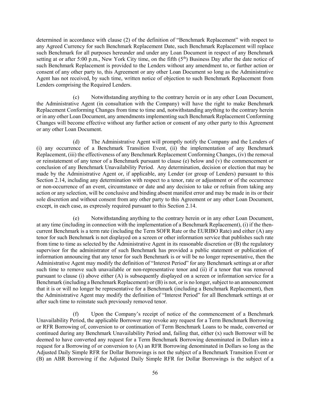 56 determined in accordance with clause (2) of the definition of “Benchmark Replacement” with respect to any Agreed Currency for such Benchmark Replacement Date, such Benchmark Replacement will replace such Benchmark for all purposes hereunder and under any Loan Document in respect of any Benchmark setting at or after 5:00 p.m., New York City time, on the fifth (5th) Business Day after the date notice of such Benchmark Replacement is provided to the Lenders without any amendment to, or further action or consent of any other party to, this Agreement or any other Loan Document so long as the Administrative Agent has not received, by such time, written notice of objection to such Benchmark Replacement from Lenders comprising the Required Lenders. (c) Notwithstanding anything to the contrary herein or in any other Loan Document, the Administrative Agent (in consultation with the Company) will have the right to make Benchmark Replacement Conforming Changes from time to time and, notwithstanding anything to the contrary herein or in any other Loan Document, any amendments implementing such Benchmark Replacement Conforming Changes will become effective without any further action or consent of any other party to this Agreement or any other Loan Document. (d) The Administrative Agent will promptly notify the Company and the Lenders of (i) any occurrence of a Benchmark Transition Event, (ii) the implementation of any Benchmark Replacement, (iii) the effectiveness of any Benchmark Replacement Conforming Changes, (iv) the removal or reinstatement of any tenor of a Benchmark pursuant to clause (e) below and (v) the commencement or conclusion of any Benchmark Unavailability Period. Any determination, decision or election that may be made by the Administrative Agent or, if applicable, any Lender (or group of Lenders) pursuant to this Section 2.14, including any determination with respect to a tenor, rate or adjustment or of the occurrence or non-occurrence of an event, circumstance or date and any decision to take or refrain from taking any action or any selection, will be conclusive and binding absent manifest error and may be made in its or their sole discretion and without consent from any other party to this Agreement or any other Loan Document, except, in each case, as expressly required pursuant to this Section 2.14. (e) Notwithstanding anything to the contrary herein or in any other Loan Document, at any time (including in connection with the implementation of a Benchmark Replacement), (i) if the then- current Benchmark is a term rate (including the Term SOFR Rate or the EURIBO Rate) and either (A) any tenor for such Benchmark is not displayed on a screen or other information service that publishes such rate from time to time as selected by the Administrative Agent in its reasonable discretion or (B) the regulatory supervisor for the administrator of such Benchmark has provided a public statement or publication of information announcing that any tenor for such Benchmark is or will be no longer representative, then the Administrative Agent may modify the definition of “Interest Period” for any Benchmark settings at or after such time to remove such unavailable or non-representative tenor and (ii) if a tenor that was removed pursuant to clause (i) above either (A) is subsequently displayed on a screen or information service for a Benchmark (including a Benchmark Replacement) or (B) is not, or is no longer, subject to an announcement that it is or will no longer be representative for a Benchmark (including a Benchmark Replacement), then the Administrative Agent may modify the definition of “Interest Period” for all Benchmark settings at or after such time to reinstate such previously removed tenor. (f) Upon the Company’s receipt of notice of the commencement of a Benchmark Unavailability Period, the applicable Borrower may revoke any request for a Term Benchmark Borrowing or RFR Borrowing of, conversion to or continuation of Term Benchmark Loans to be made, converted or continued during any Benchmark Unavailability Period and, failing that, either (x) such Borrower will be deemed to have converted any request for a Term Benchmark Borrowing denominated in Dollars into a request for a Borrowing of or conversion to (A) an RFR Borrowing denominated in Dollars so long as the Adjusted Daily Simple RFR for Dollar Borrowings is not the subject of a Benchmark Transition Event or (B) an ABR Borrowing if the Adjusted Daily Simple RFR for Dollar Borrowings is the subject of a