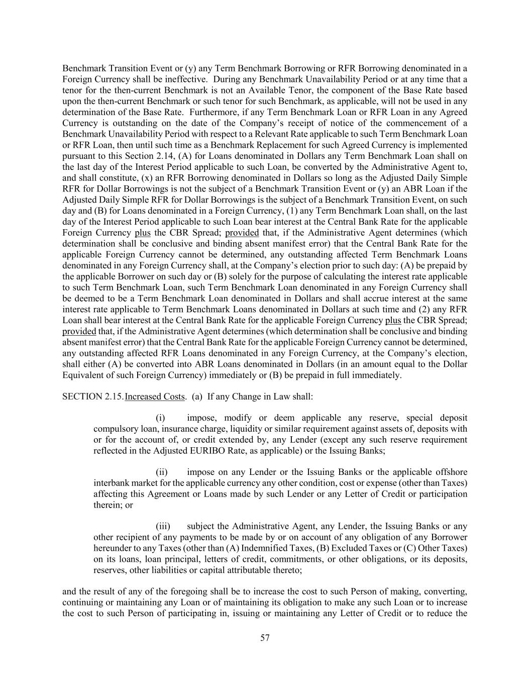 57 Benchmark Transition Event or (y) any Term Benchmark Borrowing or RFR Borrowing denominated in a Foreign Currency shall be ineffective. During any Benchmark Unavailability Period or at any time that a tenor for the then-current Benchmark is not an Available Tenor, the component of the Base Rate based upon the then-current Benchmark or such tenor for such Benchmark, as applicable, will not be used in any determination of the Base Rate. Furthermore, if any Term Benchmark Loan or RFR Loan in any Agreed Currency is outstanding on the date of the Company’s receipt of notice of the commencement of a Benchmark Unavailability Period with respect to a Relevant Rate applicable to such Term Benchmark Loan or RFR Loan, then until such time as a Benchmark Replacement for such Agreed Currency is implemented pursuant to this Section 2.14, (A) for Loans denominated in Dollars any Term Benchmark Loan shall on the last day of the Interest Period applicable to such Loan, be converted by the Administrative Agent to, and shall constitute, (x) an RFR Borrowing denominated in Dollars so long as the Adjusted Daily Simple RFR for Dollar Borrowings is not the subject of a Benchmark Transition Event or (y) an ABR Loan if the Adjusted Daily Simple RFR for Dollar Borrowings is the subject of a Benchmark Transition Event, on such day and (B) for Loans denominated in a Foreign Currency, (1) any Term Benchmark Loan shall, on the last day of the Interest Period applicable to such Loan bear interest at the Central Bank Rate for the applicable Foreign Currency plus the CBR Spread; provided that, if the Administrative Agent determines (which determination shall be conclusive and binding absent manifest error) that the Central Bank Rate for the applicable Foreign Currency cannot be determined, any outstanding affected Term Benchmark Loans denominated in any Foreign Currency shall, at the Company’s election prior to such day: (A) be prepaid by the applicable Borrower on such day or (B) solely for the purpose of calculating the interest rate applicable to such Term Benchmark Loan, such Term Benchmark Loan denominated in any Foreign Currency shall be deemed to be a Term Benchmark Loan denominated in Dollars and shall accrue interest at the same interest rate applicable to Term Benchmark Loans denominated in Dollars at such time and (2) any RFR Loan shall bear interest at the Central Bank Rate for the applicable Foreign Currency plus the CBR Spread; provided that, if the Administrative Agent determines (which determination shall be conclusive and binding absent manifest error) that the Central Bank Rate for the applicable Foreign Currency cannot be determined, any outstanding affected RFR Loans denominated in any Foreign Currency, at the Company’s election, shall either (A) be converted into ABR Loans denominated in Dollars (in an amount equal to the Dollar Equivalent of such Foreign Currency) immediately or (B) be prepaid in full immediately. Increased Costs. (a) If any Change in Law shall: (i) impose, modify or deem applicable any reserve, special deposit compulsory loan, insurance charge, liquidity or similar requirement against assets of, deposits with or for the account of, or credit extended by, any Lender (except any such reserve requirement reflected in the Adjusted EURIBO Rate, as applicable) or the Issuing Banks; (ii) impose on any Lender or the Issuing Banks or the applicable offshore interbank market for the applicable currency any other condition, cost or expense (other than Taxes) affecting this Agreement or Loans made by such Lender or any Letter of Credit or participation therein; or (iii) subject the Administrative Agent, any Lender, the Issuing Banks or any other recipient of any payments to be made by or on account of any obligation of any Borrower hereunder to any Taxes (other than (A) Indemnified Taxes, (B) Excluded Taxes or (C) Other Taxes) on its loans, loan principal, letters of credit, commitments, or other obligations, or its deposits, reserves, other liabilities or capital attributable thereto; and the result of any of the foregoing shall be to increase the cost to such Person of making, converting, continuing or maintaining any Loan or of maintaining its obligation to make any such Loan or to increase the cost to such Person of participating in, issuing or maintaining any Letter of Credit or to reduce the