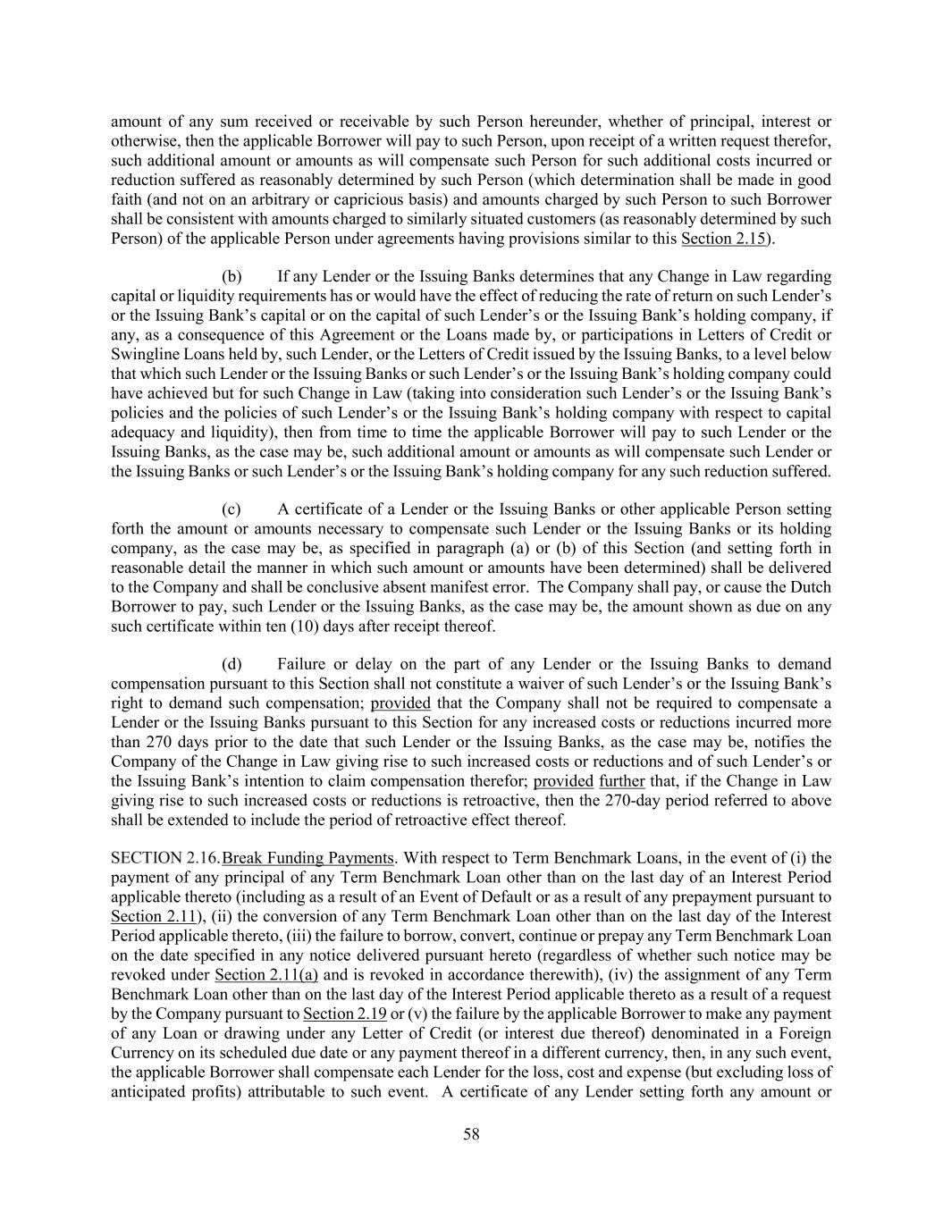 58 amount of any sum received or receivable by such Person hereunder, whether of principal, interest or otherwise, then the applicable Borrower will pay to such Person, upon receipt of a written request therefor, such additional amount or amounts as will compensate such Person for such additional costs incurred or reduction suffered as reasonably determined by such Person (which determination shall be made in good faith (and not on an arbitrary or capricious basis) and amounts charged by such Person to such Borrower shall be consistent with amounts charged to similarly situated customers (as reasonably determined by such Person) of the applicable Person under agreements having provisions similar to this Section 2.15). (b) If any Lender or the Issuing Banks determines that any Change in Law regarding capital or liquidity requirements has or would have the effect of reducing the rate of return on such Lender’s or the Issuing Bank’s capital or on the capital of such Lender’s or the Issuing Bank’s holding company, if any, as a consequence of this Agreement or the Loans made by, or participations in Letters of Credit or Swingline Loans held by, such Lender, or the Letters of Credit issued by the Issuing Banks, to a level below that which such Lender or the Issuing Banks or such Lender’s or the Issuing Bank’s holding company could have achieved but for such Change in Law (taking into consideration such Lender’s or the Issuing Bank’s policies and the policies of such Lender’s or the Issuing Bank’s holding company with respect to capital adequacy and liquidity), then from time to time the applicable Borrower will pay to such Lender or the Issuing Banks, as the case may be, such additional amount or amounts as will compensate such Lender or the Issuing Banks or such Lender’s or the Issuing Bank’s holding company for any such reduction suffered. (c) A certificate of a Lender or the Issuing Banks or other applicable Person setting forth the amount or amounts necessary to compensate such Lender or the Issuing Banks or its holding company, as the case may be, as specified in paragraph (a) or (b) of this Section (and setting forth in reasonable detail the manner in which such amount or amounts have been determined) shall be delivered to the Company and shall be conclusive absent manifest error. The Company shall pay, or cause the Dutch Borrower to pay, such Lender or the Issuing Banks, as the case may be, the amount shown as due on any such certificate within ten (10) days after receipt thereof. (d) Failure or delay on the part of any Lender or the Issuing Banks to demand compensation pursuant to this Section shall not constitute a waiver of such Lender’s or the Issuing Bank’s right to demand such compensation; provided that the Company shall not be required to compensate a Lender or the Issuing Banks pursuant to this Section for any increased costs or reductions incurred more than 270 days prior to the date that such Lender or the Issuing Banks, as the case may be, notifies the Company of the Change in Law giving rise to such increased costs or reductions and of such Lender’s or the Issuing Bank’s intention to claim compensation therefor; provided further that, if the Change in Law giving rise to such increased costs or reductions is retroactive, then the 270-day period referred to above shall be extended to include the period of retroactive effect thereof. Break Funding Payments. With respect to Term Benchmark Loans, in the event of (i) the payment of any principal of any Term Benchmark Loan other than on the last day of an Interest Period applicable thereto (including as a result of an Event of Default or as a result of any prepayment pursuant to Section 2.11), (ii) the conversion of any Term Benchmark Loan other than on the last day of the Interest Period applicable thereto, (iii) the failure to borrow, convert, continue or prepay any Term Benchmark Loan on the date specified in any notice delivered pursuant hereto (regardless of whether such notice may be revoked under Section 2.11(a) and is revoked in accordance therewith), (iv) the assignment of any Term Benchmark Loan other than on the last day of the Interest Period applicable thereto as a result of a request by the Company pursuant to Section 2.19 or (v) the failure by the applicable Borrower to make any payment of any Loan or drawing under any Letter of Credit (or interest due thereof) denominated in a Foreign Currency on its scheduled due date or any payment thereof in a different currency, then, in any such event, the applicable Borrower shall compensate each Lender for the loss, cost and expense (but excluding loss of anticipated profits) attributable to such event. A certificate of any Lender setting forth any amount or
